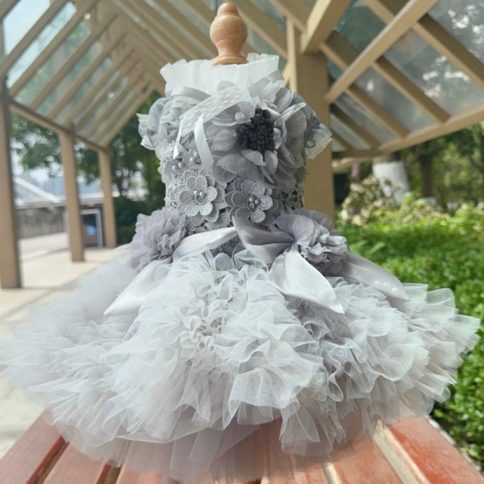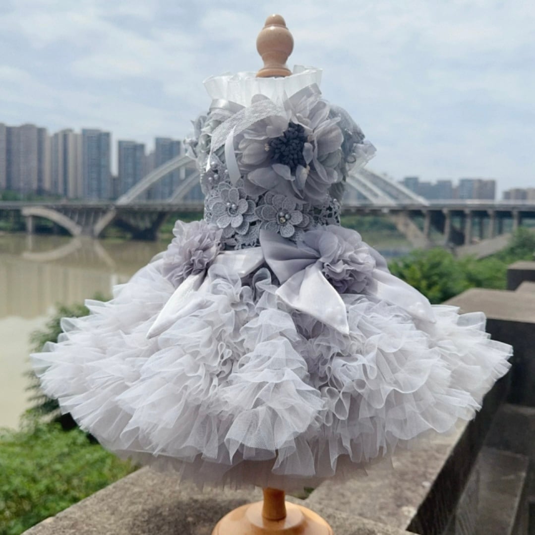 ハイネックのフラワーモチーフのドレス。