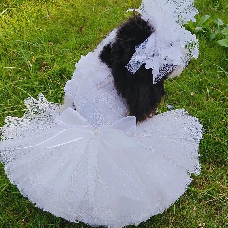 フラワーモチーフが繊細に施されたレース生地のトップスと、たっぷりと広がるチュールスカートが美しいAラインシルエットのワンピースです。