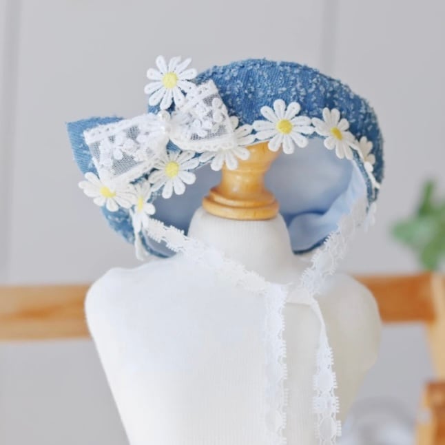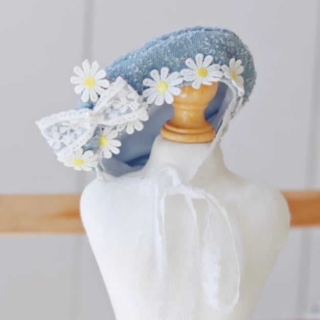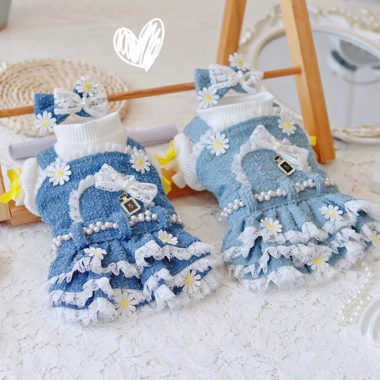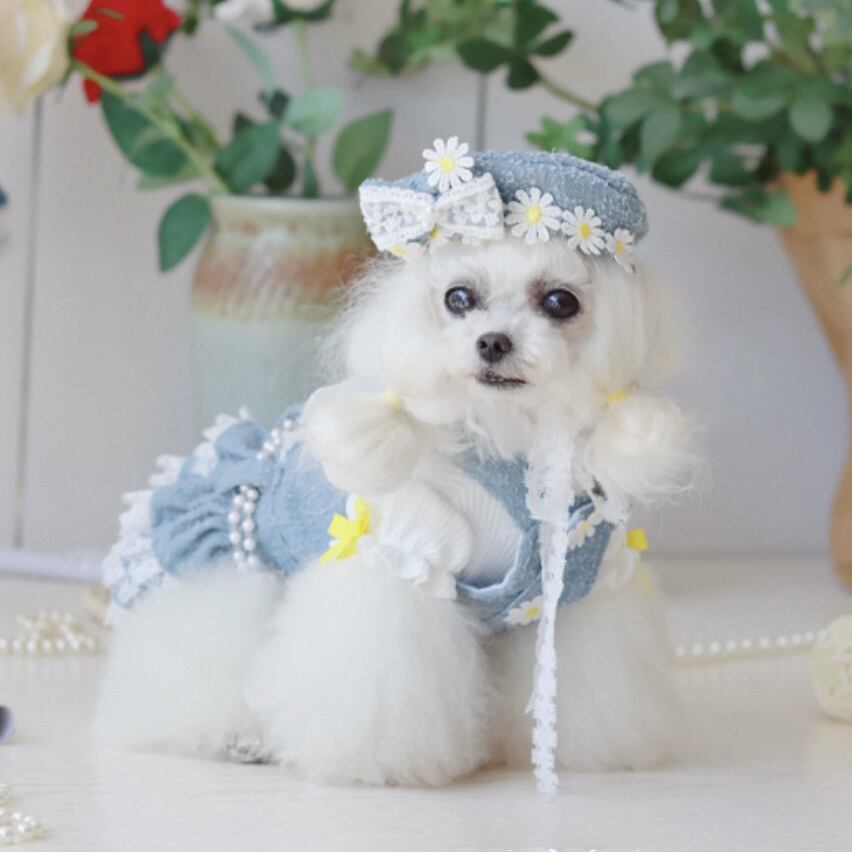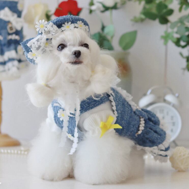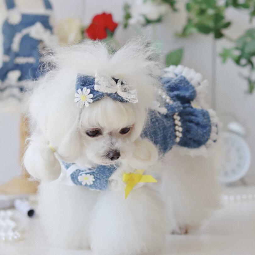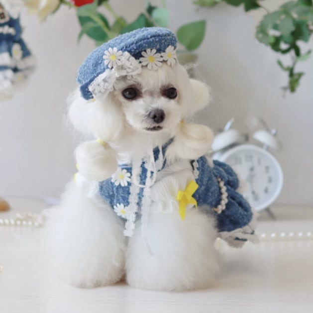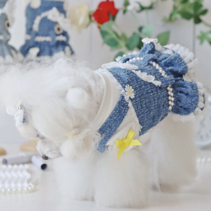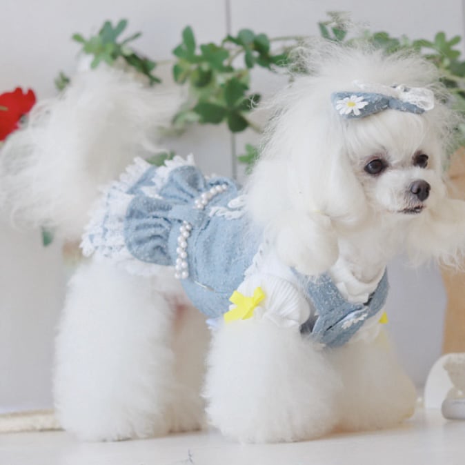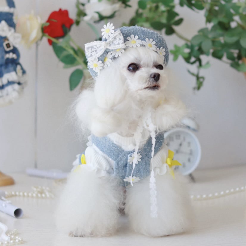 デニム生地に可憐なデイジーと繊細なレースを組み合わせた、愛らしいペット用ワンピースです。