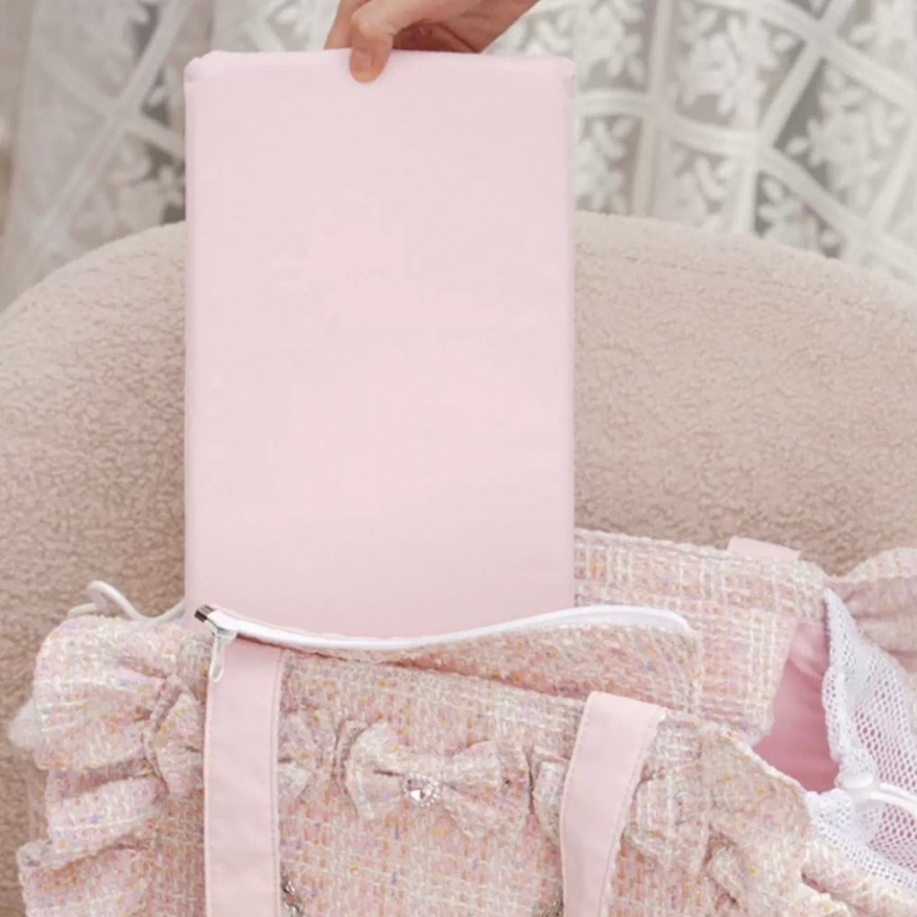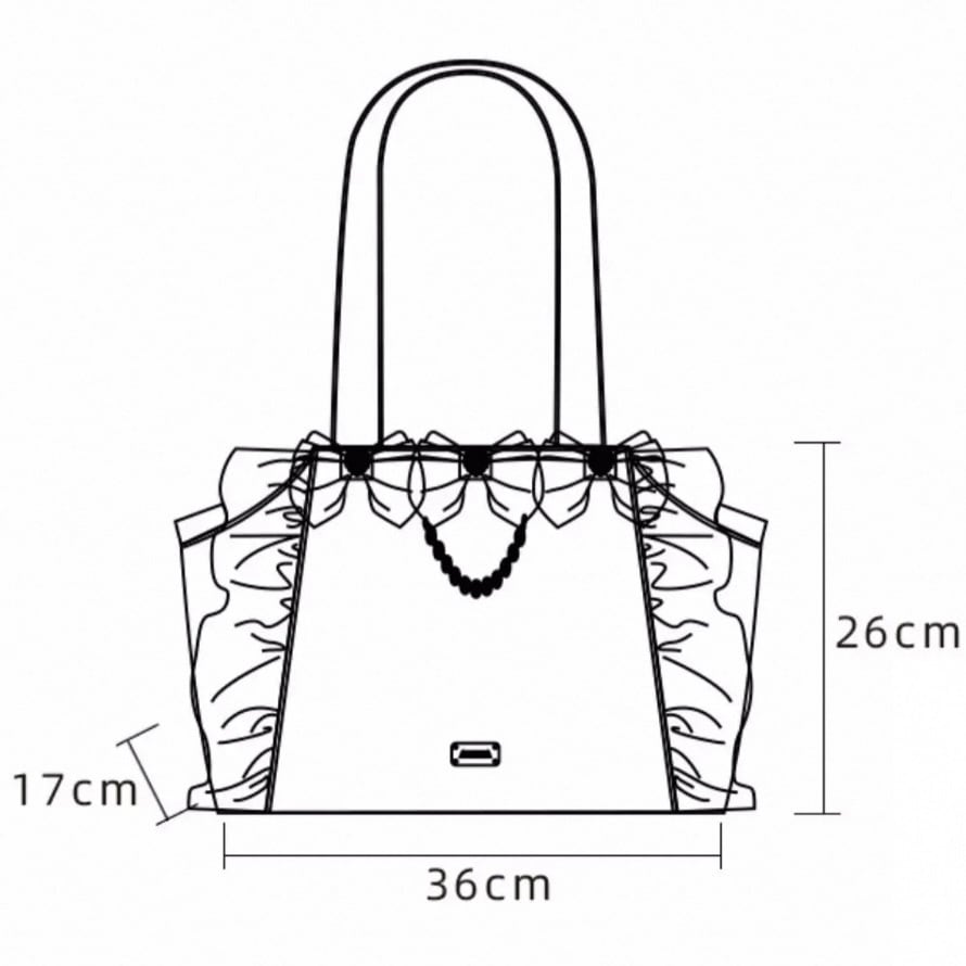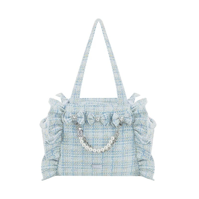 優美なフリルとパールが輝く、ツイード素材のトートバッグ。