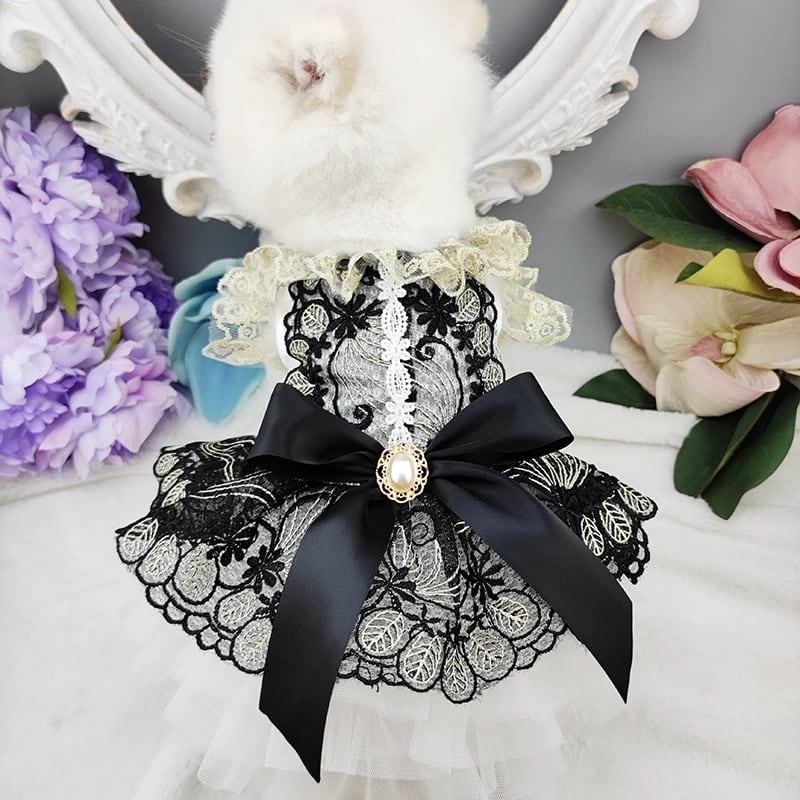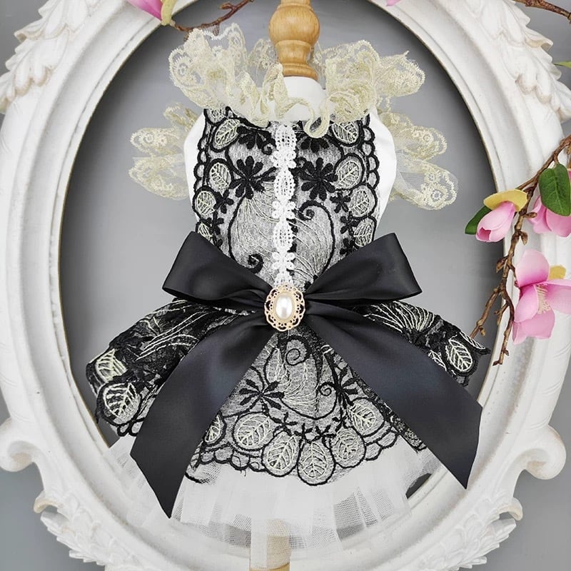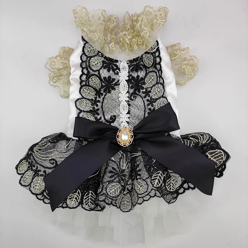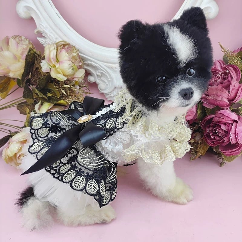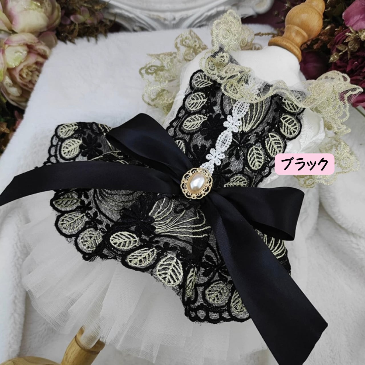 チュールレースとエンブロイダリーの美しい組み合わせが、愛犬をさらに魅力的に演出します。繊細なレースの襟と、上品なブラックとゴールドの刺繍が、華やかでゴージャスな印象を与えます。大きな黒のリボンがアクセントとなり、特別な日の装いにぴったりです。お洋服を着た愛犬で、注目を集めること間違いなしです。