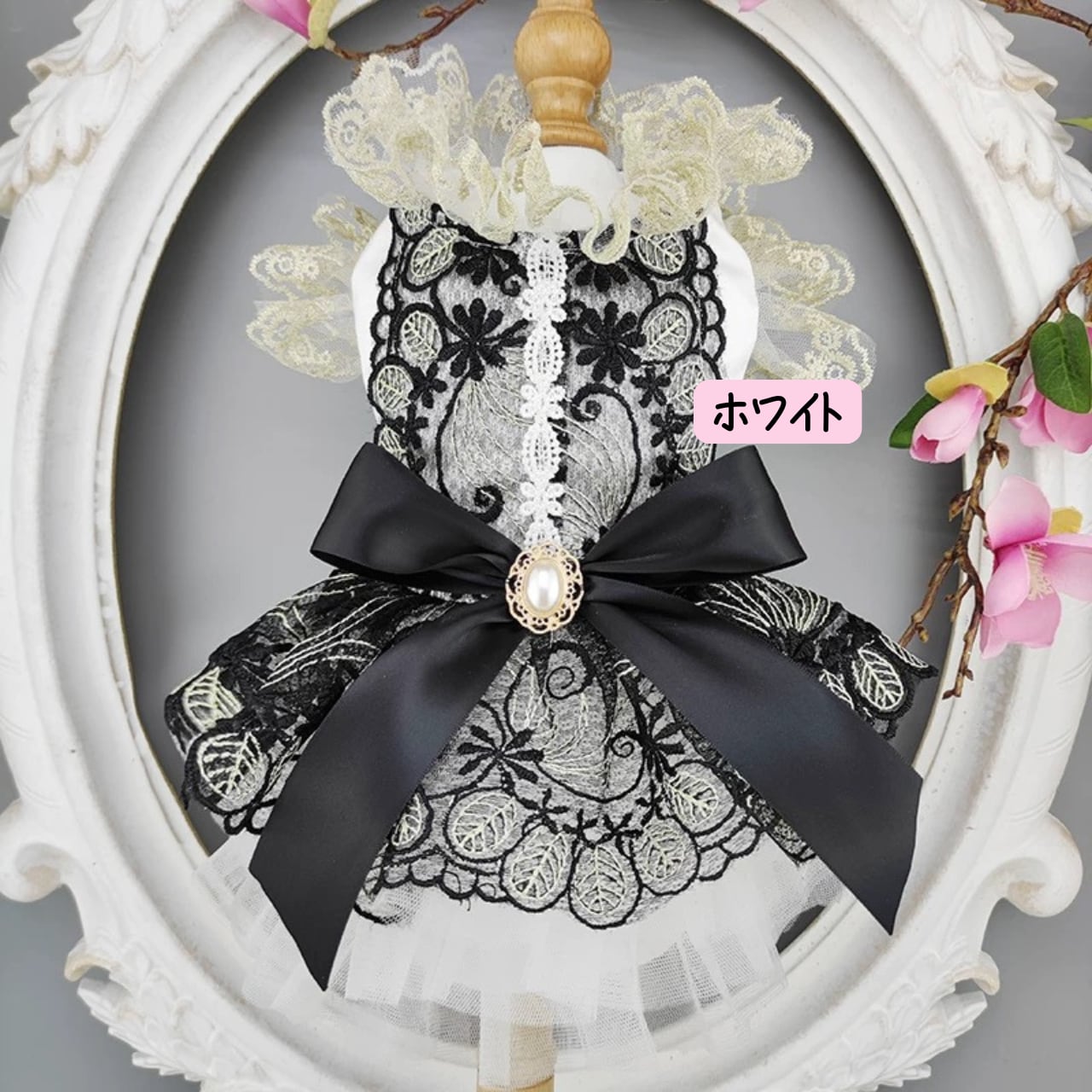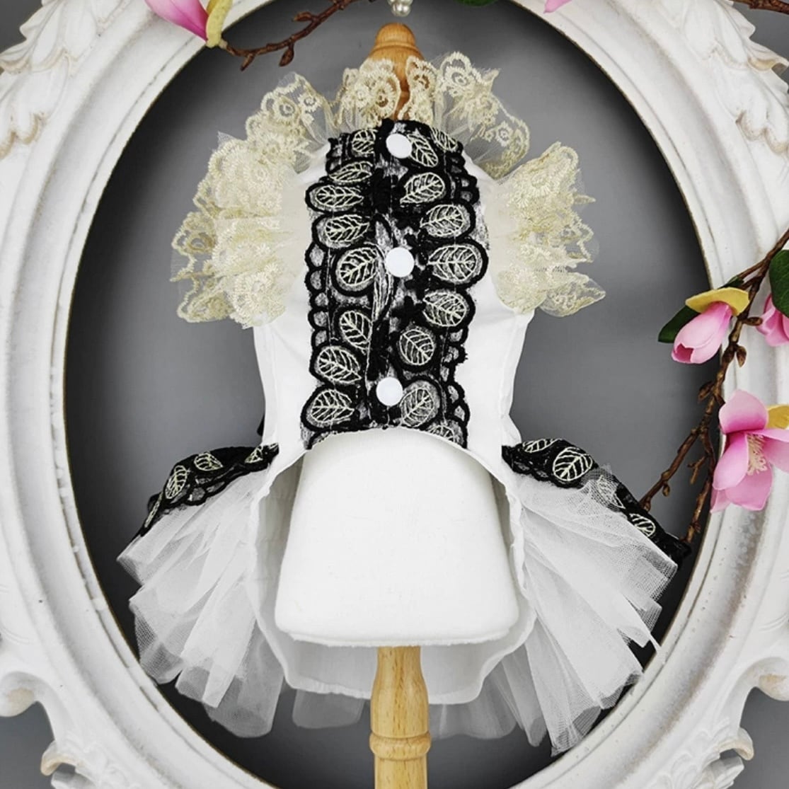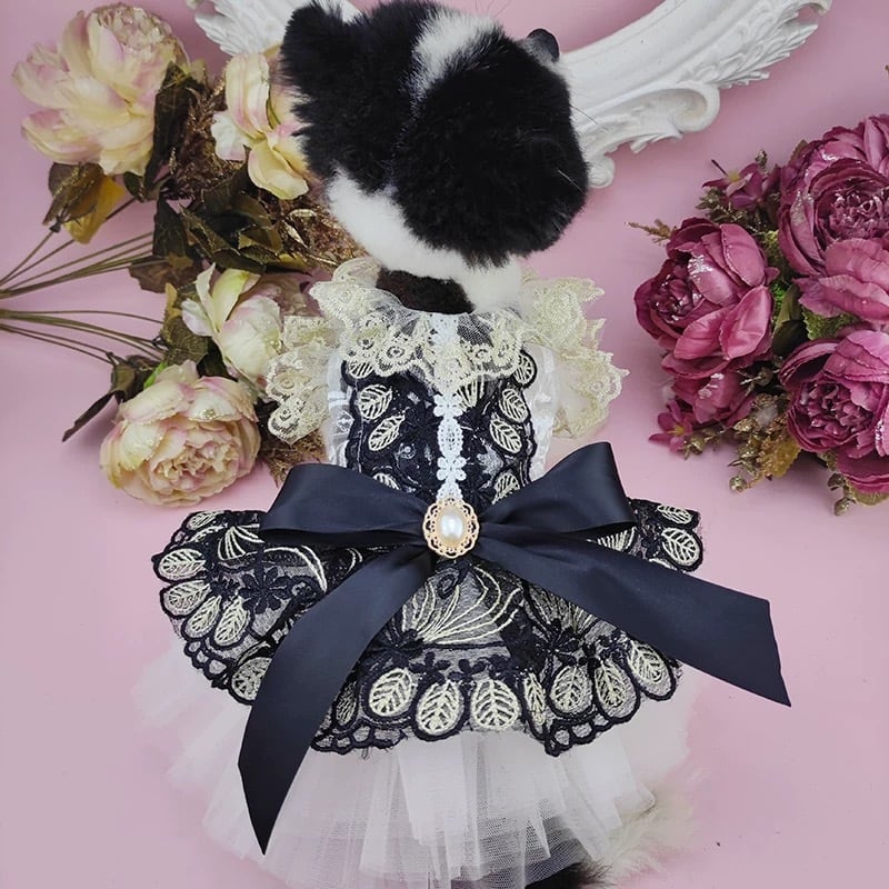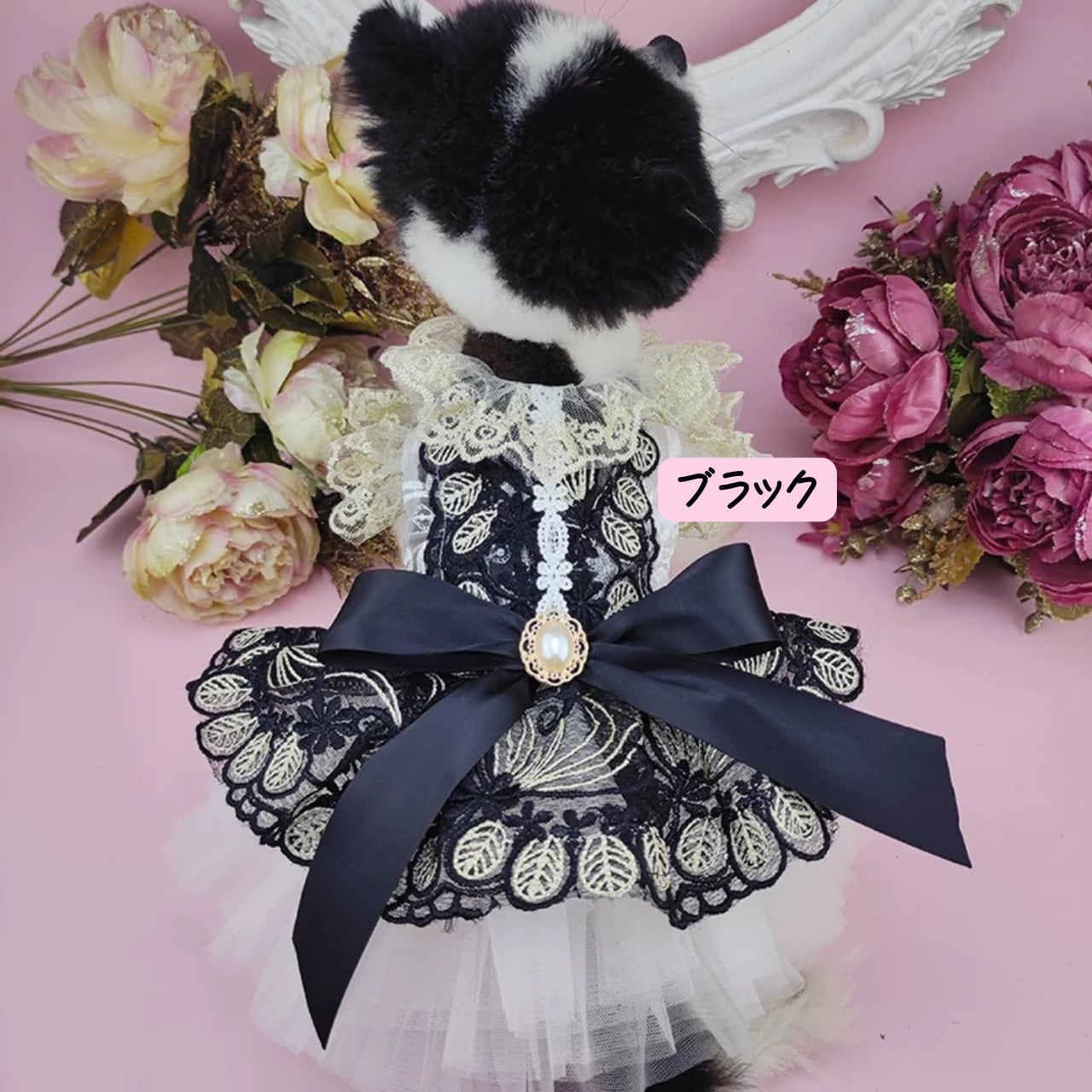 チュールレースとエンブロイダリーの美しい組み合わせが、愛犬をさらに魅力的に演出します。繊細なレースの襟と、上品なブラックとゴールドの刺繍が、華やかでゴージャスな印象を与えます。大きな黒のリボンがアクセントとなり、特別な日の装いにぴったりです。お洋服を着た愛犬で、注目を集めること間違いなしです。