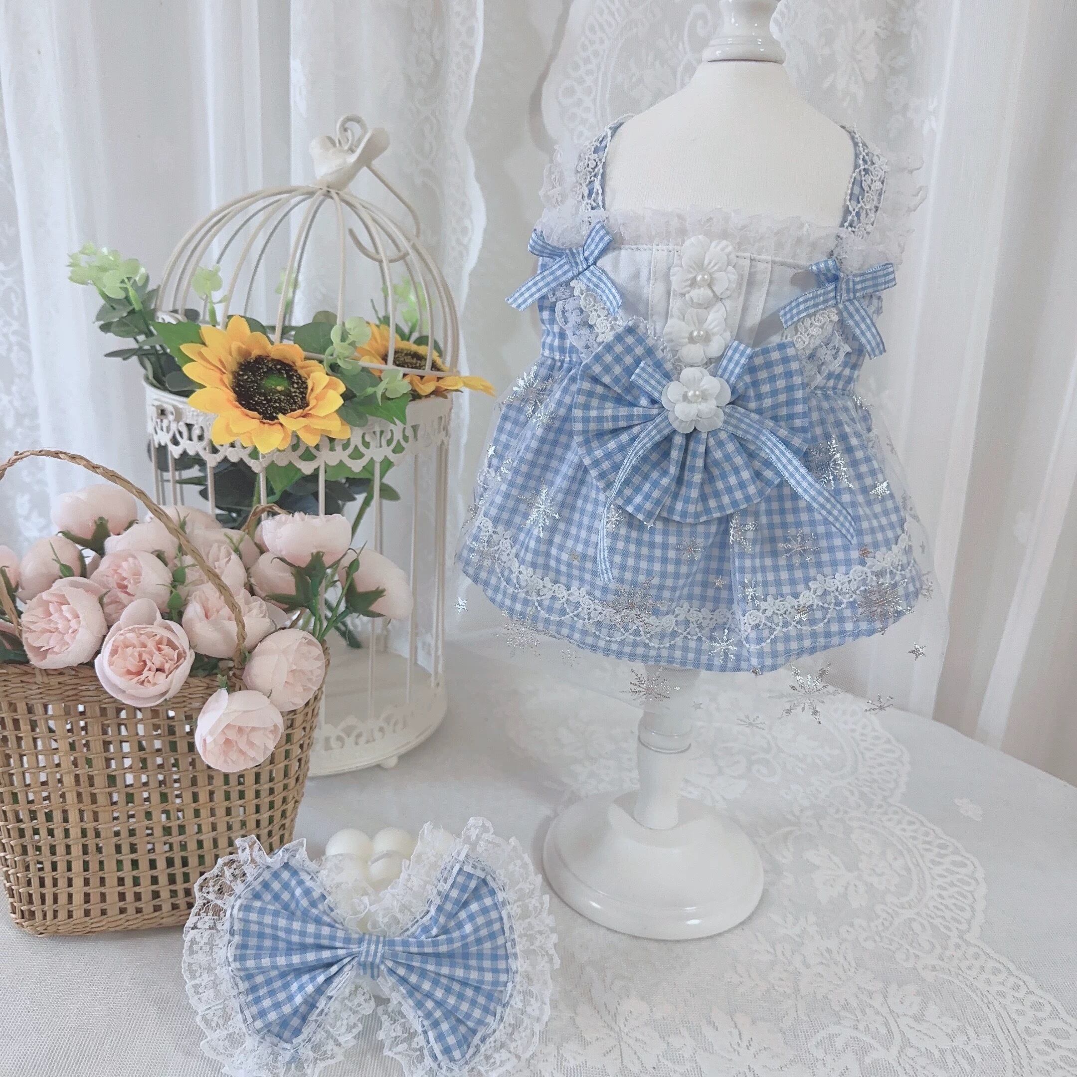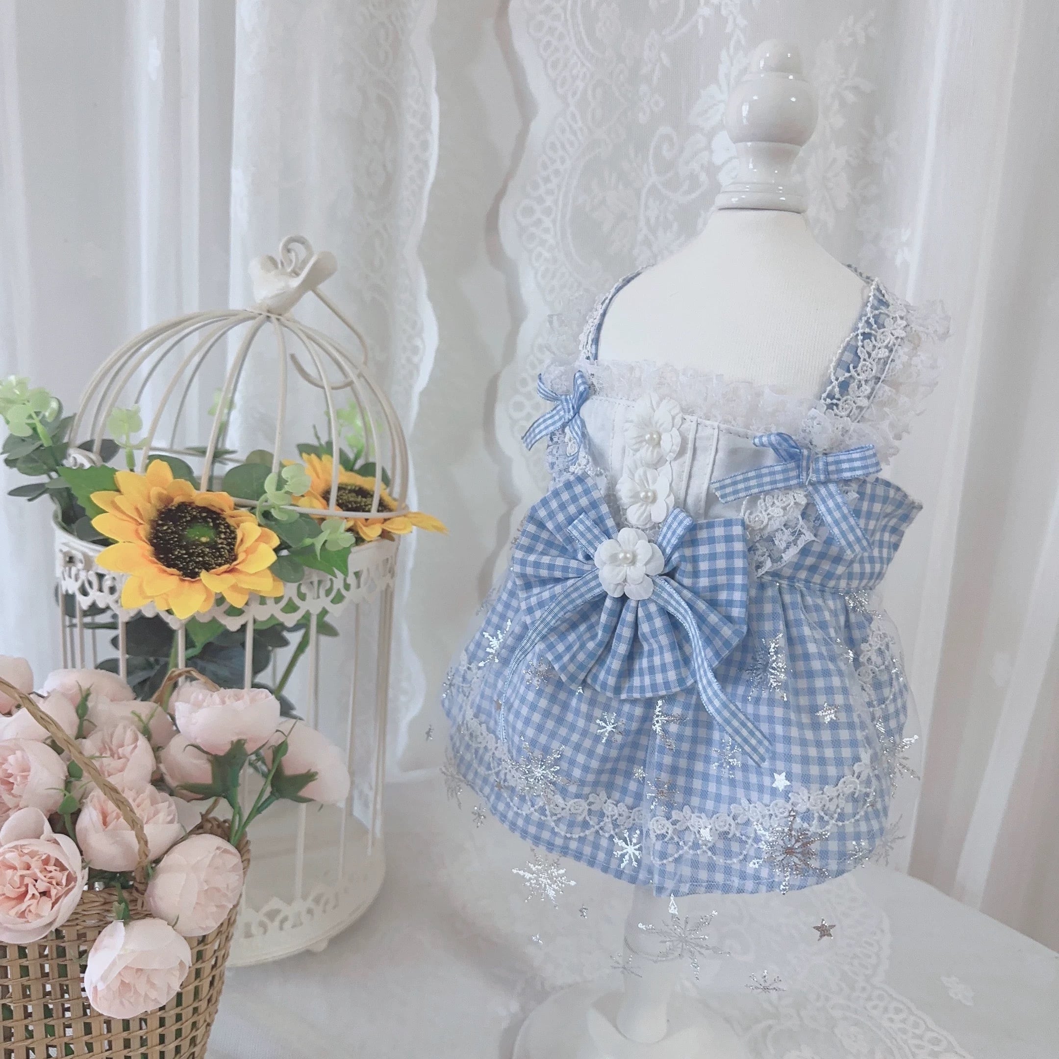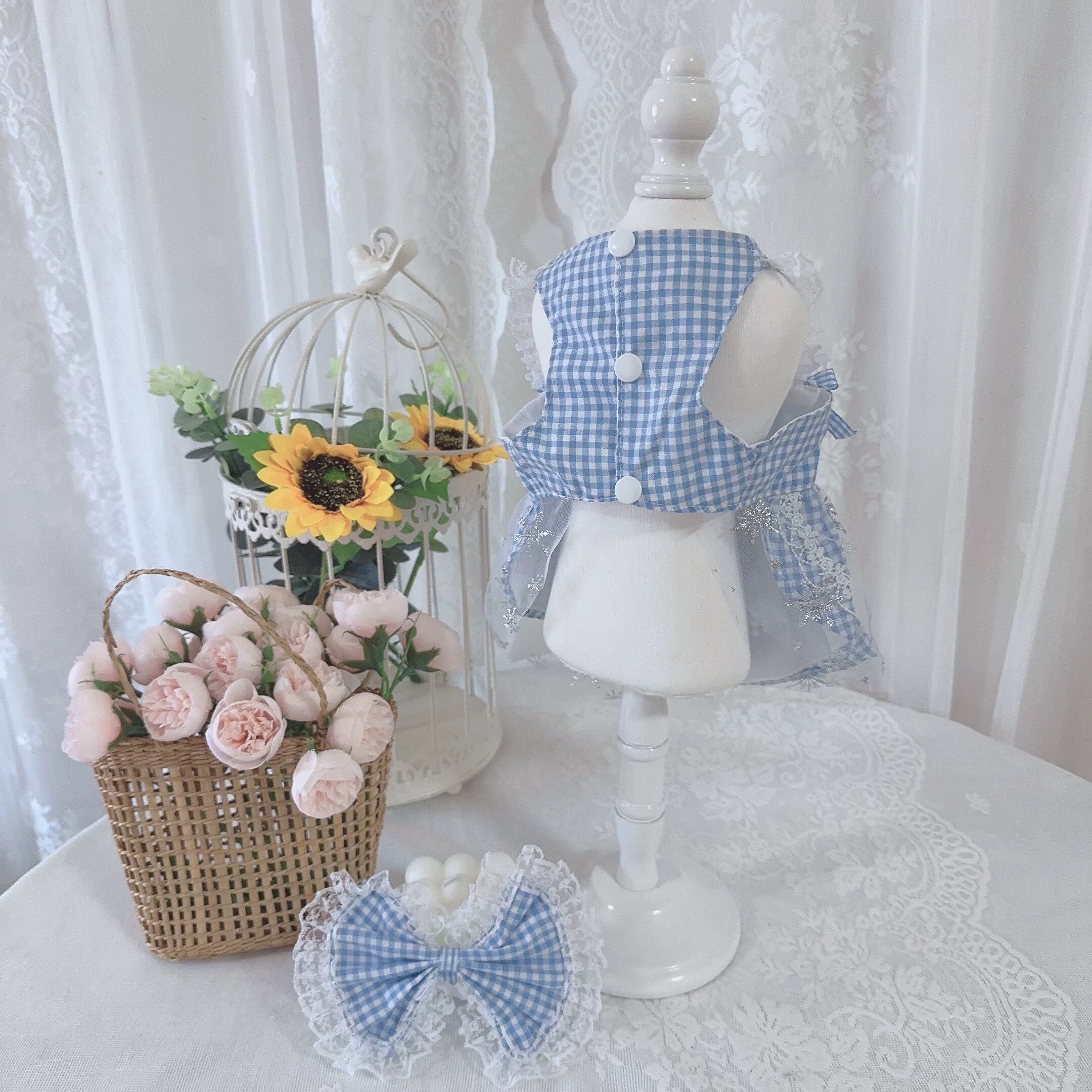 ブルーギンガムチェックに3つ並んだフラワーモチーフがワンポイントのワンピースです。