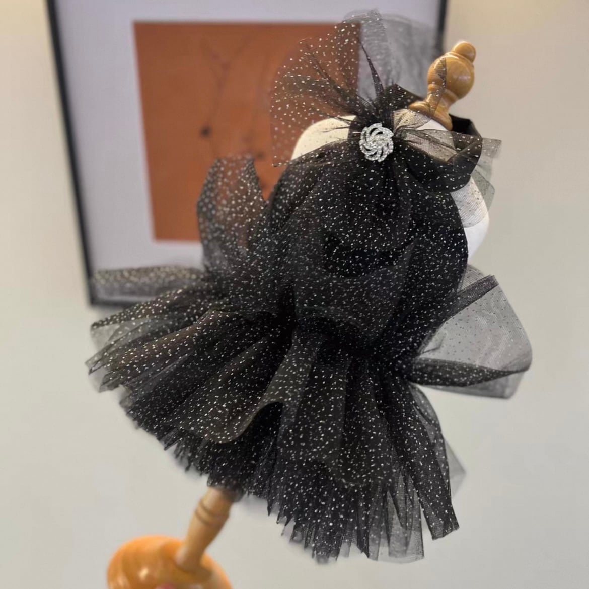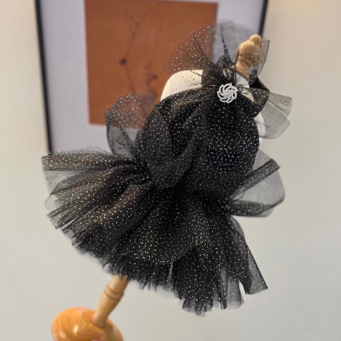 ブラックのチュール素材が織りなす、美しく繊細なフレアスカートです。きらめくアクセントが、華やかさを添えています。バックレスデザインが、さりげない肌見せを叶え、洗練されたスタイルを演出します。特別な日の装いを格上げする、ワンランク上のアイテムです。パーティーやイベントなど、華やかなシーンに最適です。