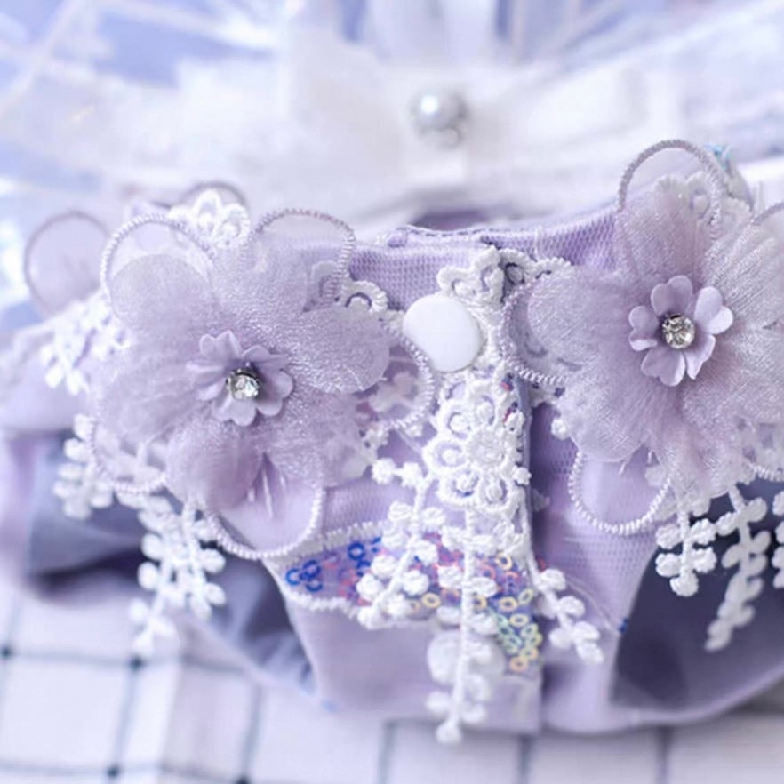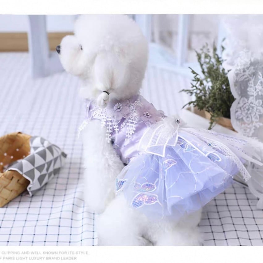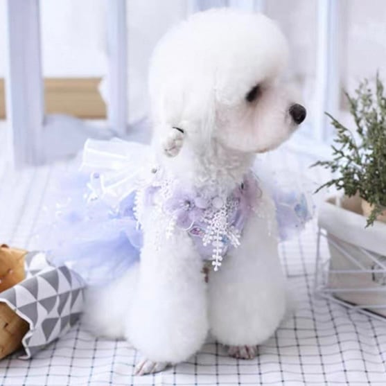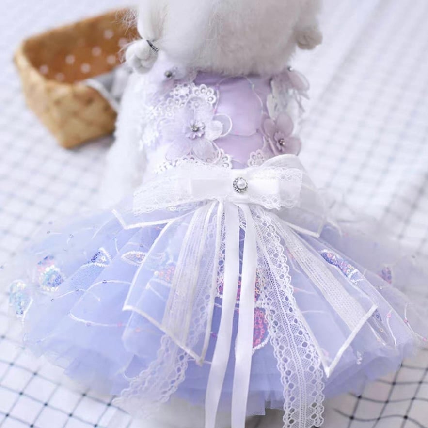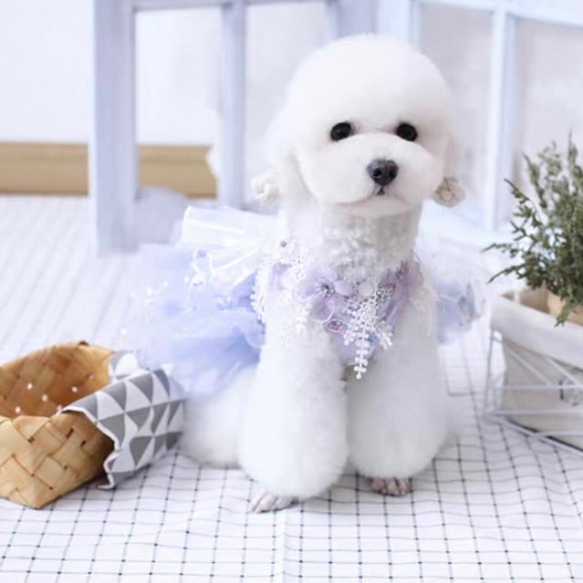 レース装飾が華やかなAラインシルエットのチュールスカート。フラワーモチーフが散りばめられ、愛犬をより一層美しく引き立てます。ワンランク上のドレスアップで、特別な日をさらに思い出深いものにしてください。お散歩やパーティーなど、様々なシーンでご活用いただけます。