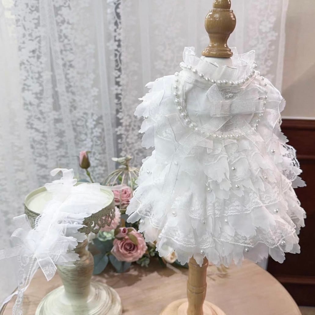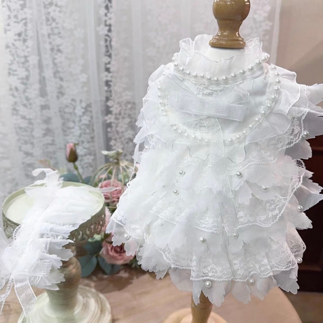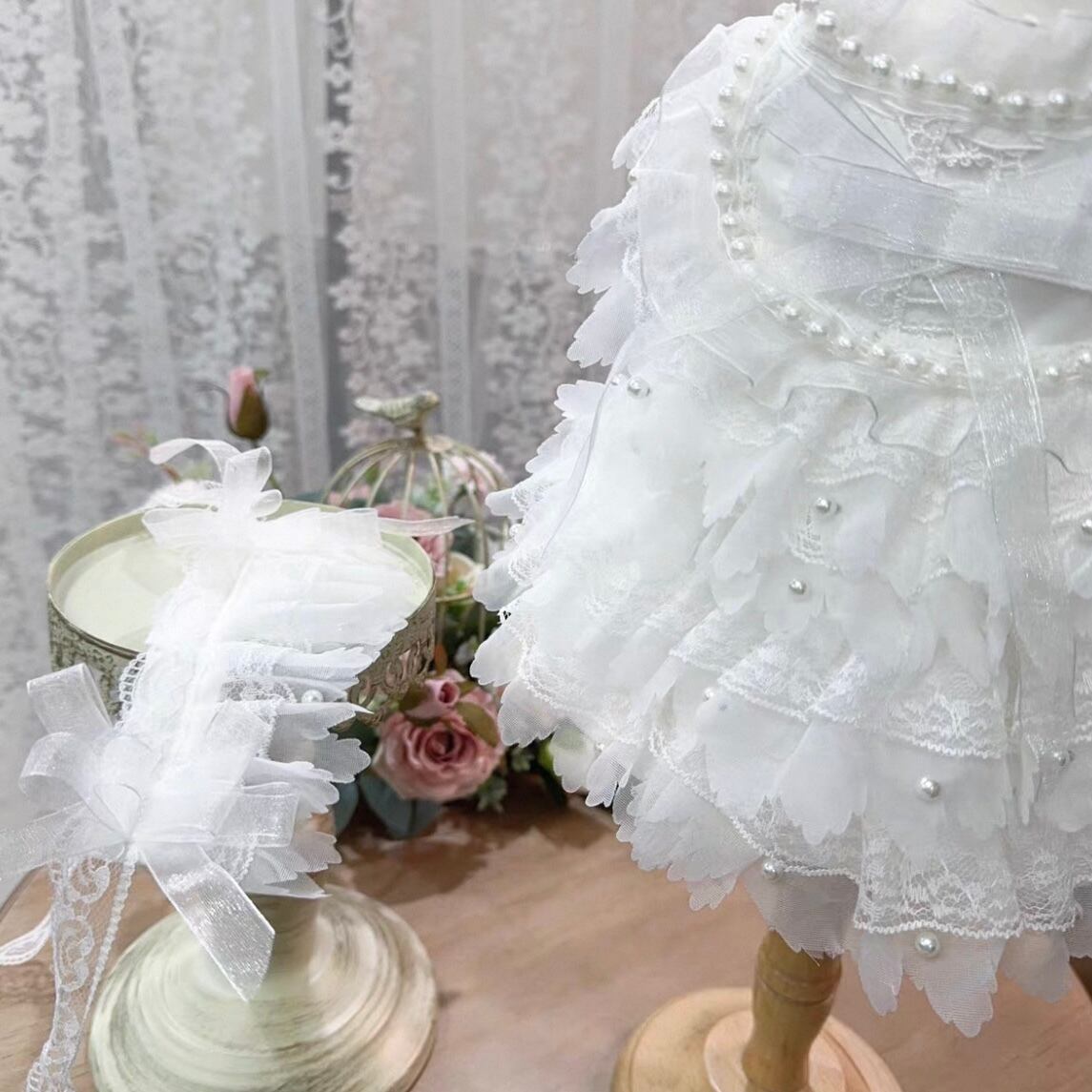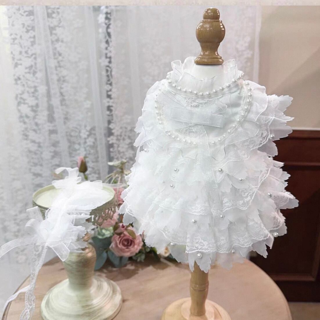 幾重にも重なったフリルと繊細なレースが、上品でロマンティックな雰囲気を醸し出すワンピースです。首元を飾るパールとリボンが、華やかさを添え、特別な日の装いをより一層引き立てます。