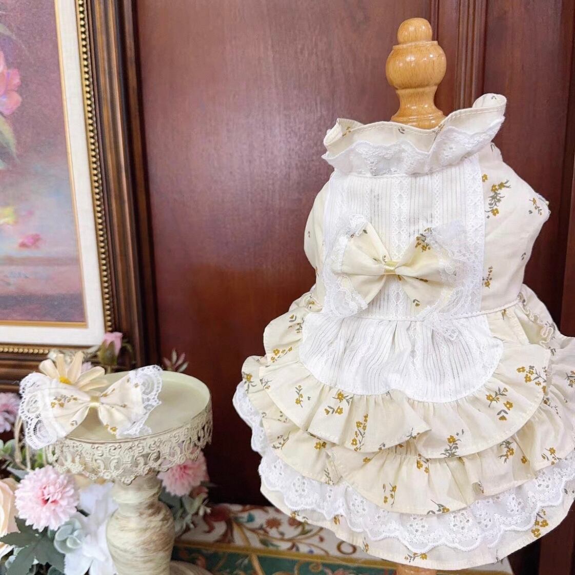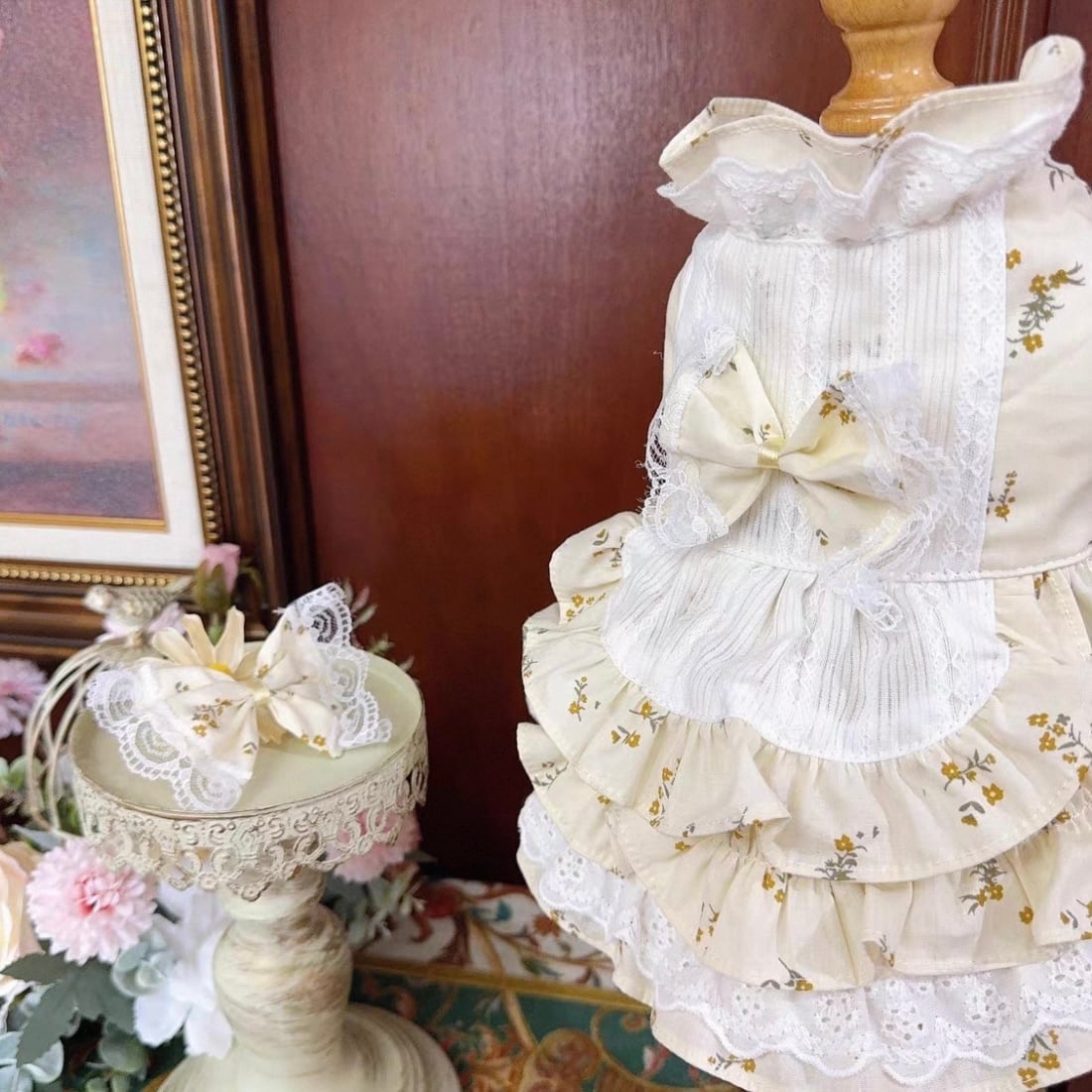 小花柄の生地と繊細なレースの組み合わせが、可愛らしさと上品さを兼ね備えています。