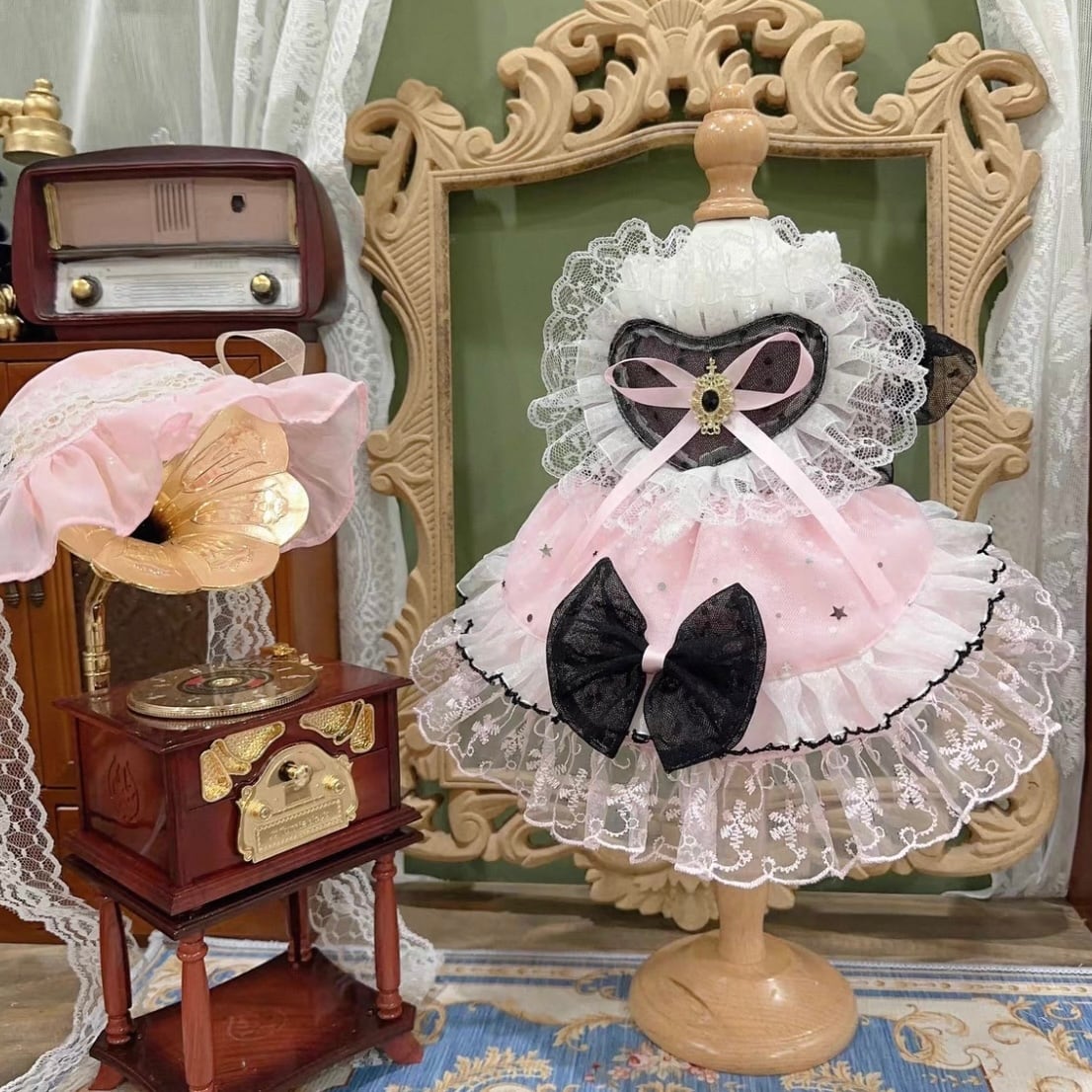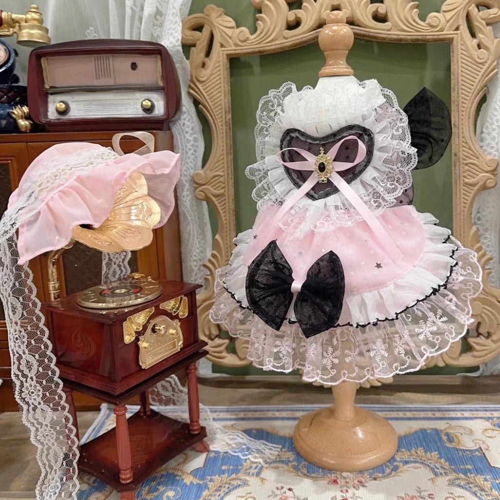 ハート型のモチーフがキュートなミニドレス。繊細なレース装飾とフリルが、愛らしさをさらに引き立てます。