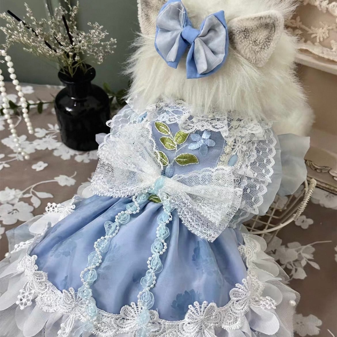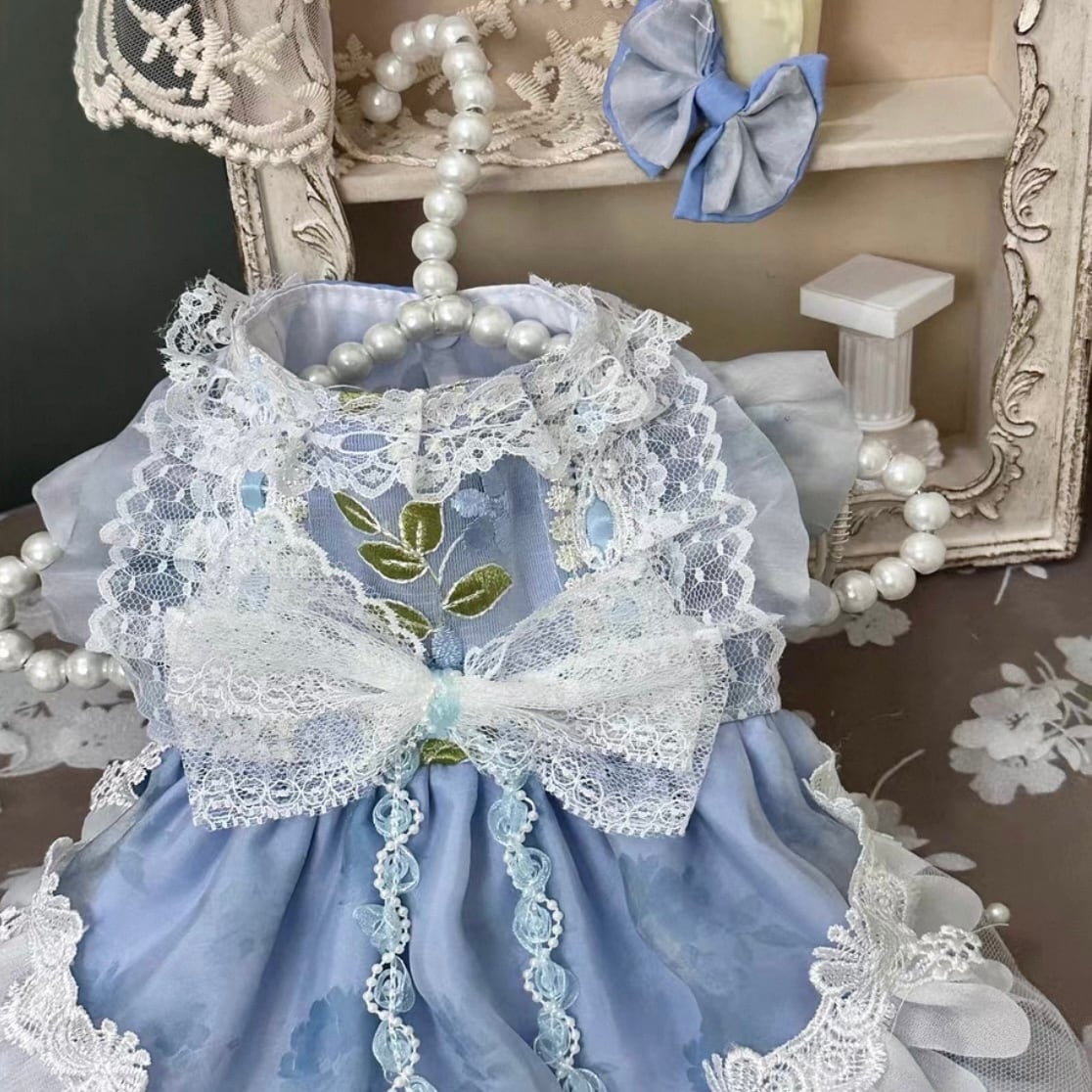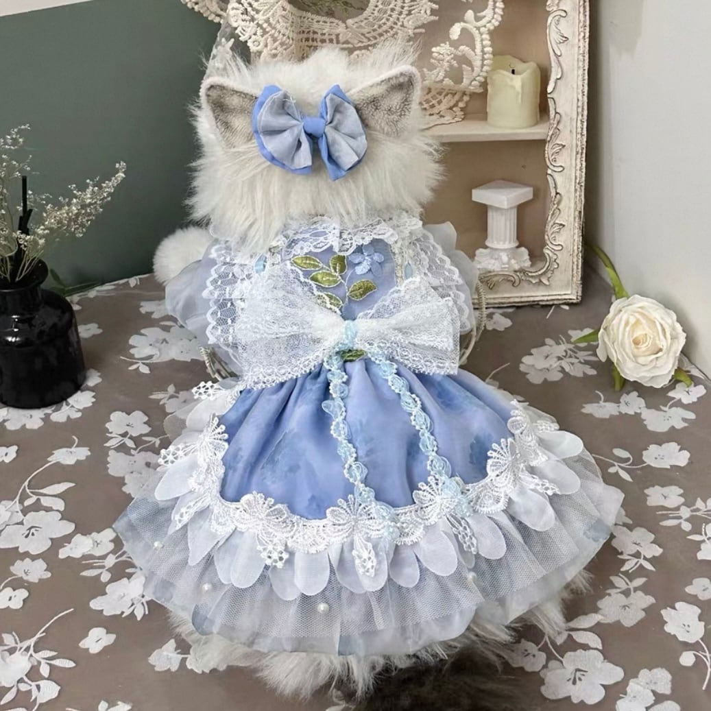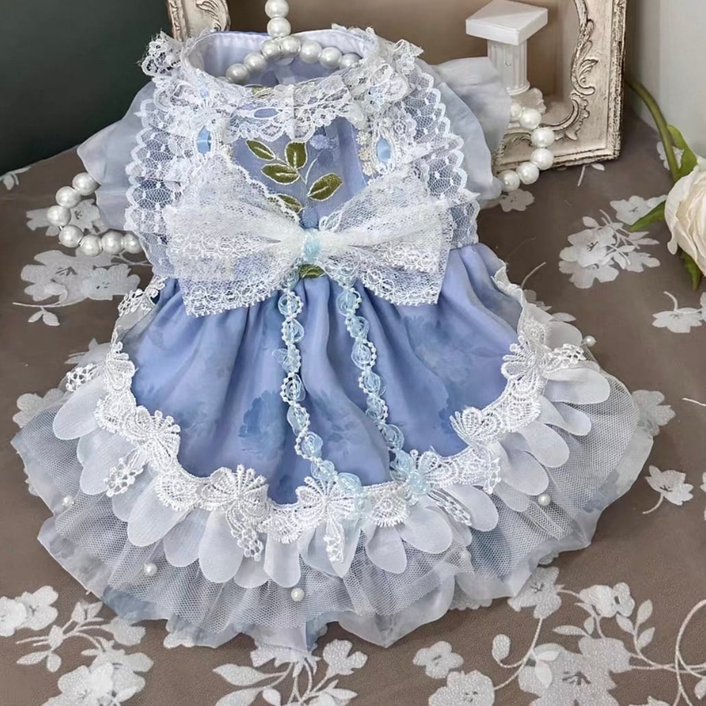 スタンドカラーと繊細なリボン飾りが、上品で可愛らしい印象を演出します。お散歩や特別な日のワンちゃんのお洋服として、ぜひお選びください。華やかなデザインは、周りの人たちを魅了すること間違いなしです。