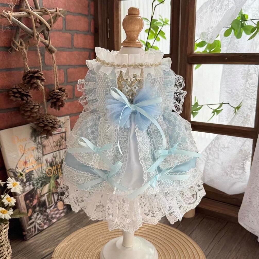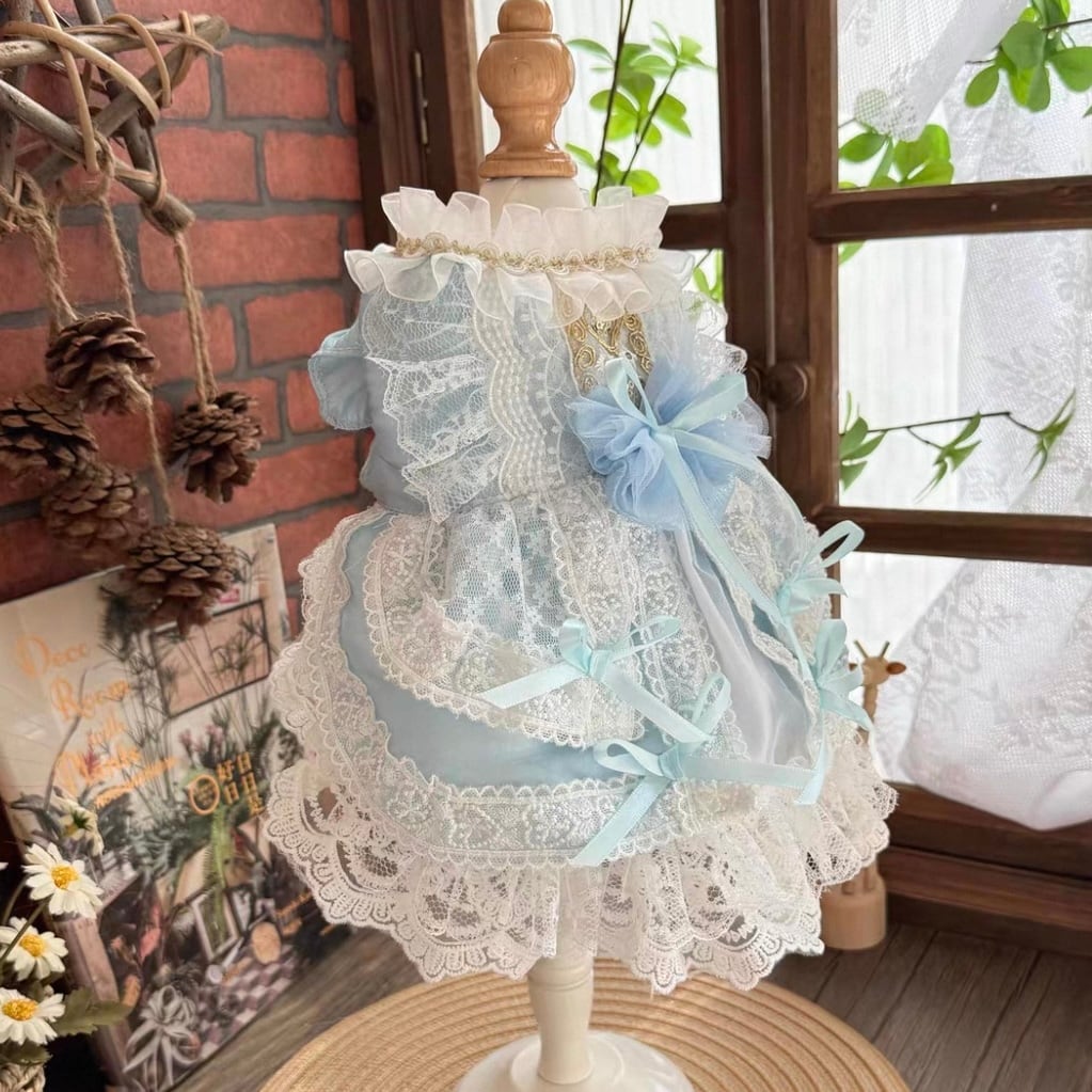 レース使いが上品なハイネックAラインワンピース。繊細なレースと、すっきりとしたハイネックデザインが、愛犬をより一層美しく引き立てます。後ろ姿も美しく見えるよう、細部までこだわって作られています。お散歩や特別なイベントなど、様々なシーンで活躍すること間違いなしです。