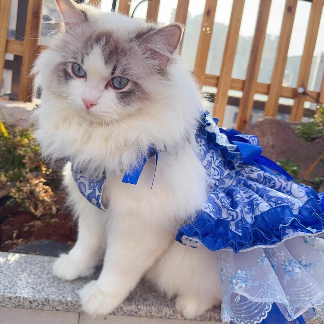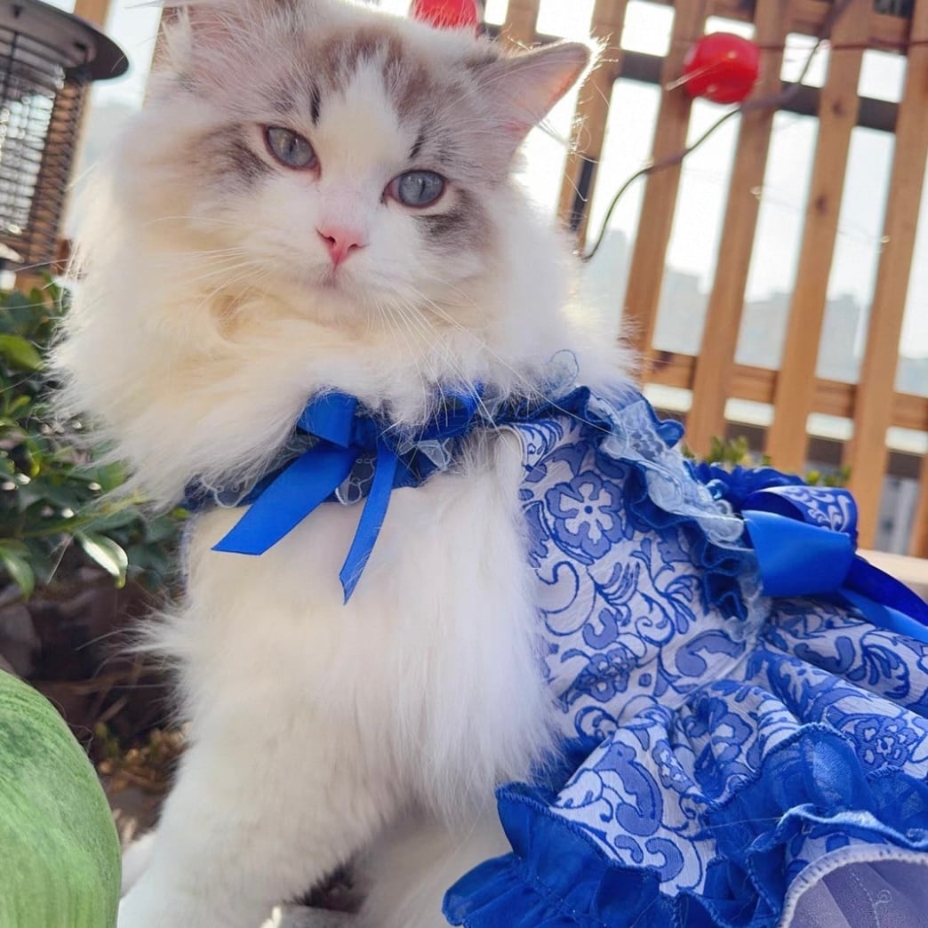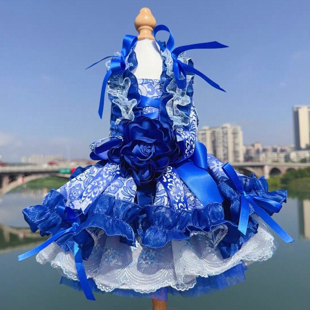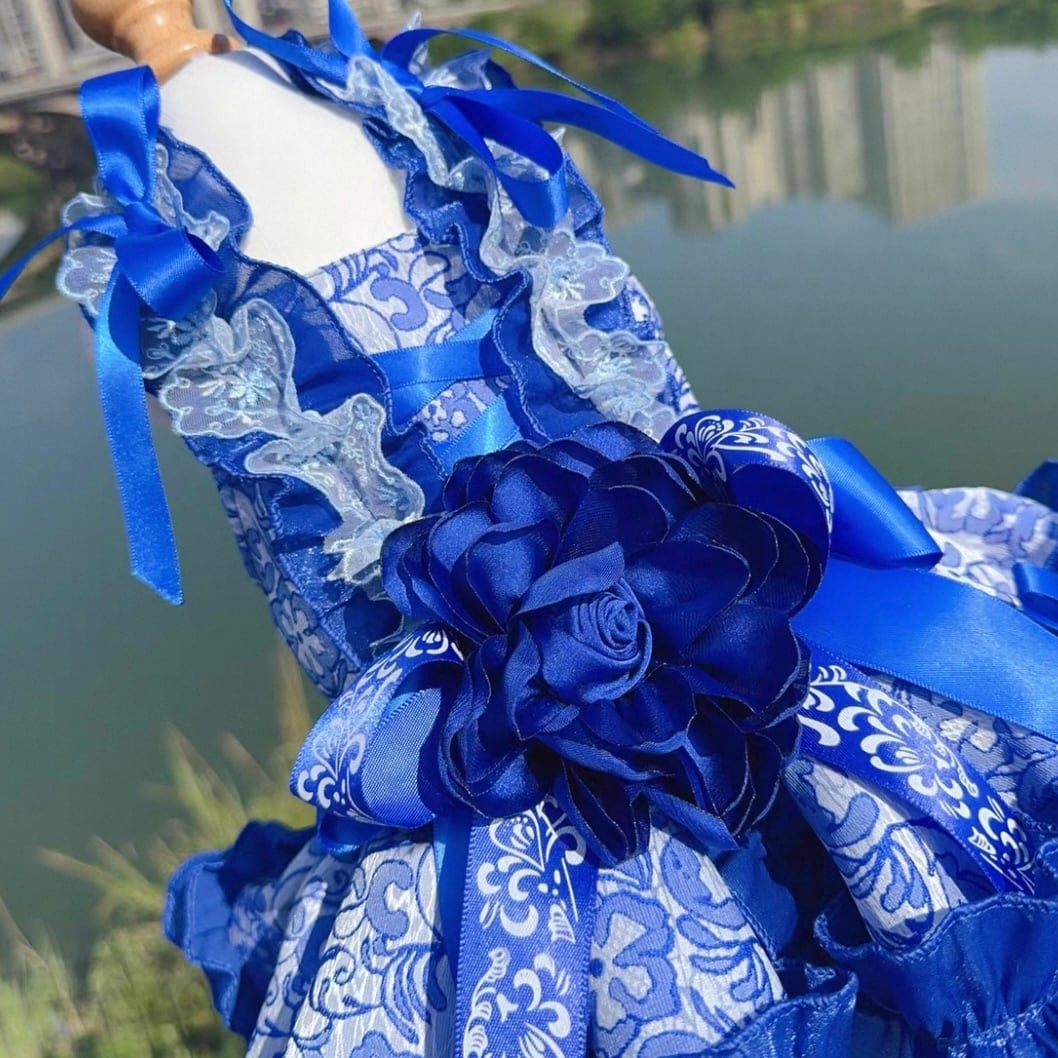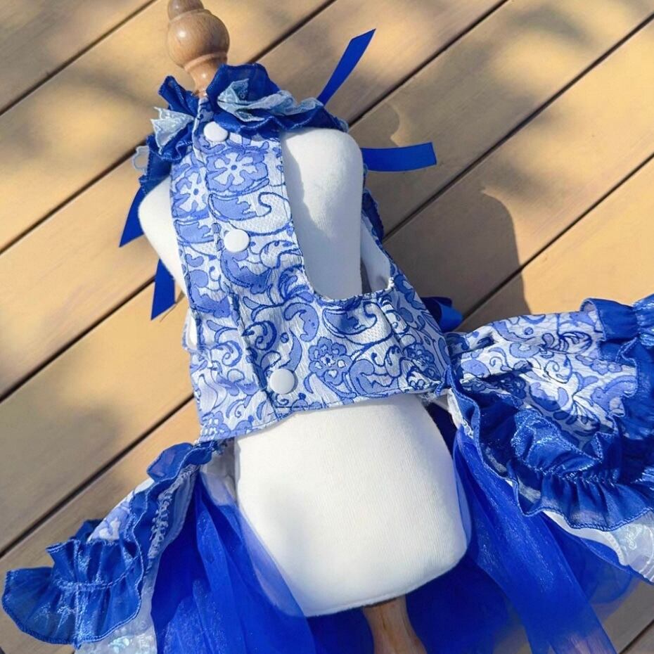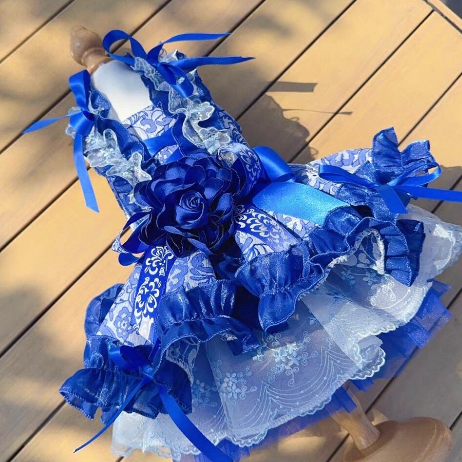 上身頃には鮮やかなブルーのリボンとフリルを贅沢にあしらい、裾へと広がるスカートは透明感あふれるチュールに青い花模様が舞うようにデザインされています。