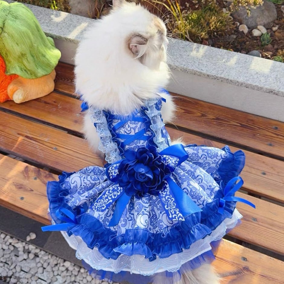まるで青と白の花々が咲き誇る庭園から抜け出してきたような、ロマンチックなドレス。