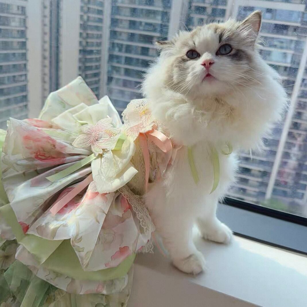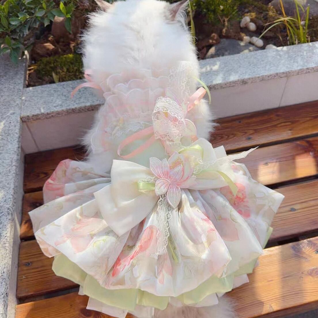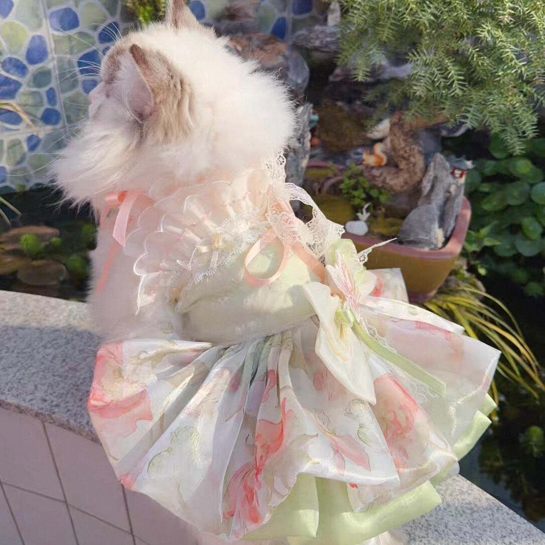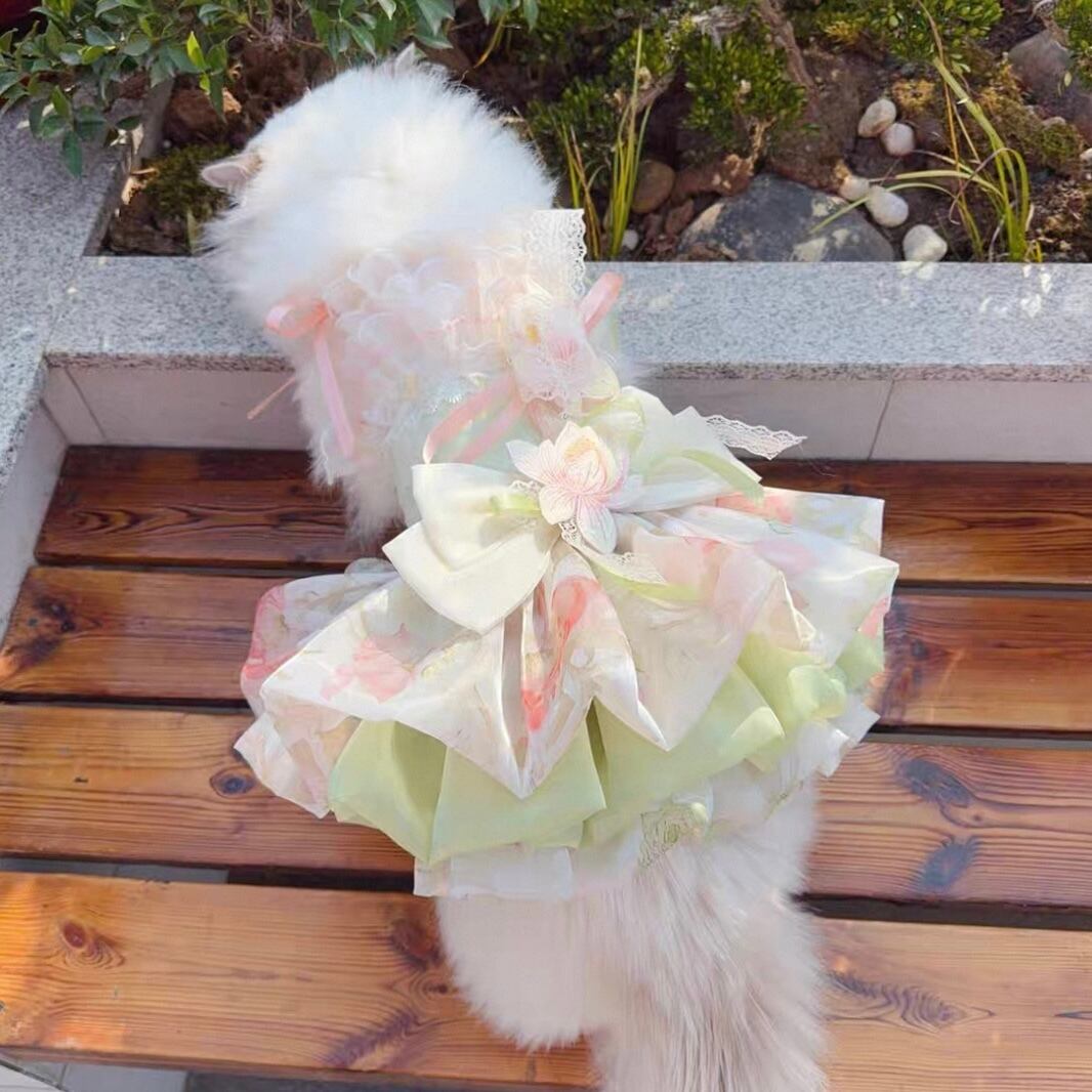 首元に施された繊細な花飾り、そして幾重にも重なるオーガンジーが、愛猫を華やかに彩ります。前から見ても後ろから見ても美しいシルエットは、特別な日の装いにぴったり。スカートの一部はホックで着脱可能なので、ウォーキングや撮影会など、様々なシーンで活躍します。