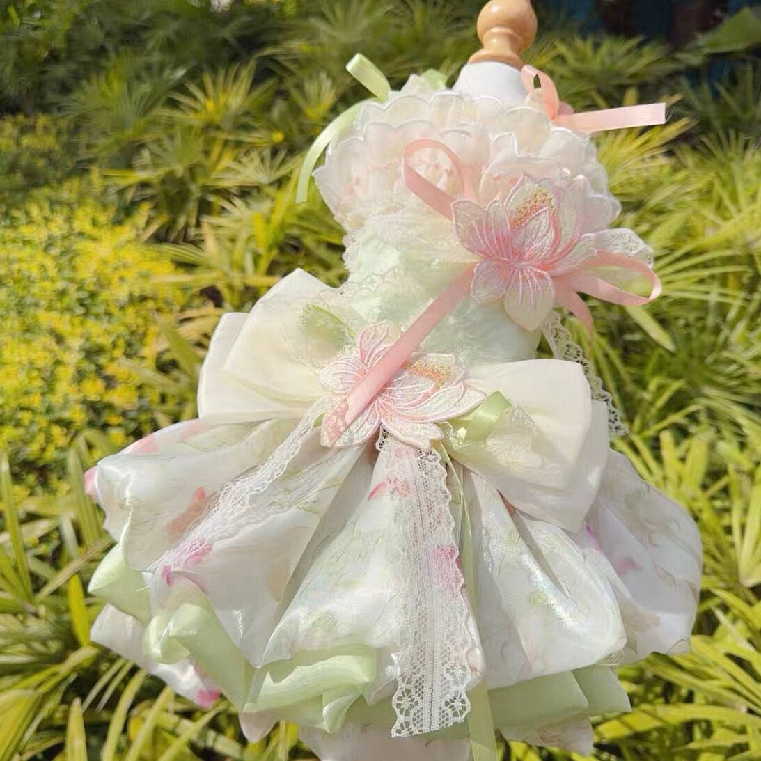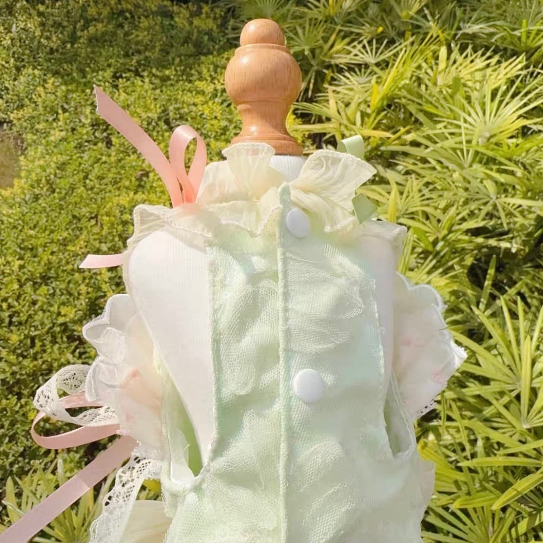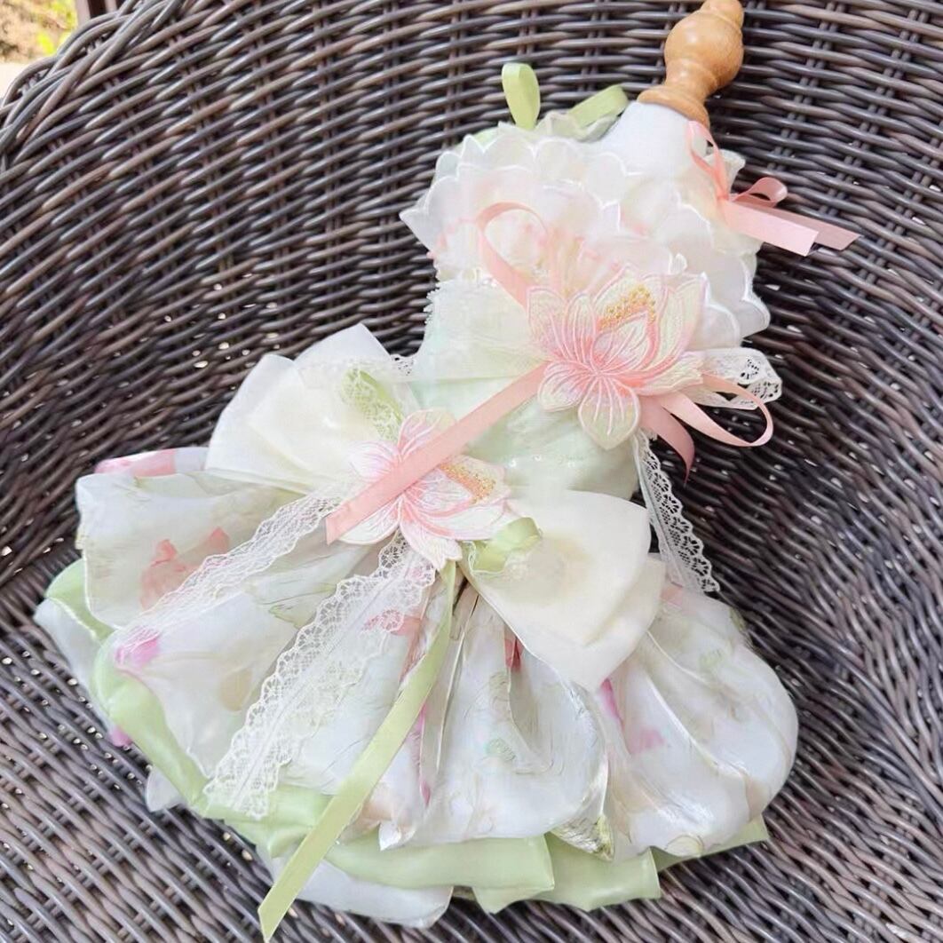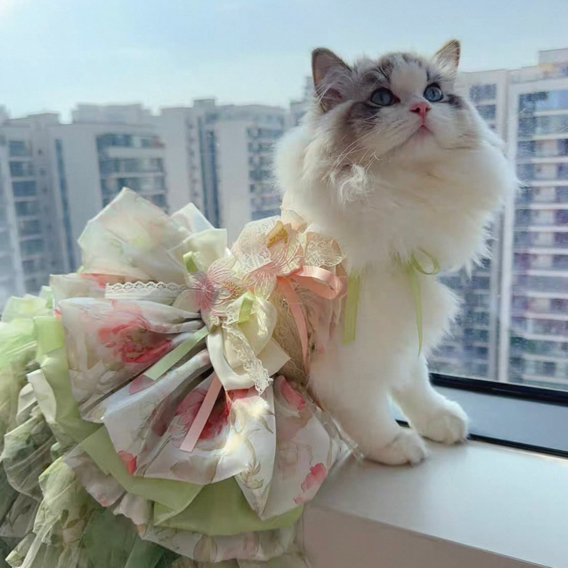 首元に施された繊細な花飾り、そして幾重にも重なるオーガンジーが、愛猫を華やかに彩ります。前から見ても後ろから見ても美しいシルエットは、特別な日の装いにぴったり。スカートの一部はホックで着脱可能なので、ウォーキングや撮影会など、様々なシーンで活躍します。