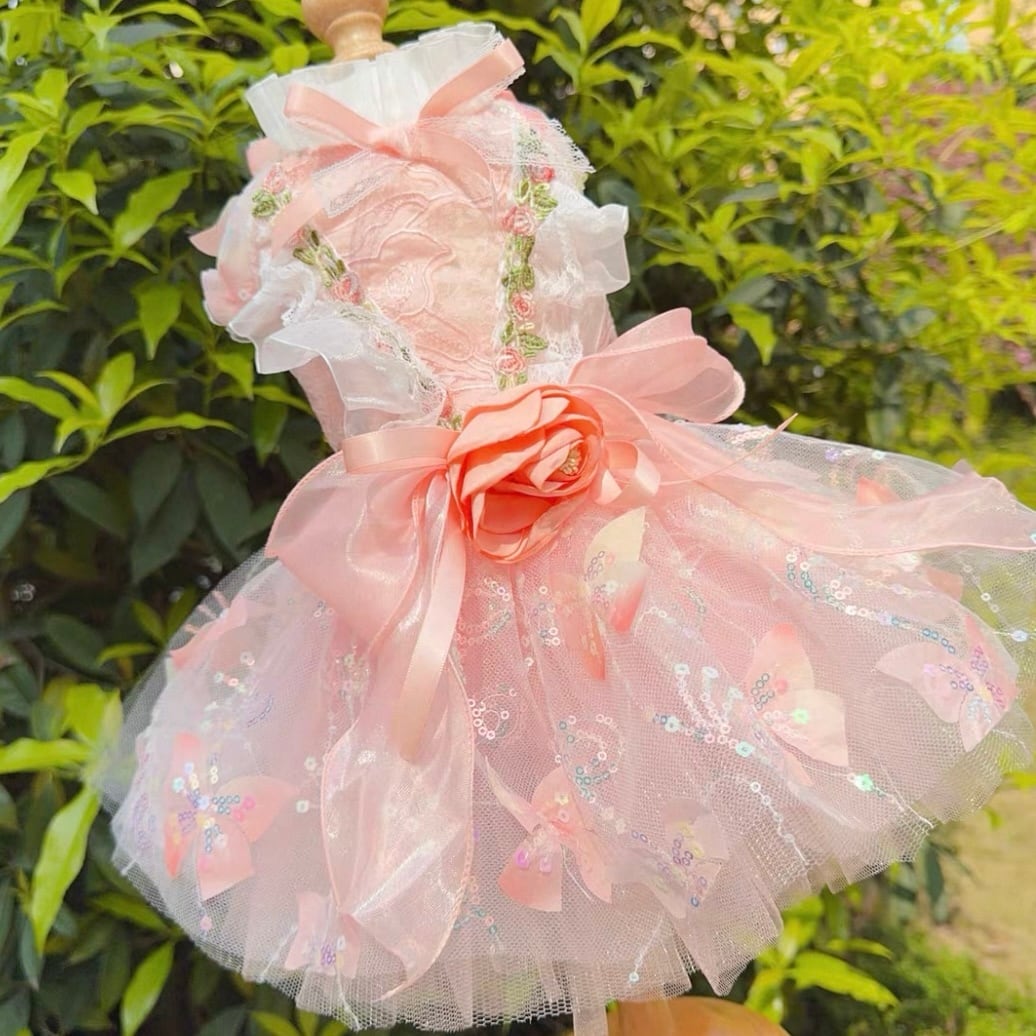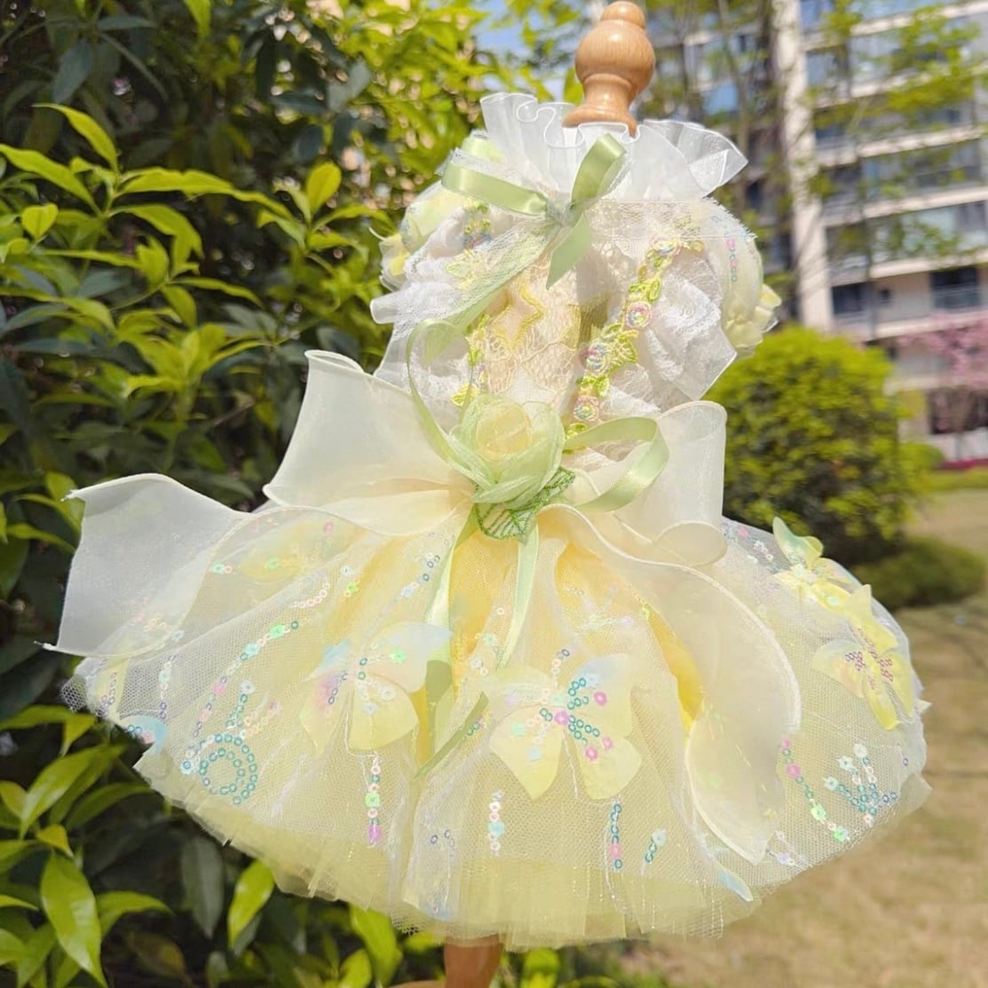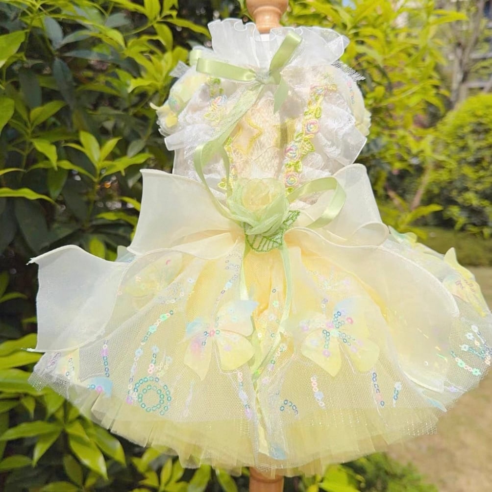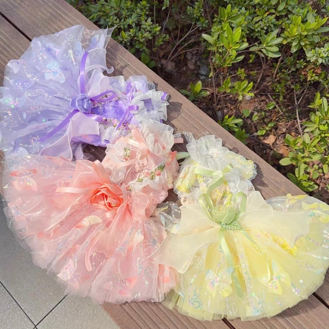 軽やかに舞う蝶のモチーフが散りばめられたチュールスカート。華やかなパステルカラーが、春の訪れを感じさせるような魅力的なデザインです。上品なリボンと繊細な装飾が、可憐な印象をさらに高めてくれます。お散歩やピクニック、特別な日の装いなど、様々なシーンで活躍すること間違いなしです。