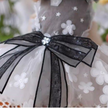 首元の華やかなフリルは上品な存在感を放ち、ウエストの大きなブラックリボンがスタイルを引き締めます。