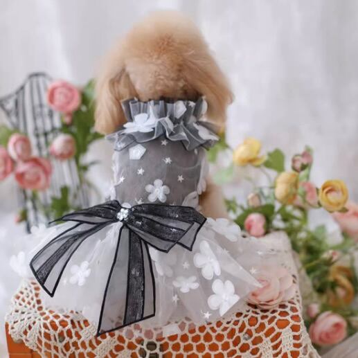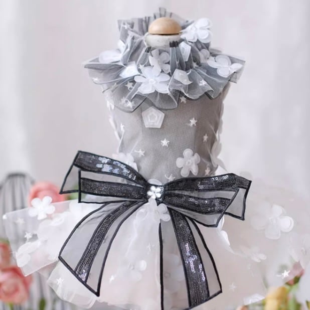 グレーとホワイトを基調に、立体的な花モチーフを散りばめたエレガントなドレス。