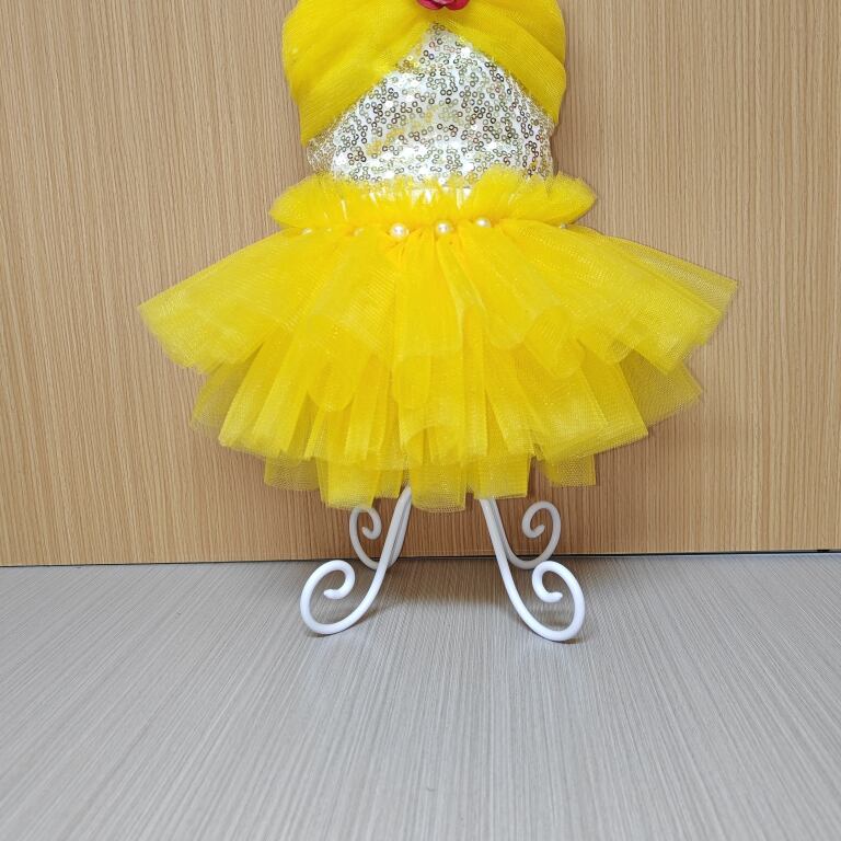鮮やかなイエローのチュールが幾重にも重なり、ふんわり広がるシルエットはまるで舞踏会のお姫様。