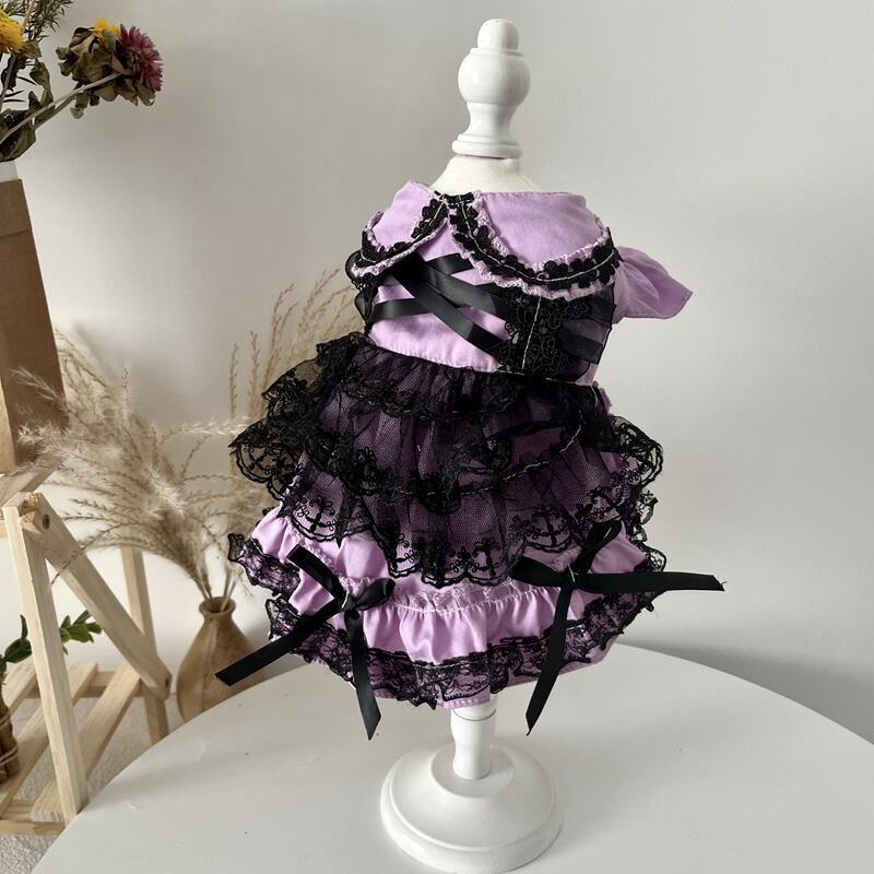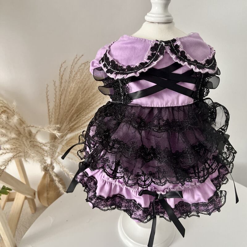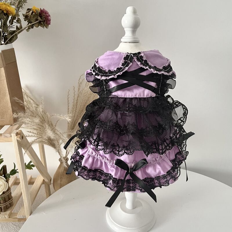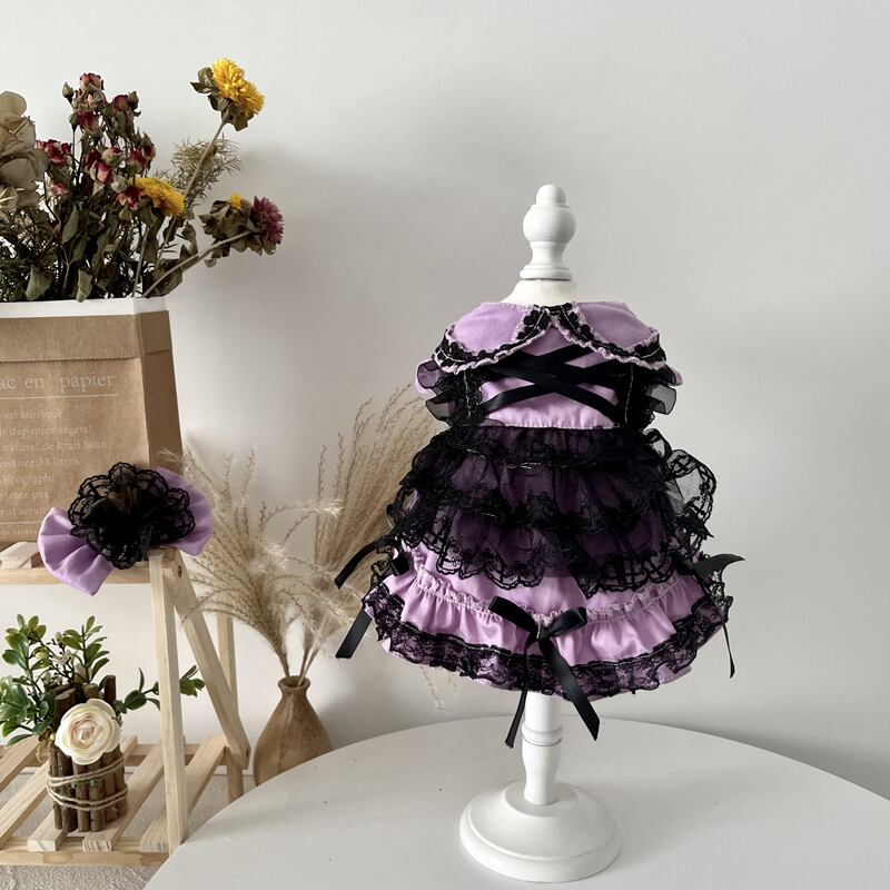 深い紫と漆黒のレースが幾重にも重なり、気品と神秘を纏った一着です。胸元のクロスリボンや裾にあしらわれたフリルが、物語のお姫様を思わせるクラシカルな雰囲気を演出。