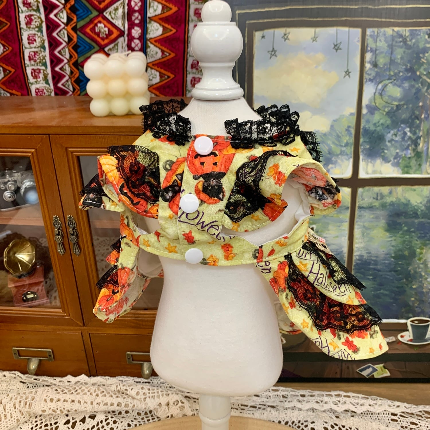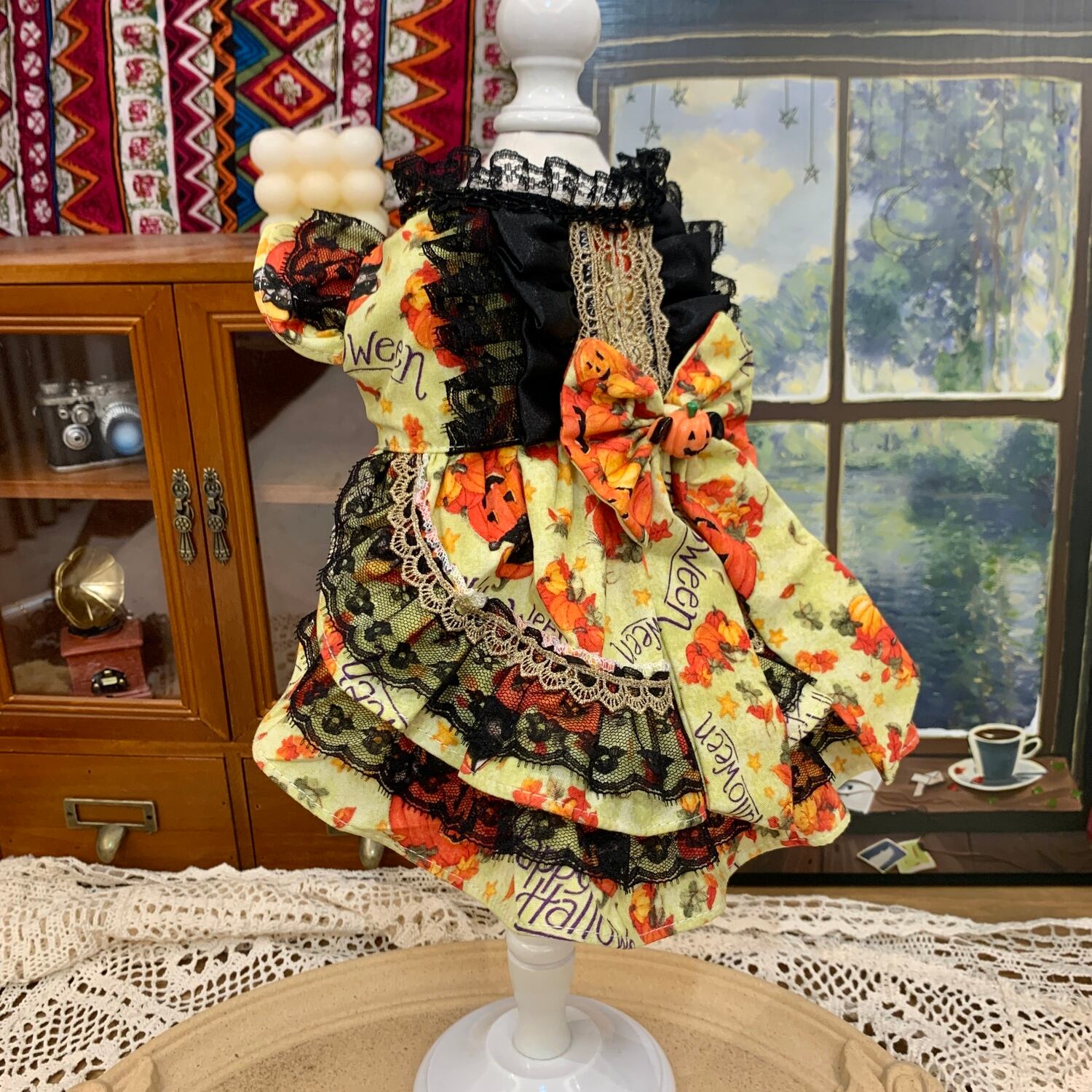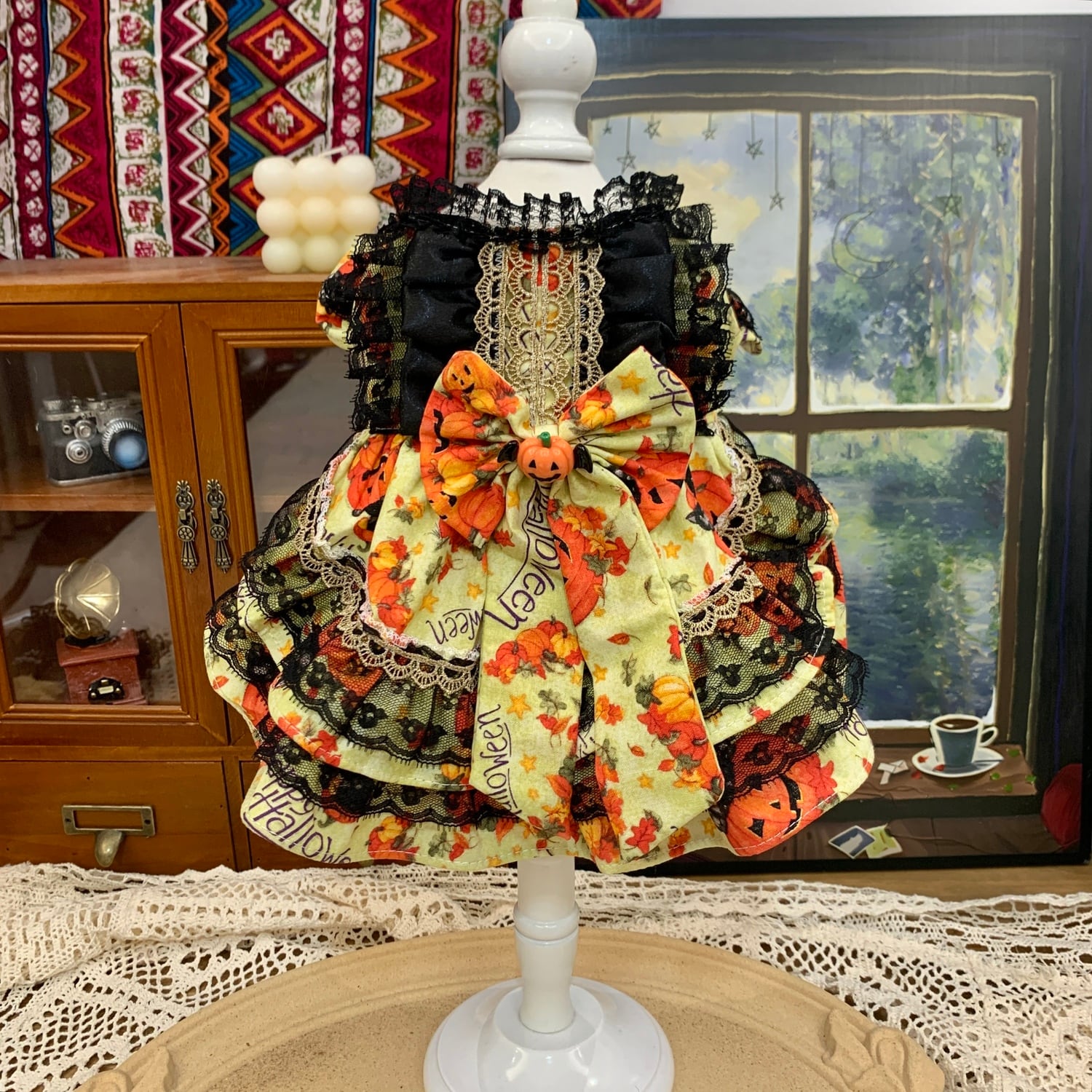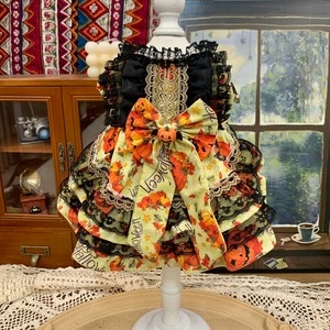 黒レースの重なりがクラシカルな気品を演出し、鮮やかなかぼちゃ柄のスカートが遊び心をプラス。背中には大きなリボンとかぼちゃのチャームが揺れ、物語の主人公のような存在感を放ちます。
