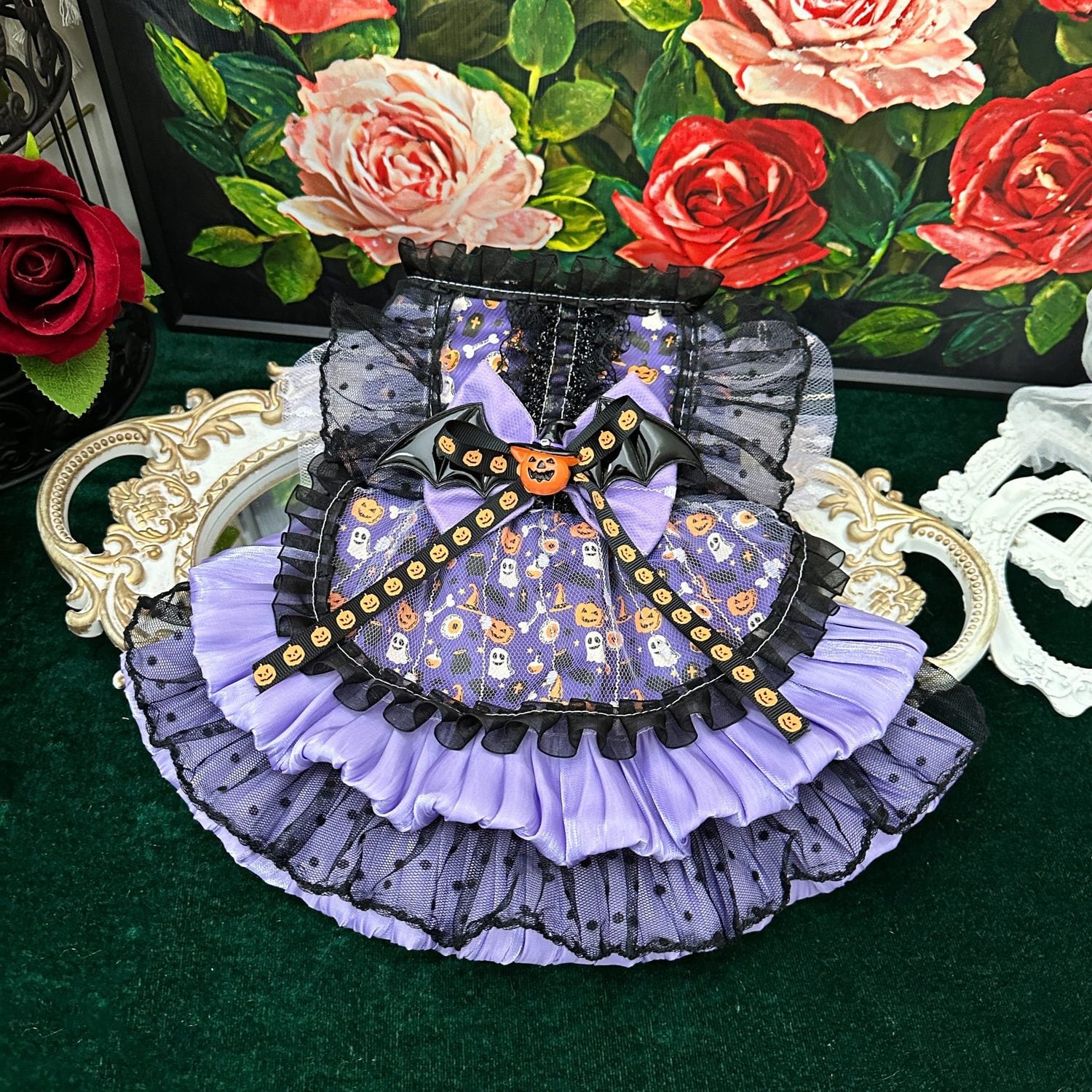 漆黒のレースに包まれたパープルのスカートは、ランタンの灯りに照らされてきらめき、胸元にはジャックオーランタンのリボンがちょこんと飾られて、愛らしさの中に少しだけスパイスを効かせています。