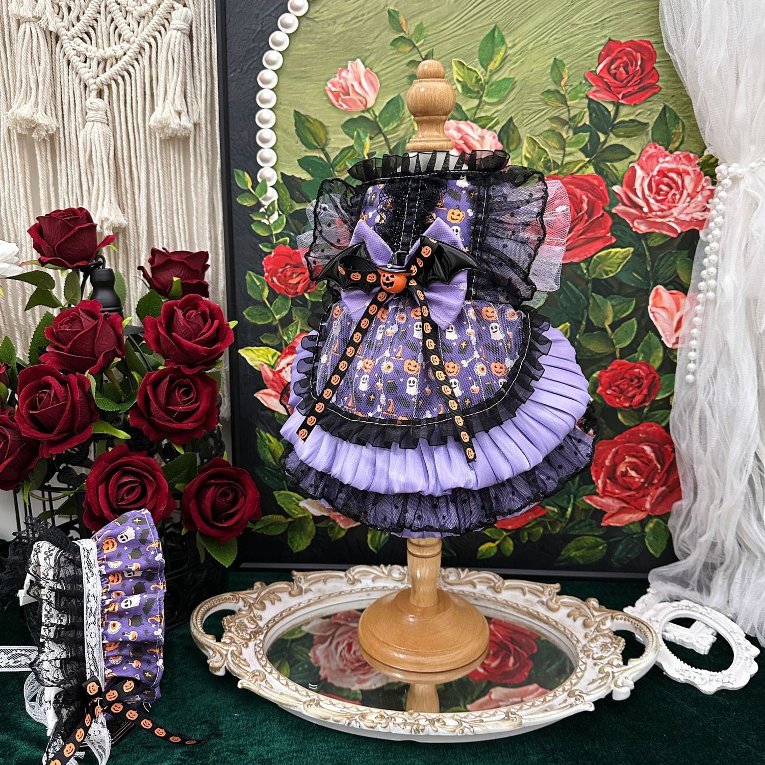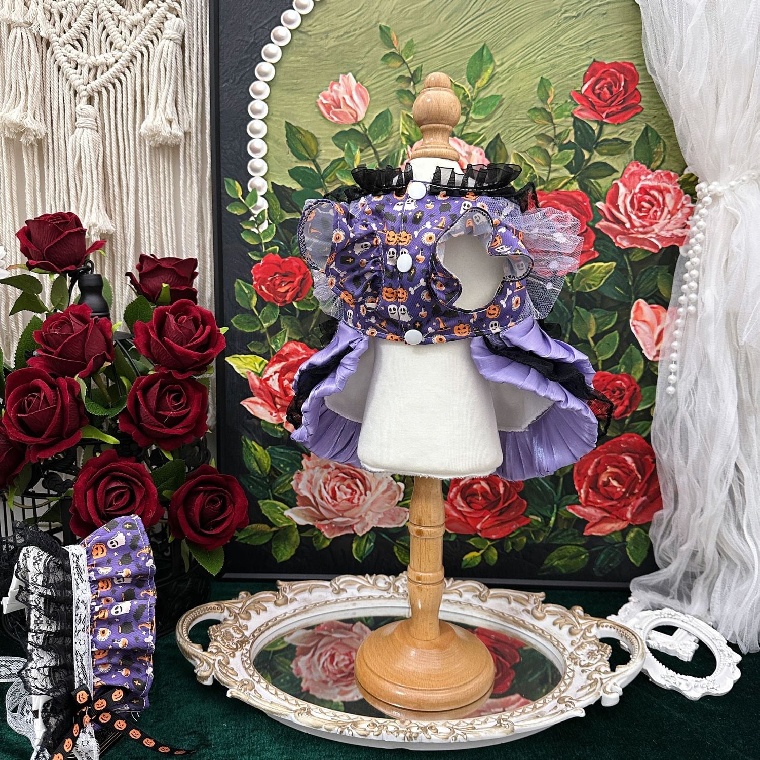 付属のヘッドドレスを合わせれば、まるでおとぎ話に登場する小さな魔法使いのようなスタイルに。ハロウィンパーティーはもちろん、お散歩や撮影会でも、特別なひとときを彩るにふさわしいドレスです。