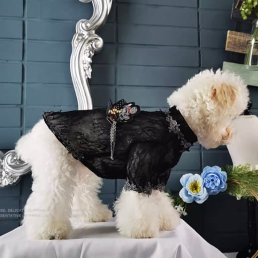 繊細なレースの透け感がエレガントでありながら、男の子らしいシルエットをしっかりと引き立てます。胸元には蝶のモチーフブローチがあしらわれ、キラリと輝くアクセントに。