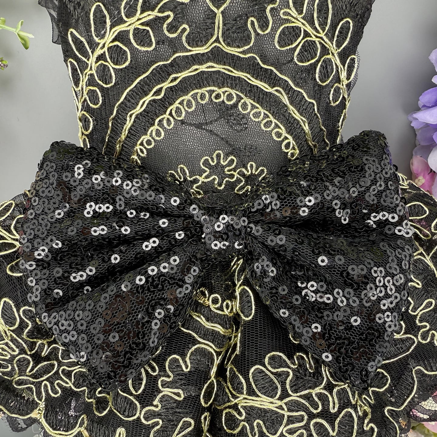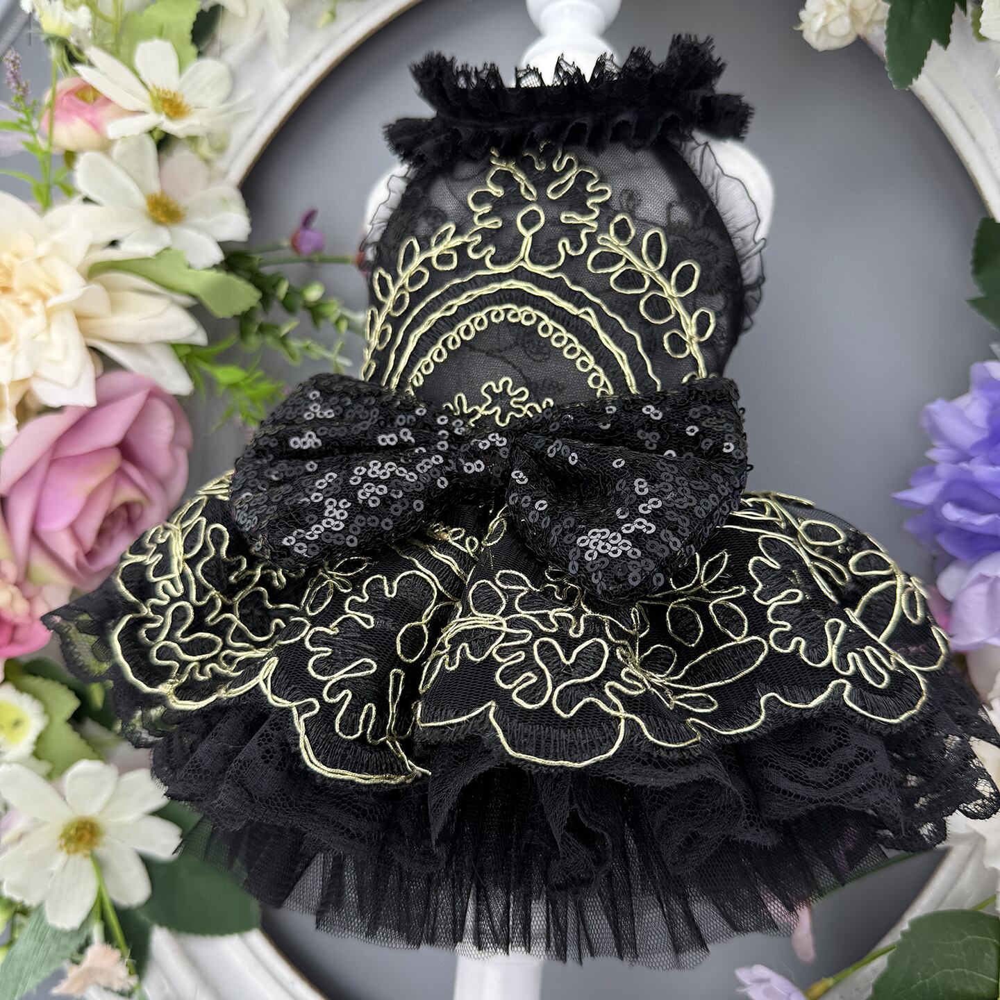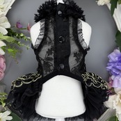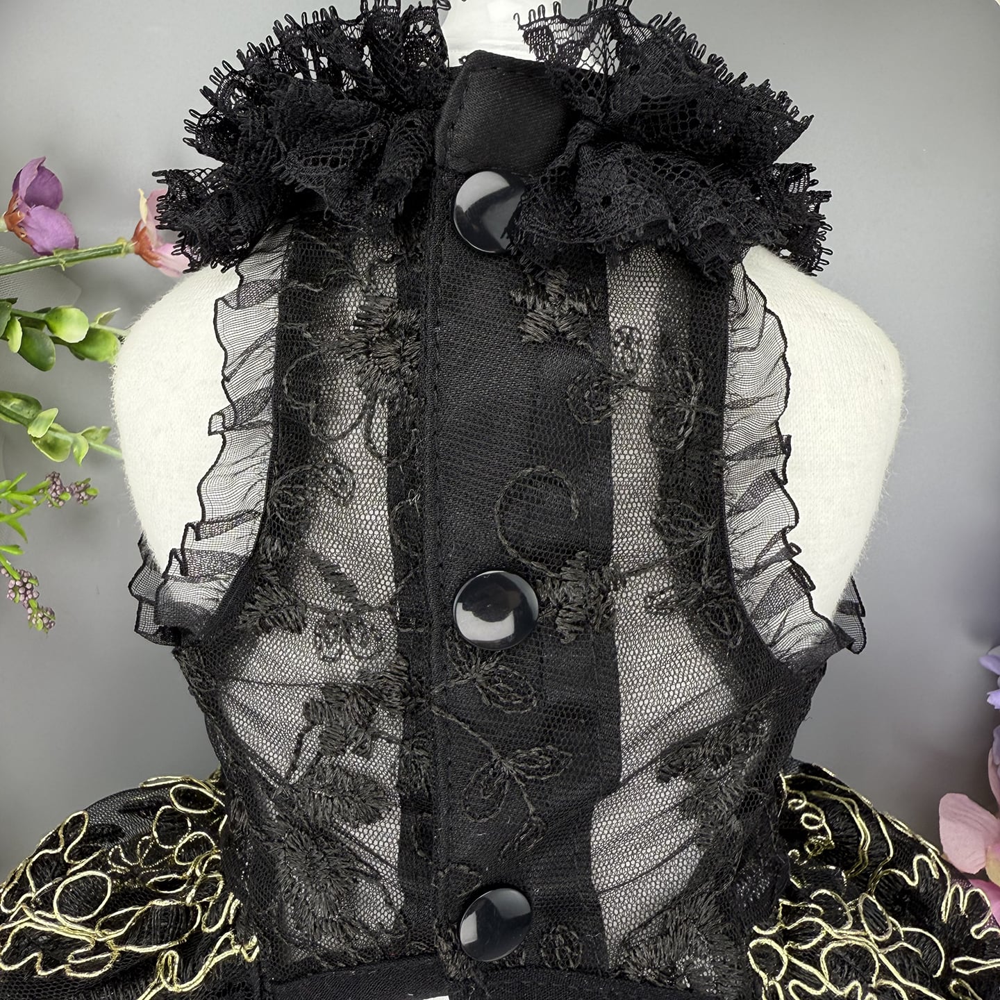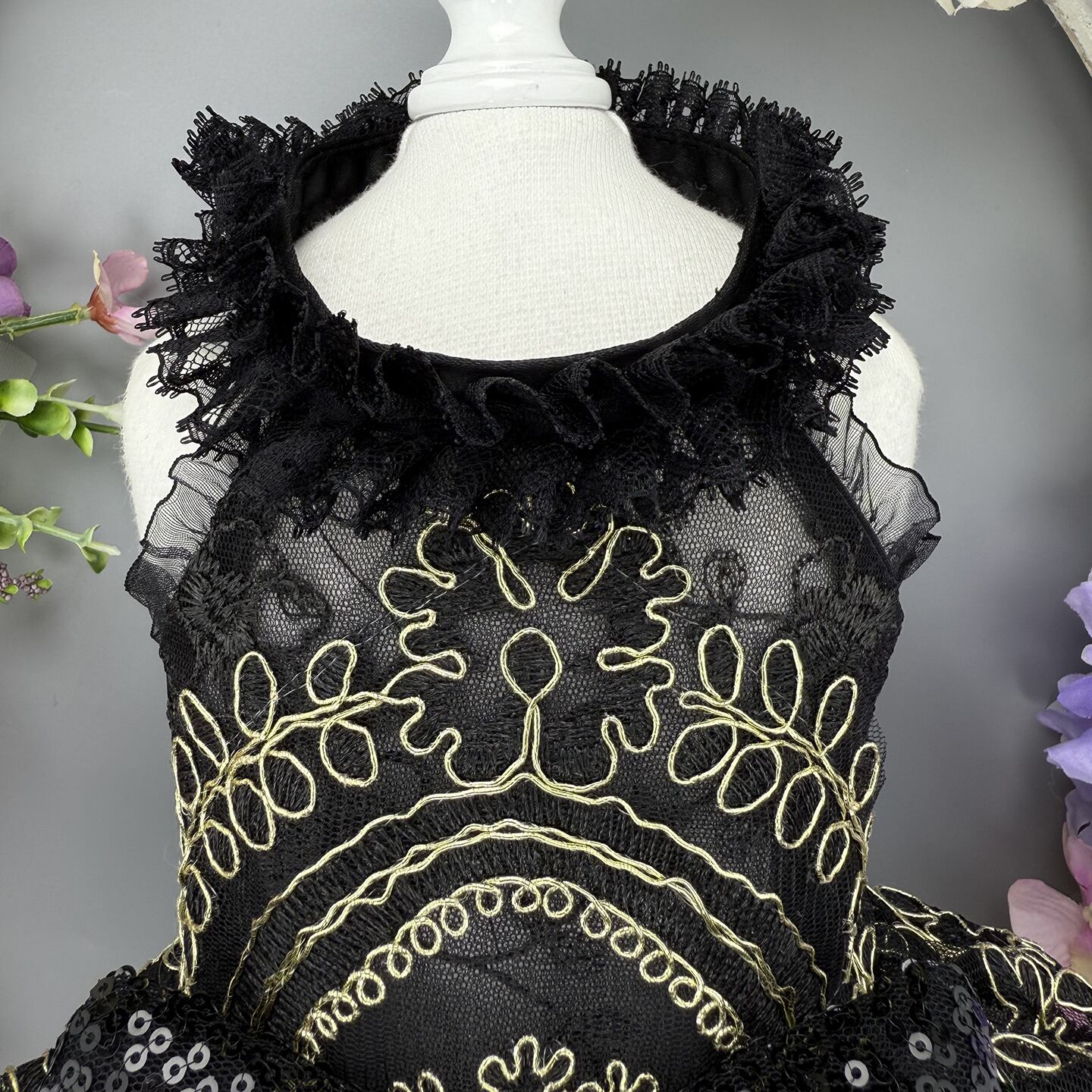 漆黒のレースに金糸の刺繍が映える、気品あふれるドレスです。