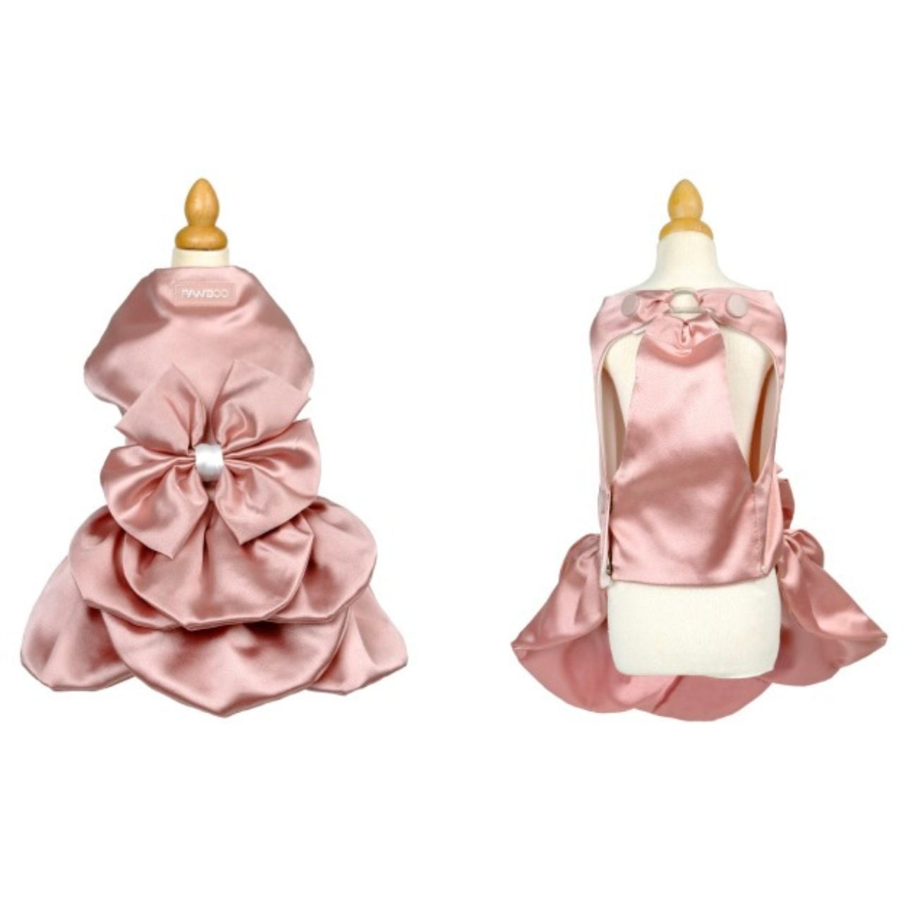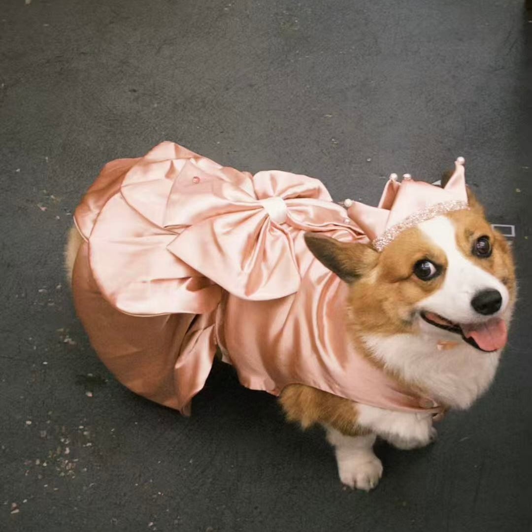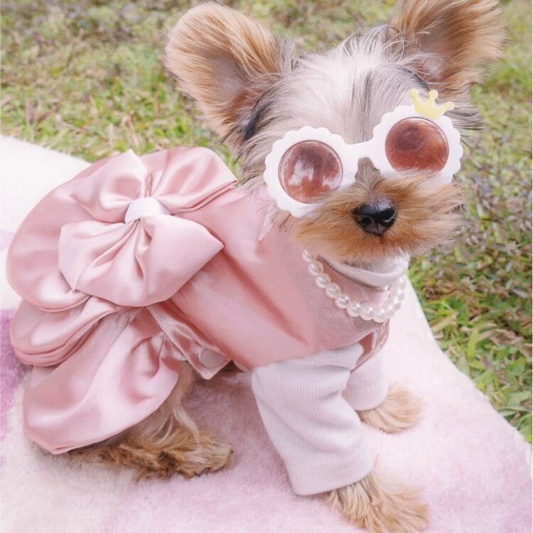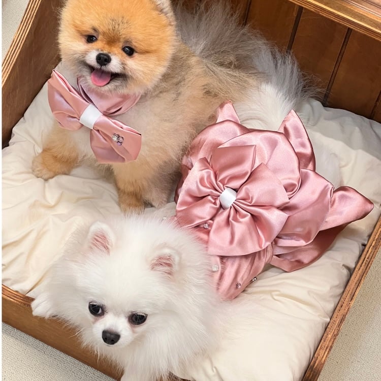 大きなリボンと光沢のあるサテン生地が華やかさを添える、プリンセススタイルの特別なドレス。