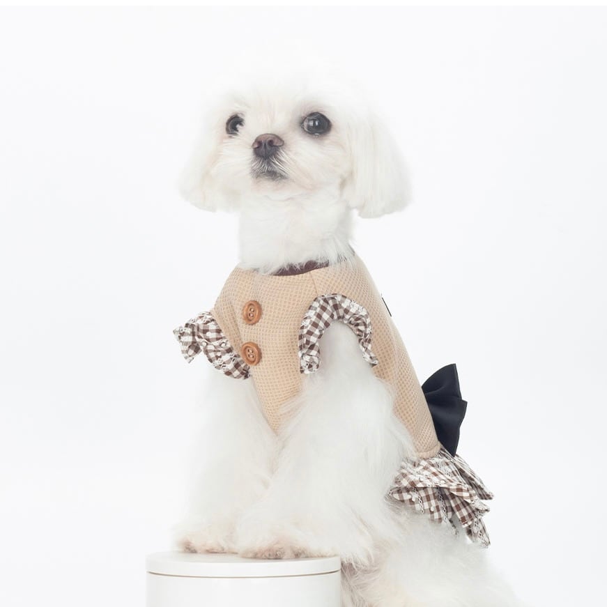 ナチュラルベージュにギンガムチェックのフリルをあしらった、可憐で愛らしいドレス。