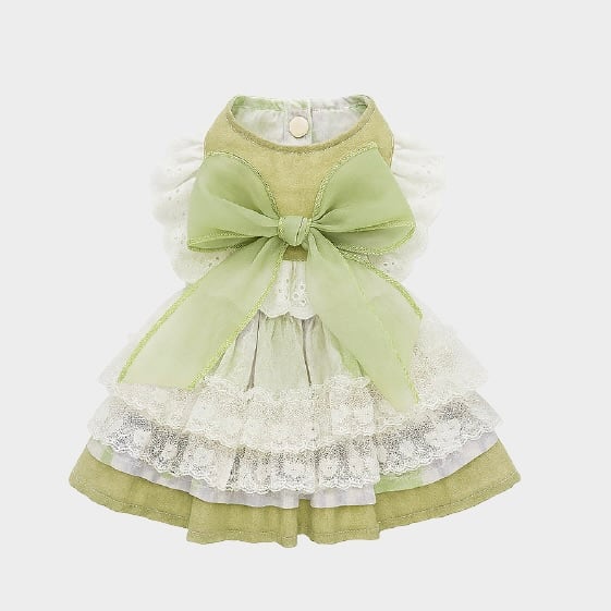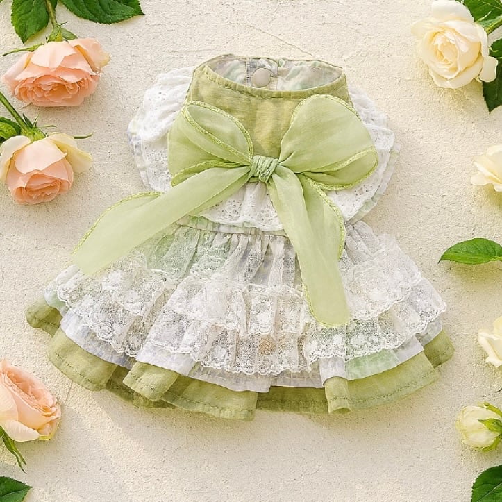 柔らかなグリーンとホワイトのレースが重なり合い、まるで妖精のような雰囲気をまとえるロマンチックなドレス。