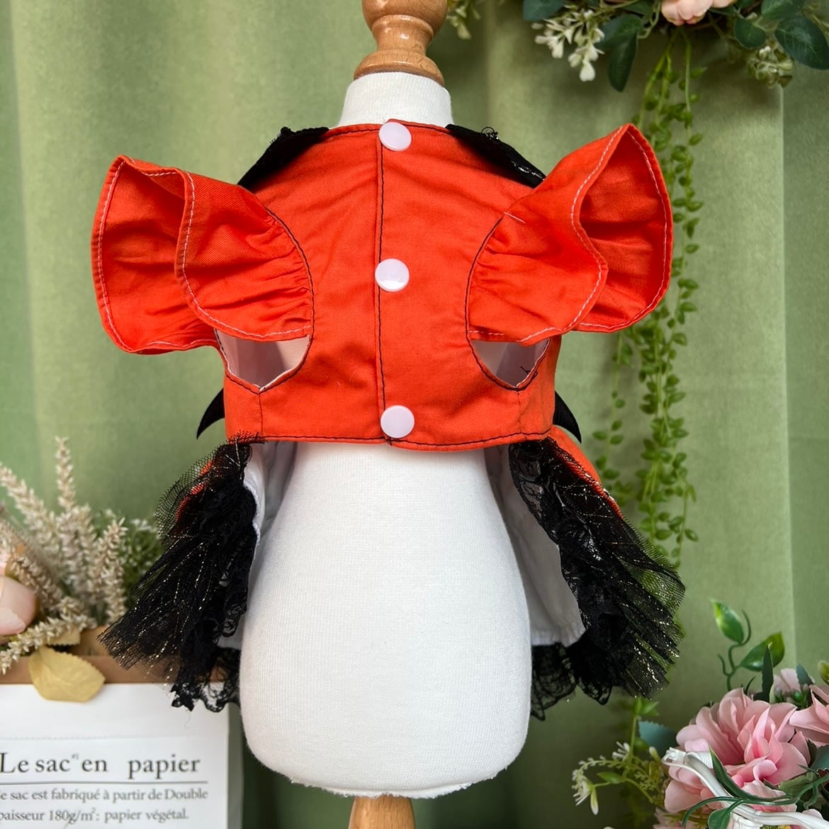 鮮やかなオレンジに、黒レースとリボンをあしらい、シルエットはふんわり広がるお姫様風。