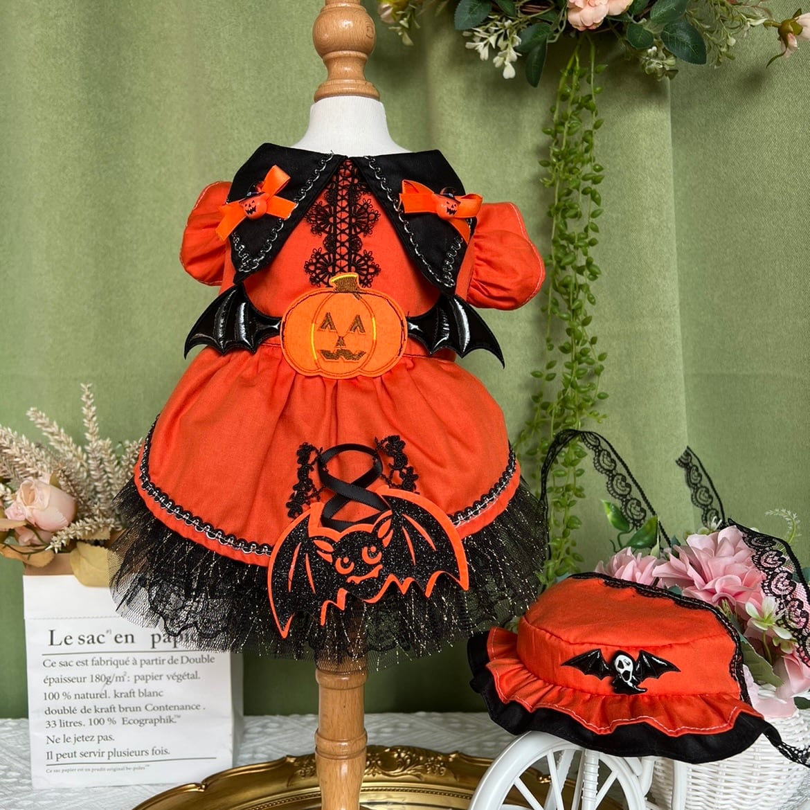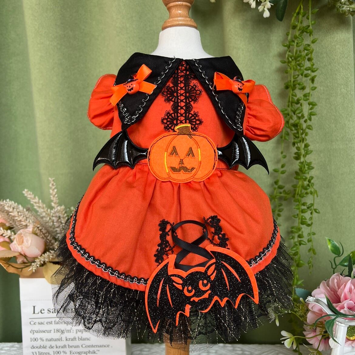 胸元のかぼちゃと裾のこうもりアップリケが、パーティーの主役にぴったりの存在感を放ちます。