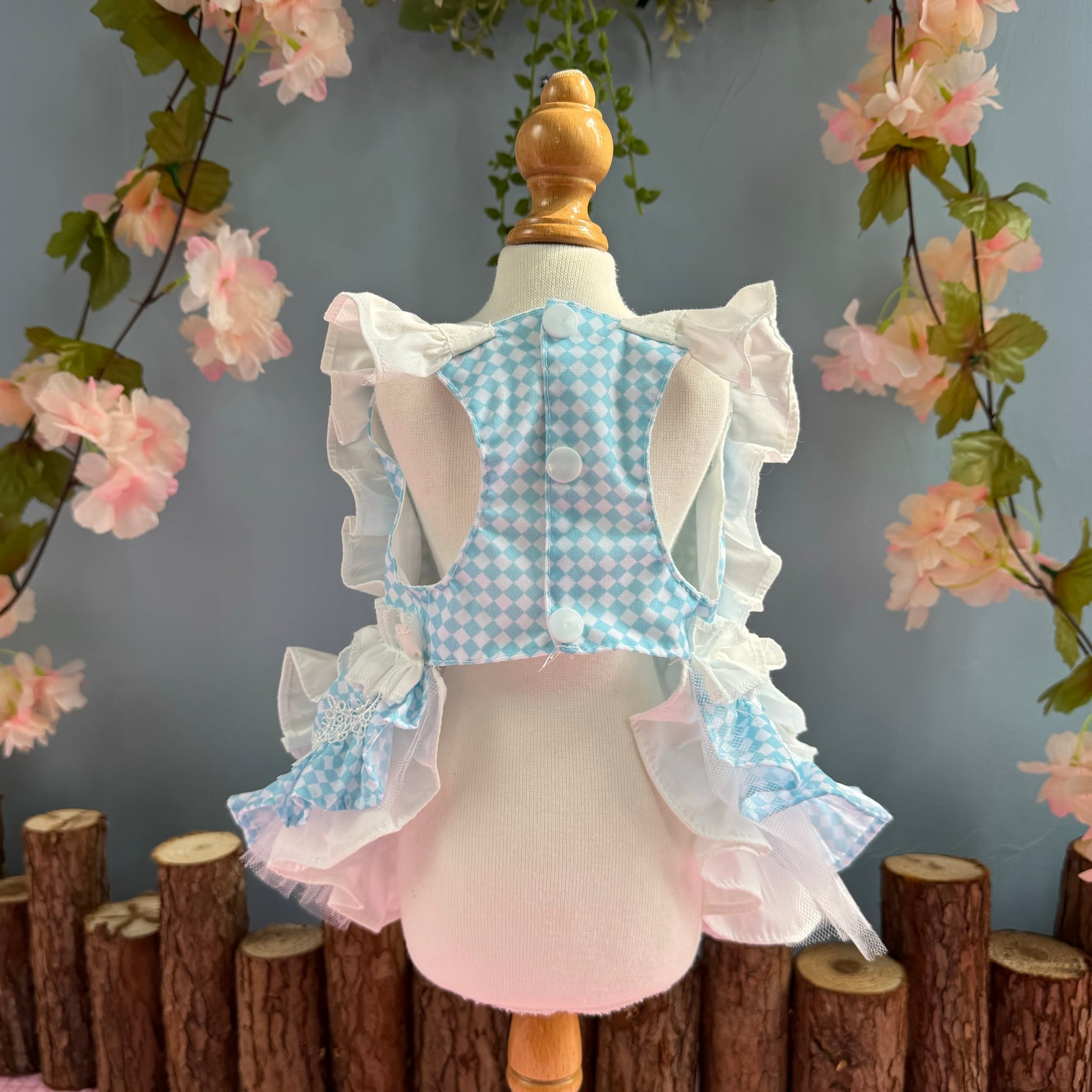 爽やかな水色のギンガムチェックに、きらめく宝石風リボンとフリルが重なり、まさに夢の中のお姫様スタイル。