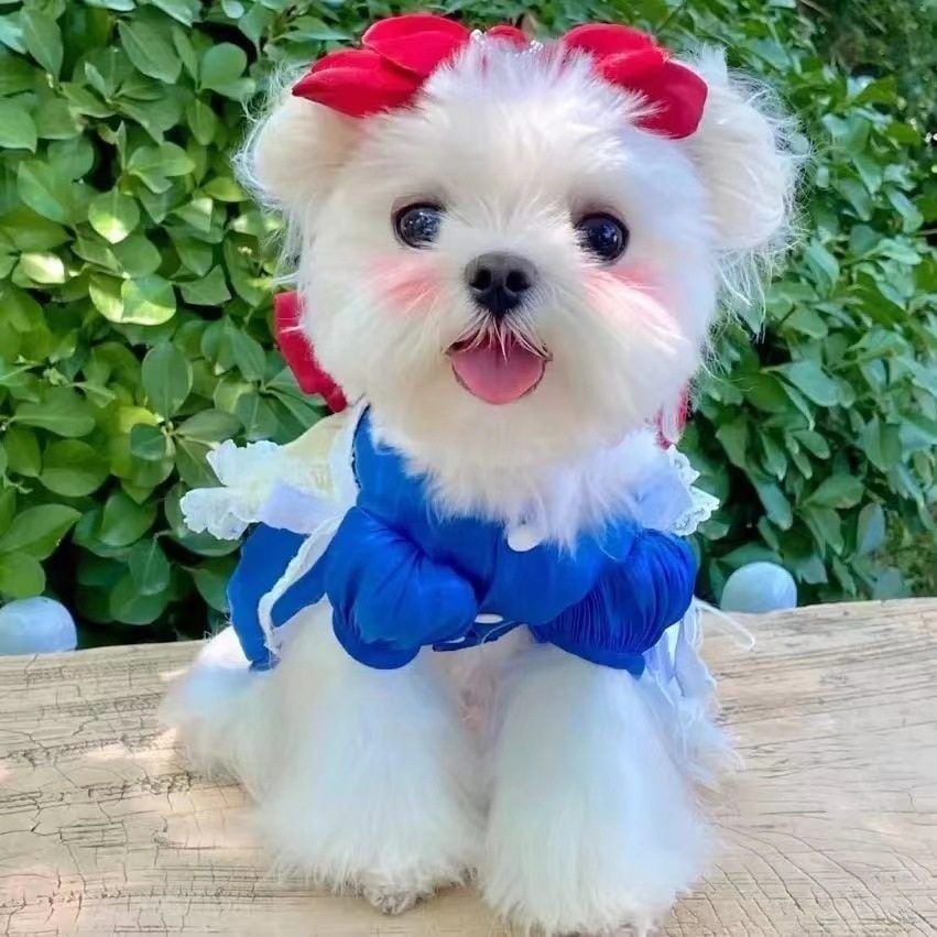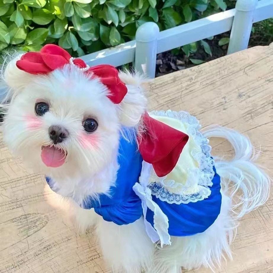 童話の世界から飛び出したような、赤いリボンが印象的な白雪姫風ドレス。