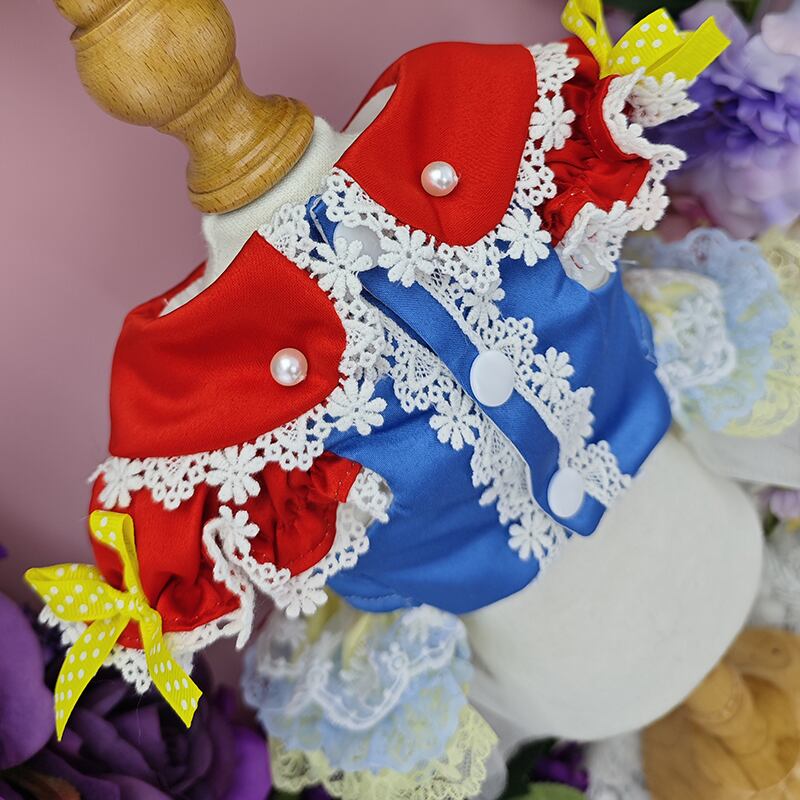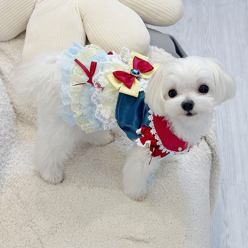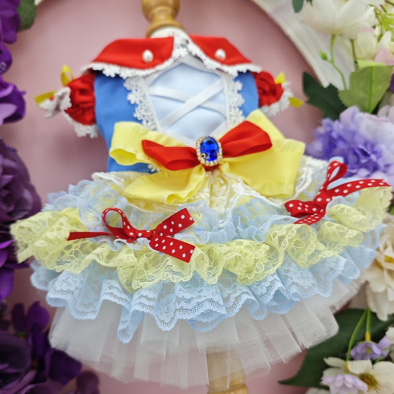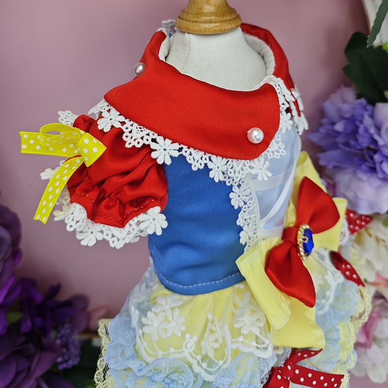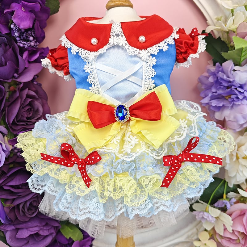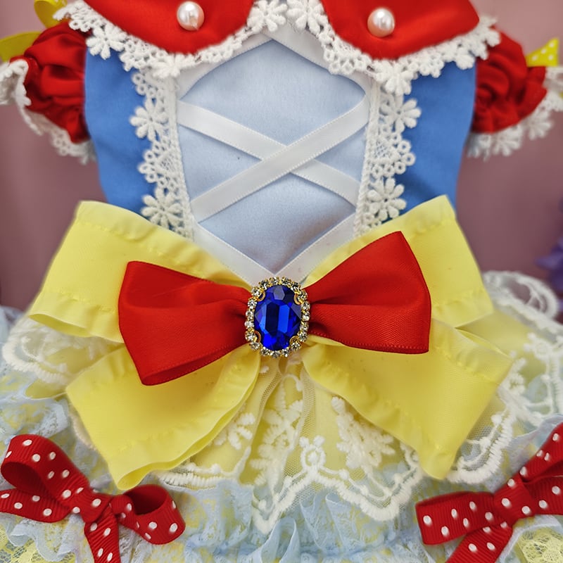 赤・青・黄色のポップで可愛い配色が目を引く、白雪姫風のキュートドレスです。