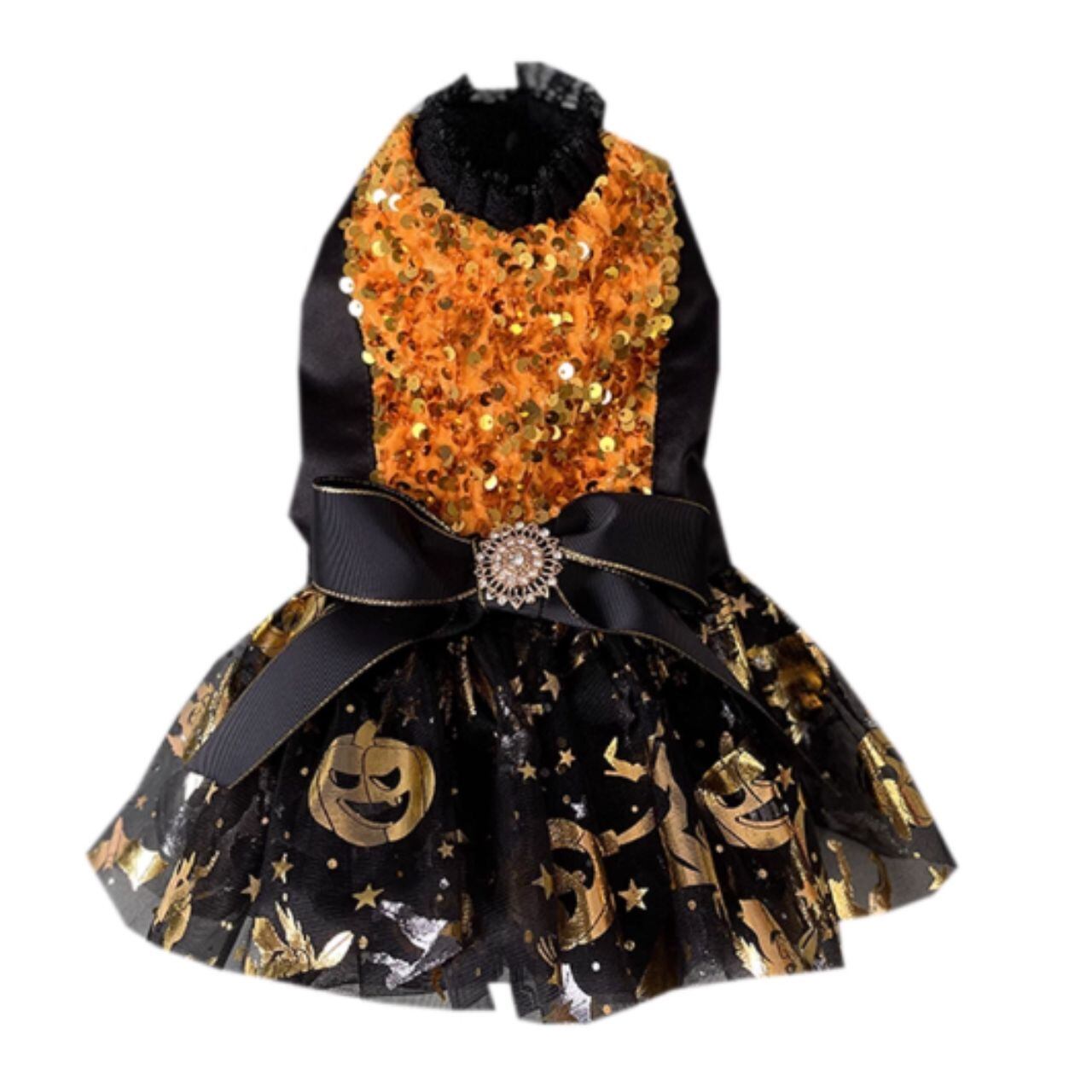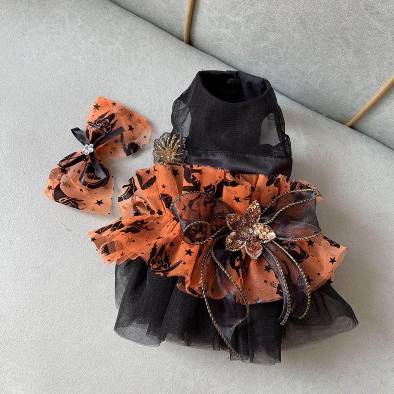 かぼちゃやコウモリなどのハロウィンモチーフを散りばめた、存在感抜群のオレンジ×ブラックドレス。