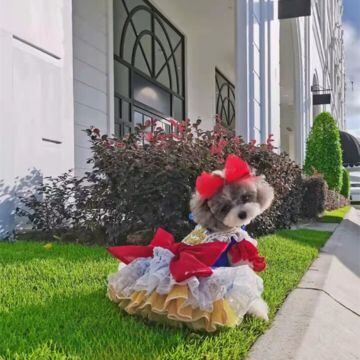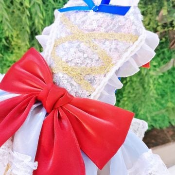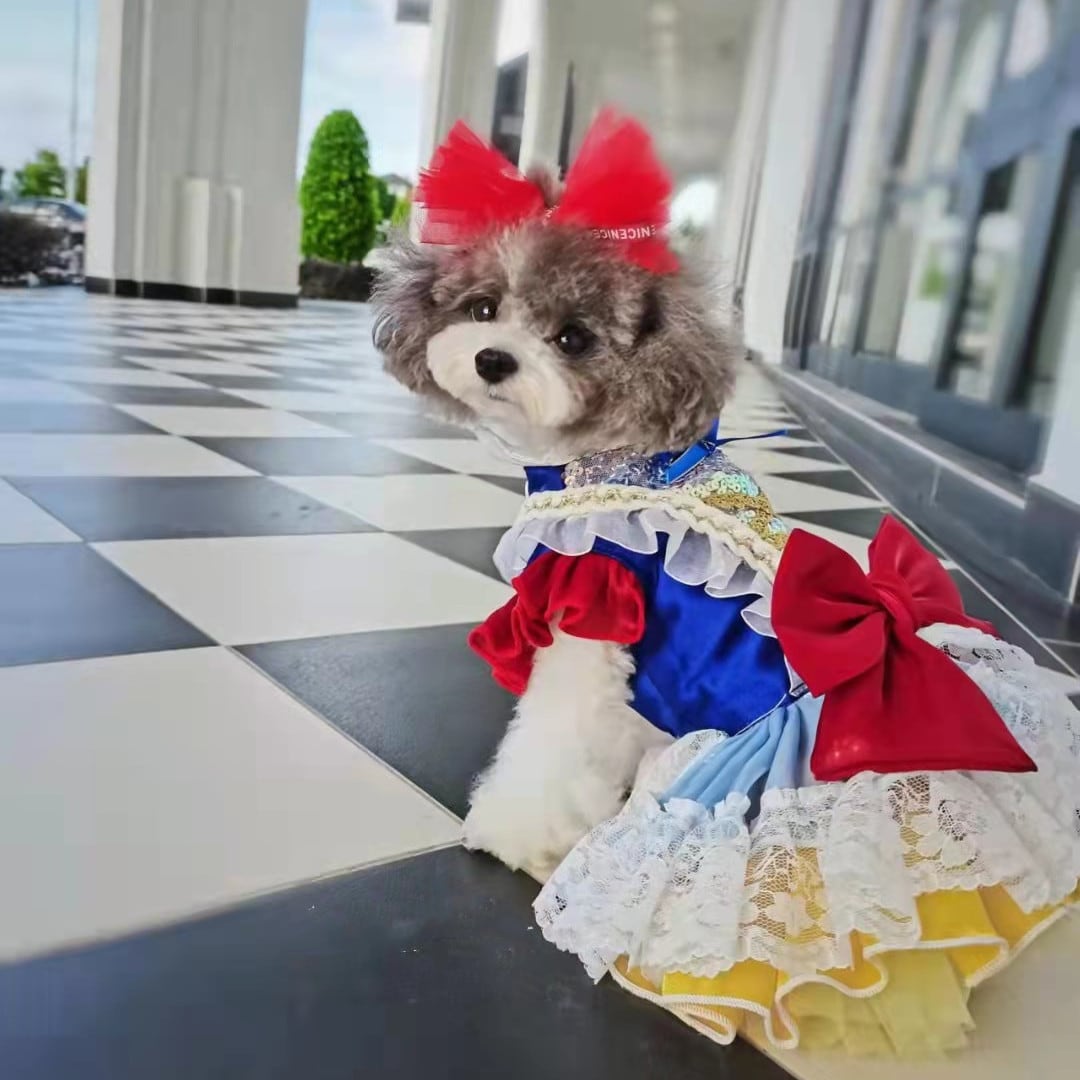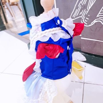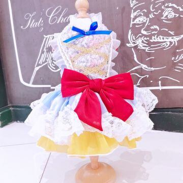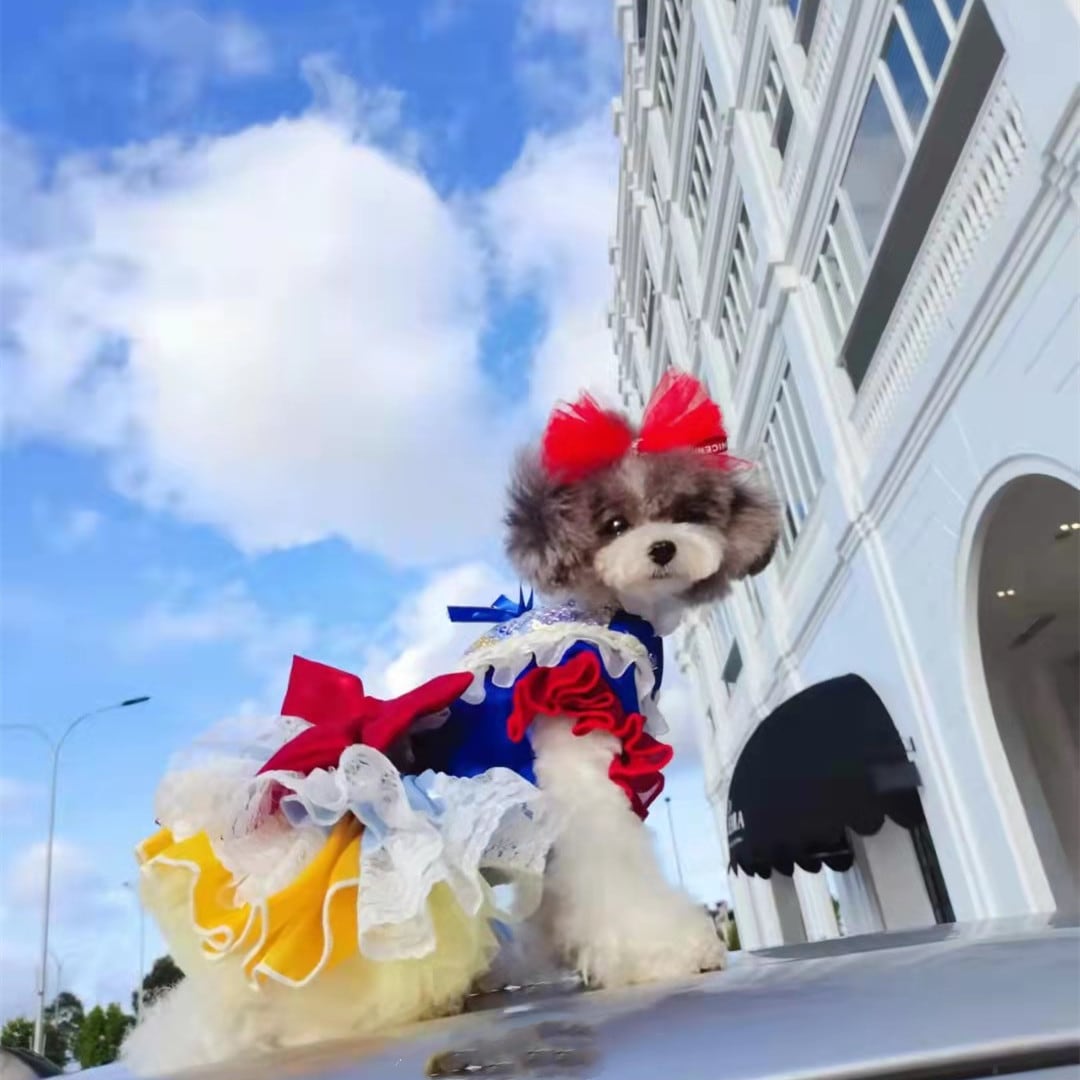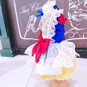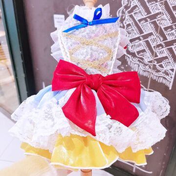鮮やかなブルーのトップに、ふんわりと広がるイエローのスカート、ホワイトのレースが重なり合い、物語の世界から抜け出したかのような存在感を演出します。