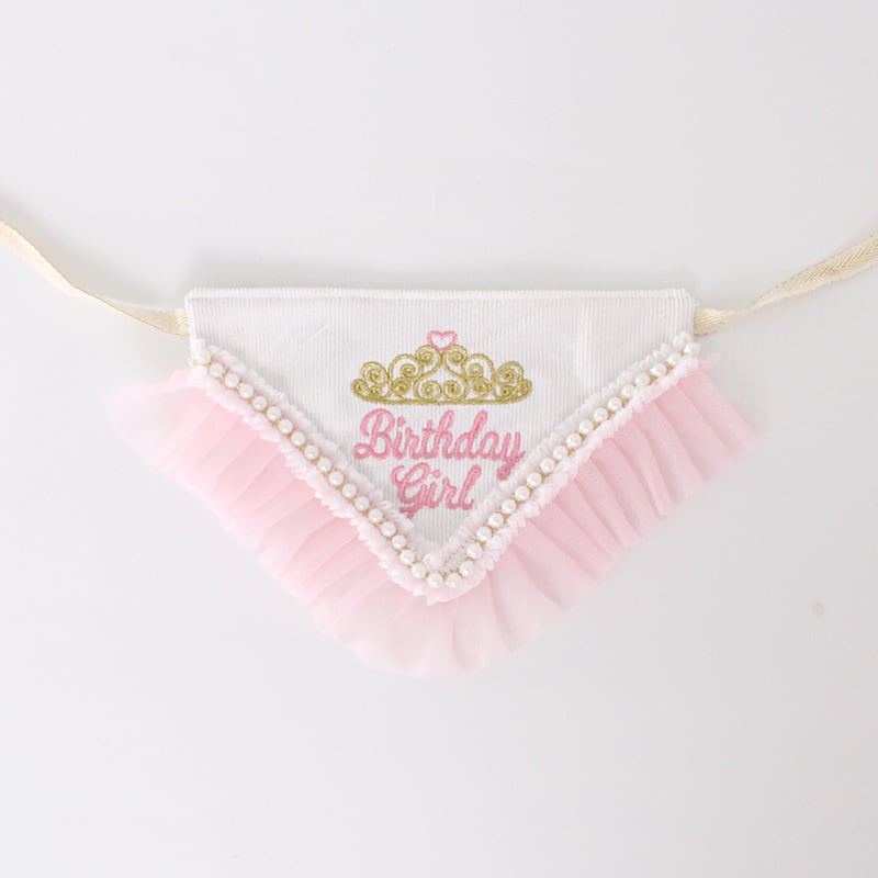 「Birthday Girl」の刺繍入りビブは、ふんわりピンクのチュールとパール風ビーズで華やかに仕上げました。