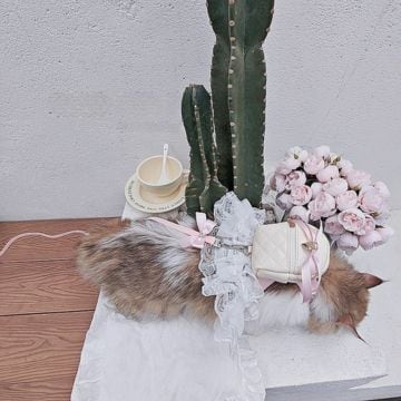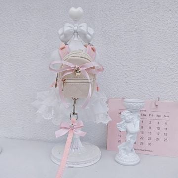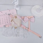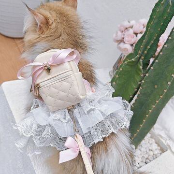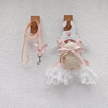 ふんわりレースとリボンに、小さなリュックを合わせた可愛いデザインのハーネスとリードのセットです。