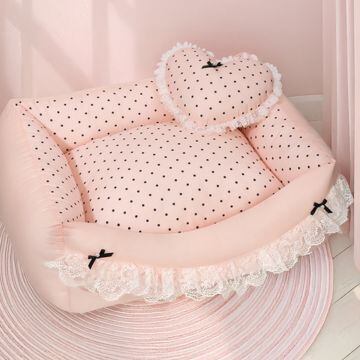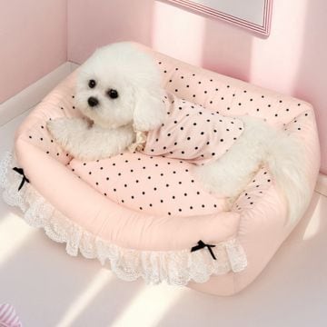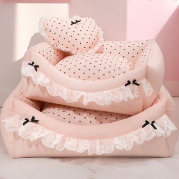 ドット柄とレースフリルが乙女心をくすぐる、キュートな姫系ベッドです。