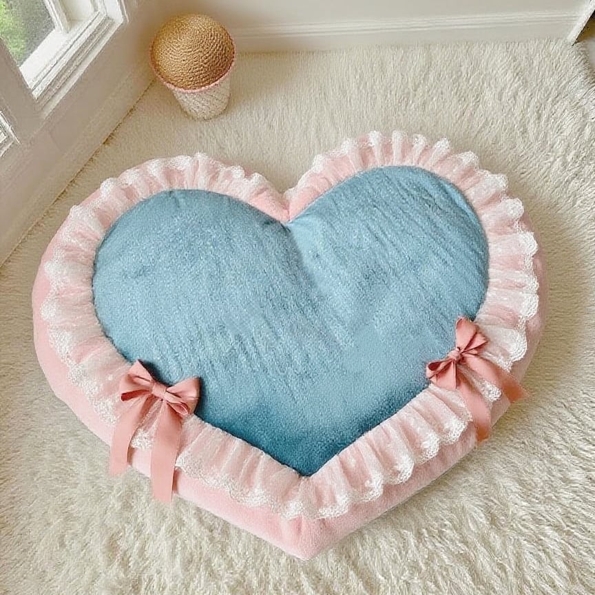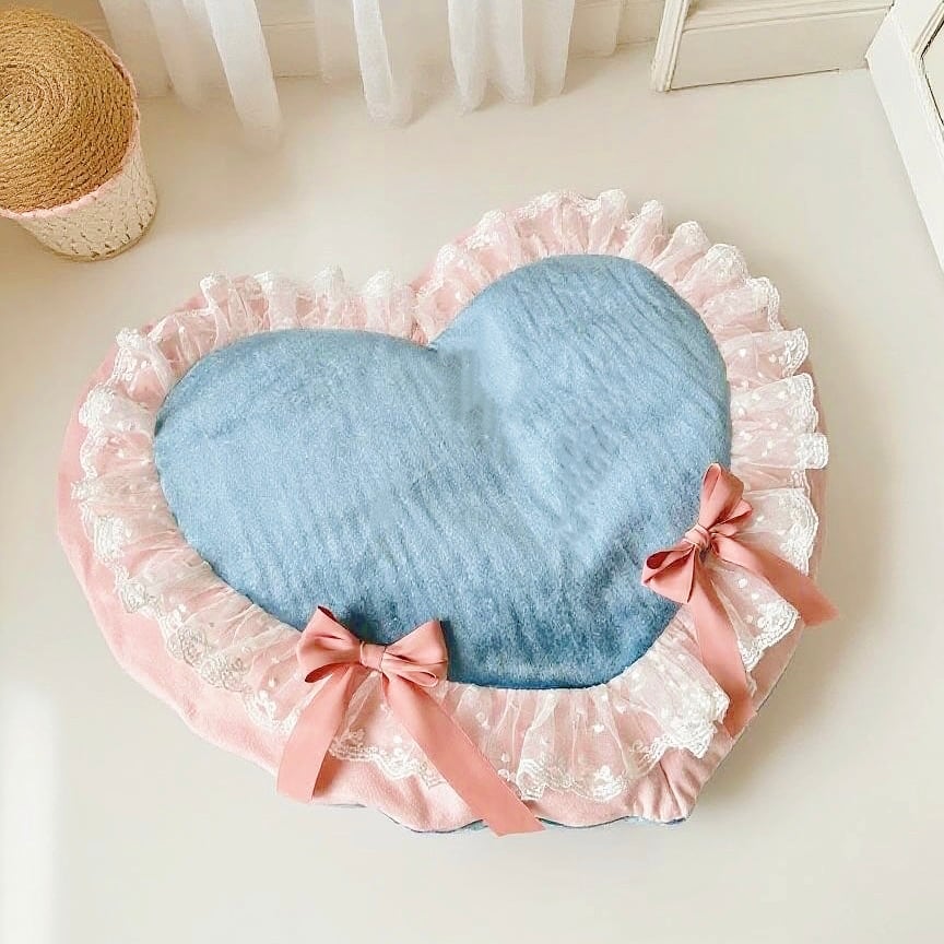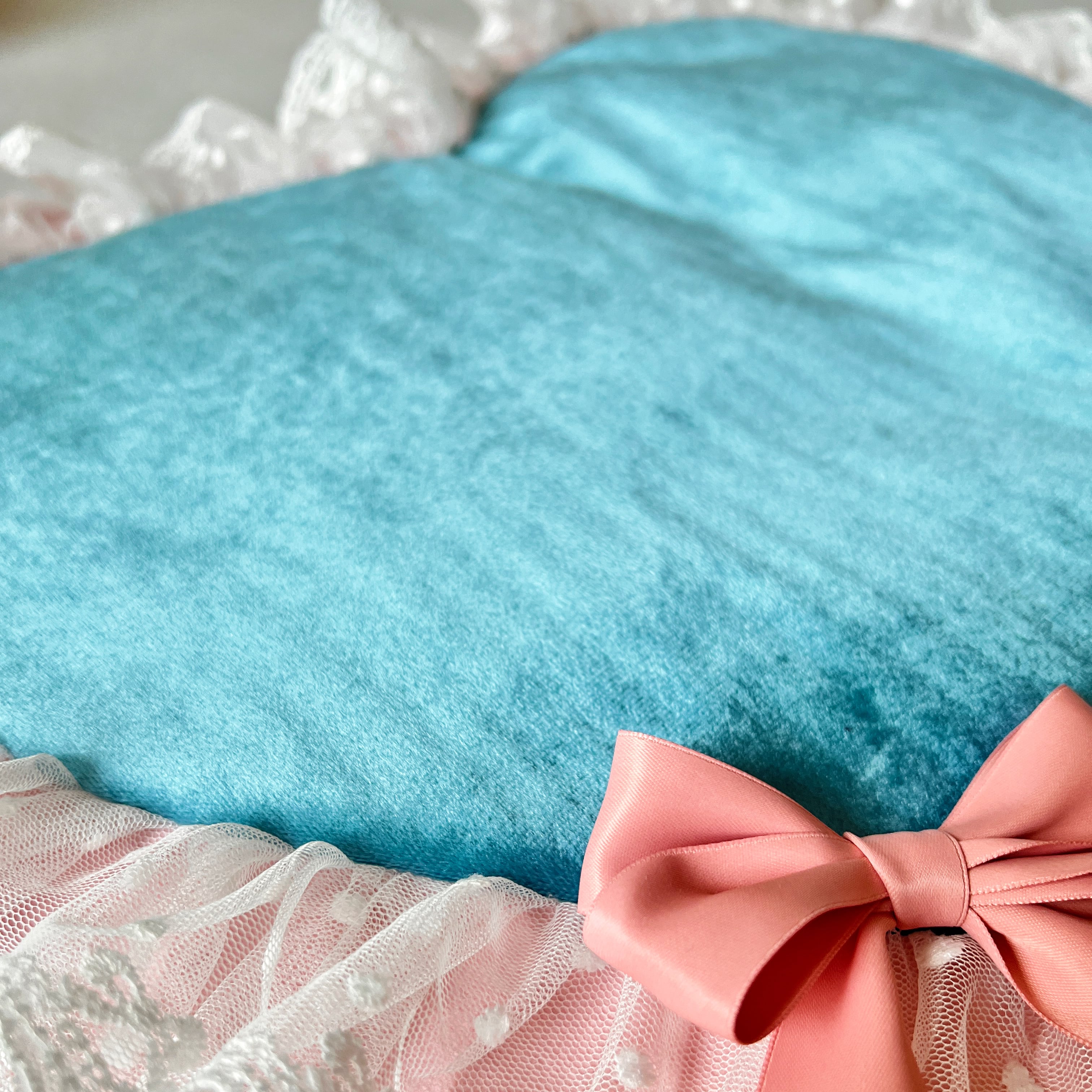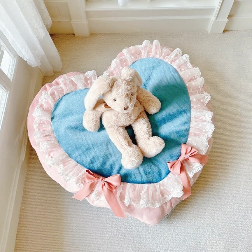 ふわふわのブルークッションに、ピンクのフリルとリボンをあしらったデザインは、お部屋を一気にプリンセスムードにしてくれます。