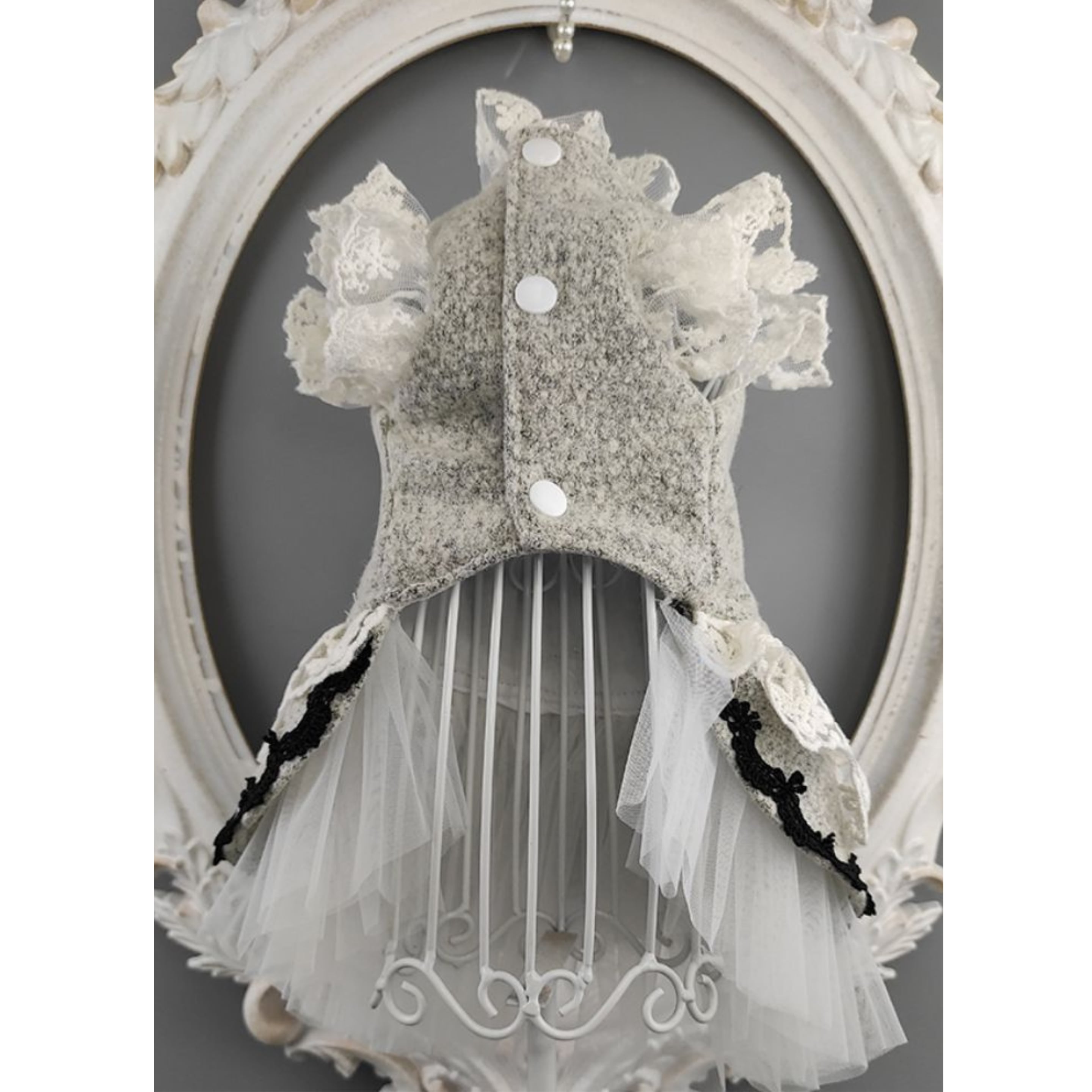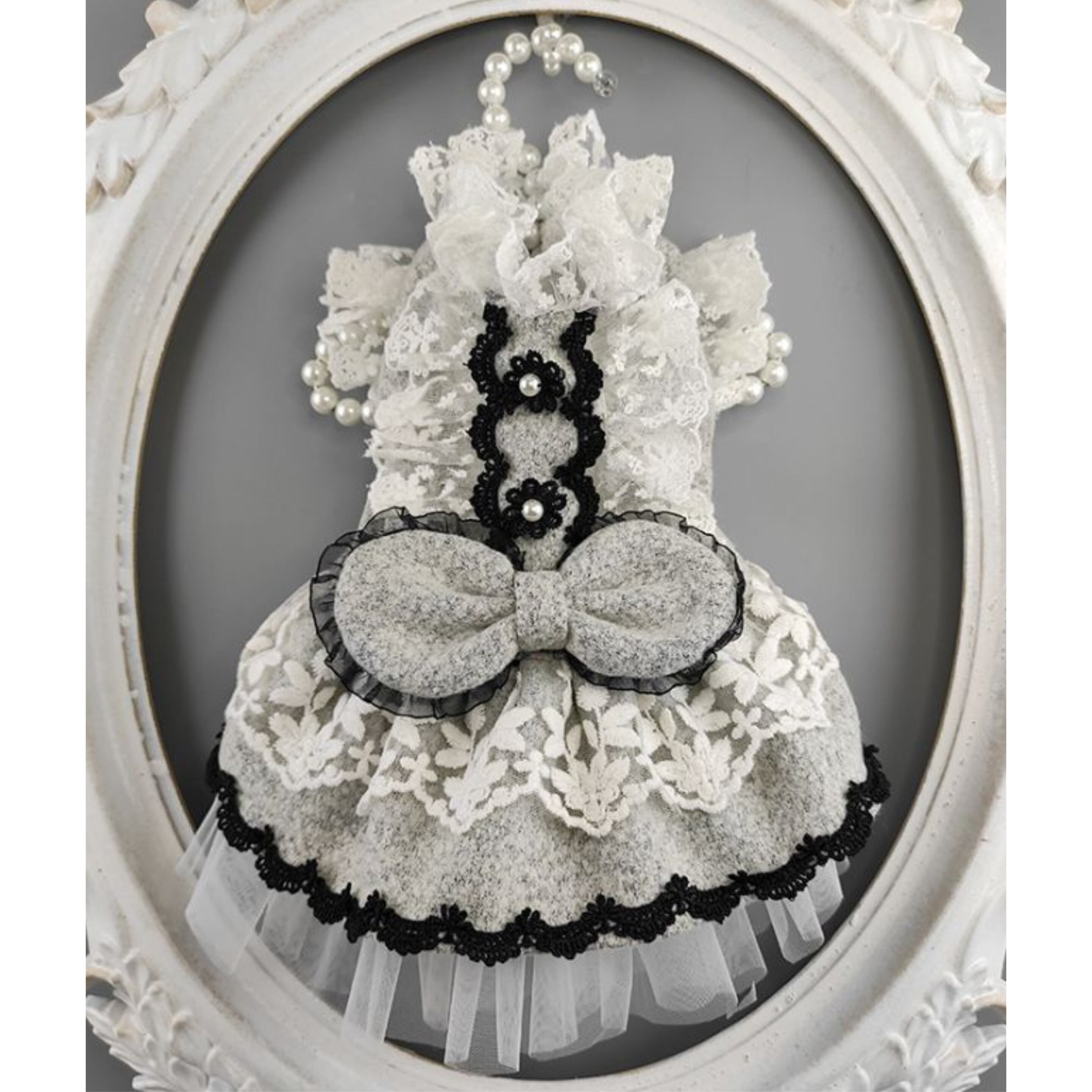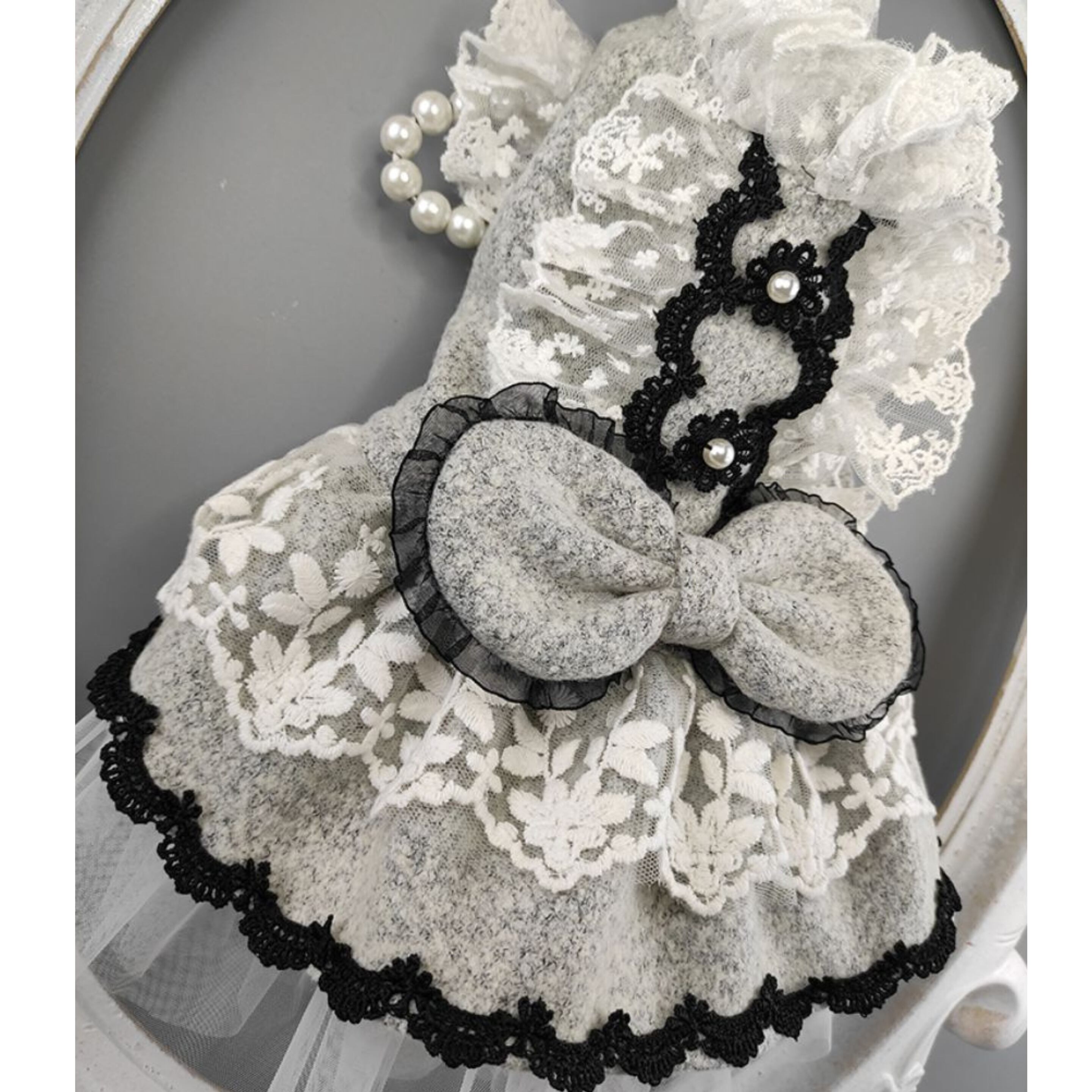 上品なグレーを基調に、ふんだんにあしらったホワイトレースとブラックレースが映えるクラシカルなデザイン。