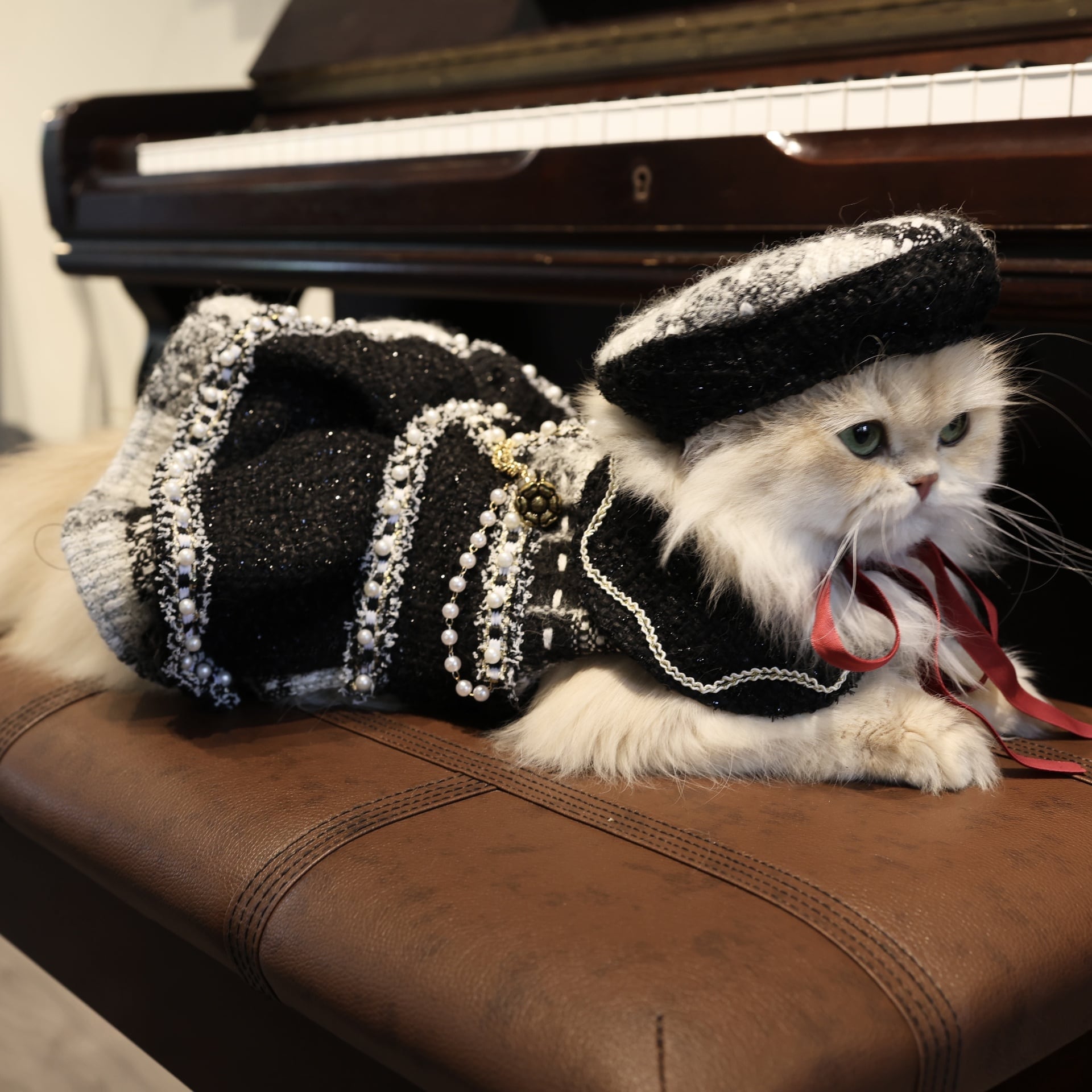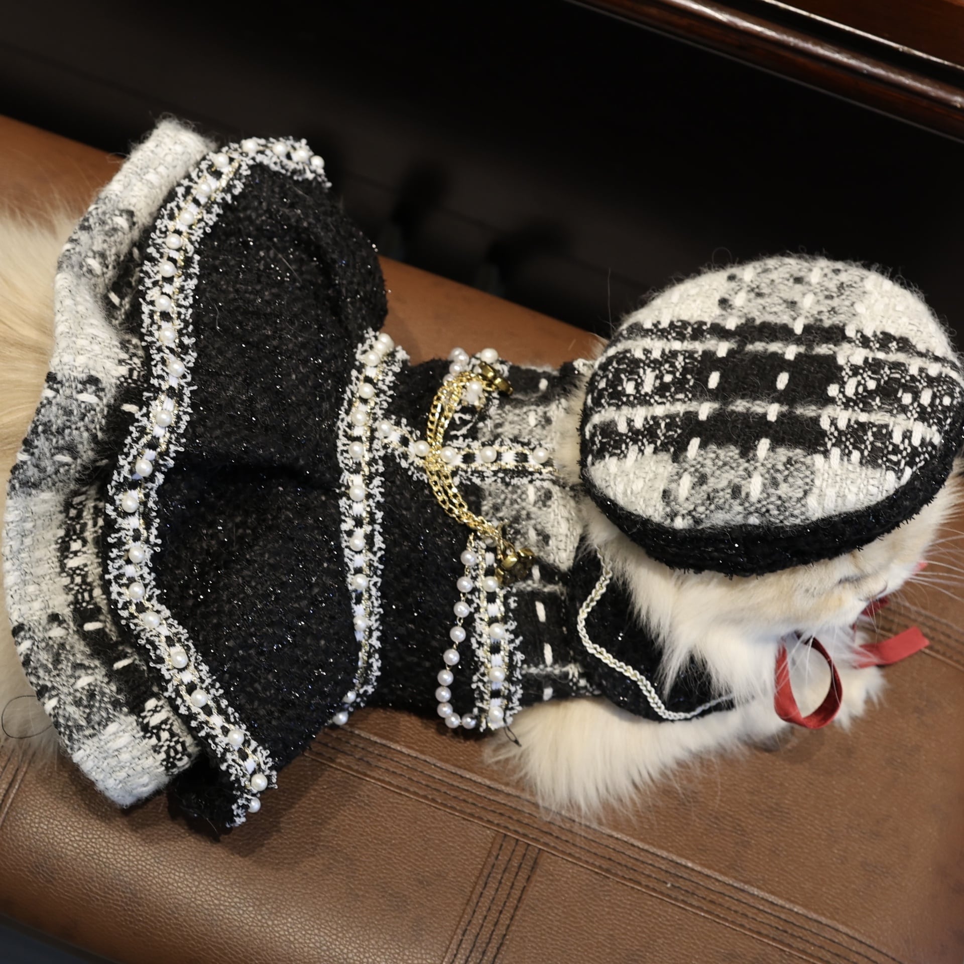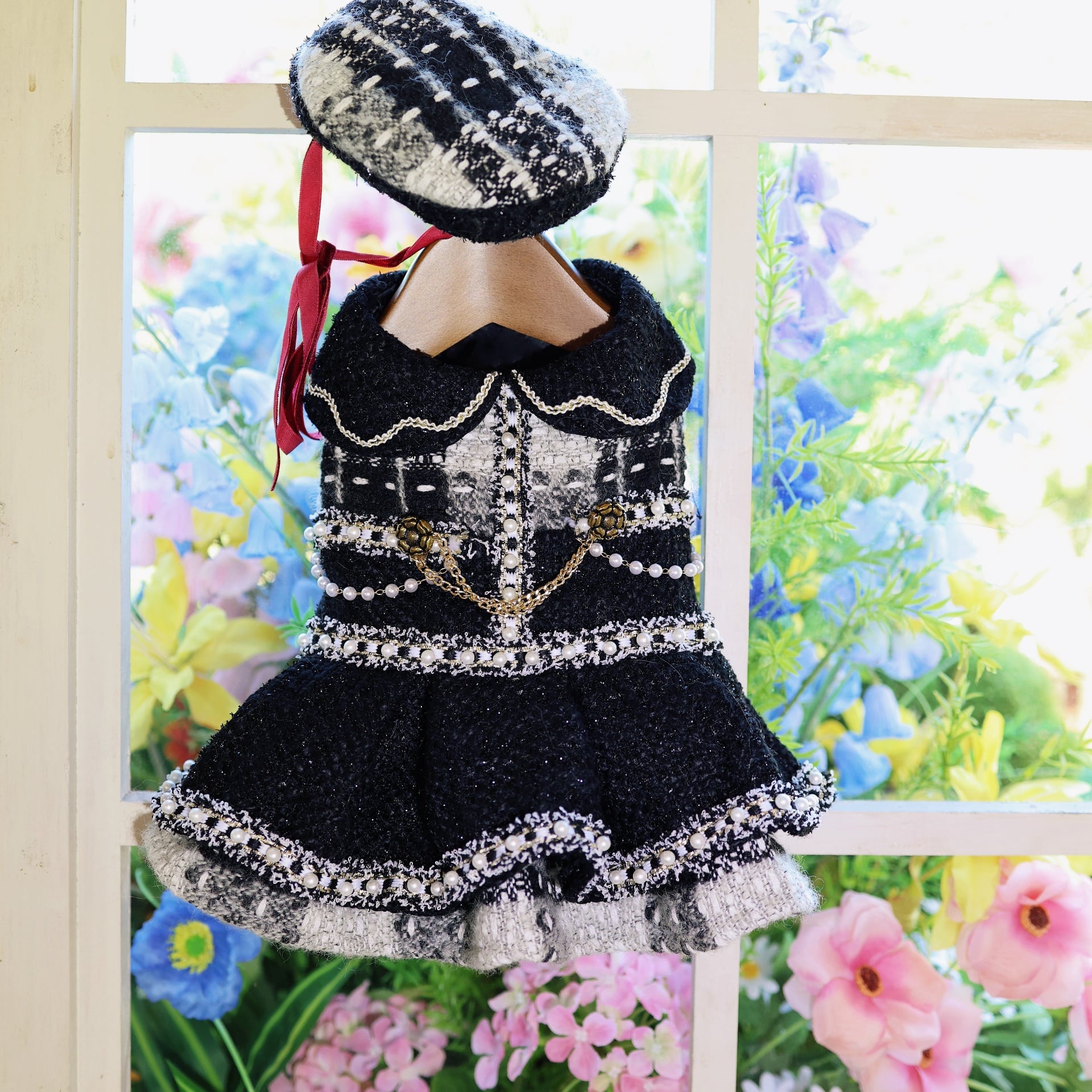 黒ツイード素材にゴールドチェーンやパールがあしらわれ、上品さの中に愛らしさが光ります。
