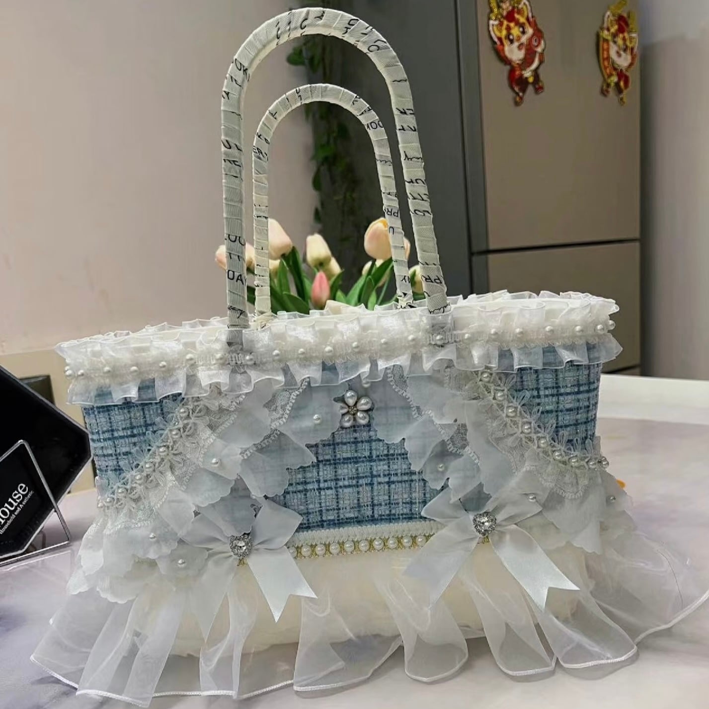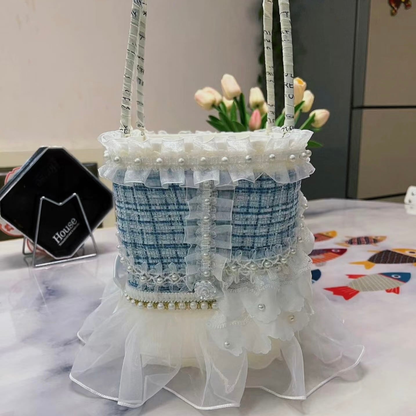 淡いブルーチェックのツイード生地に、繊細なフリルと艶やかなパールを贅沢にあしらったペット用キャリーバッグ。