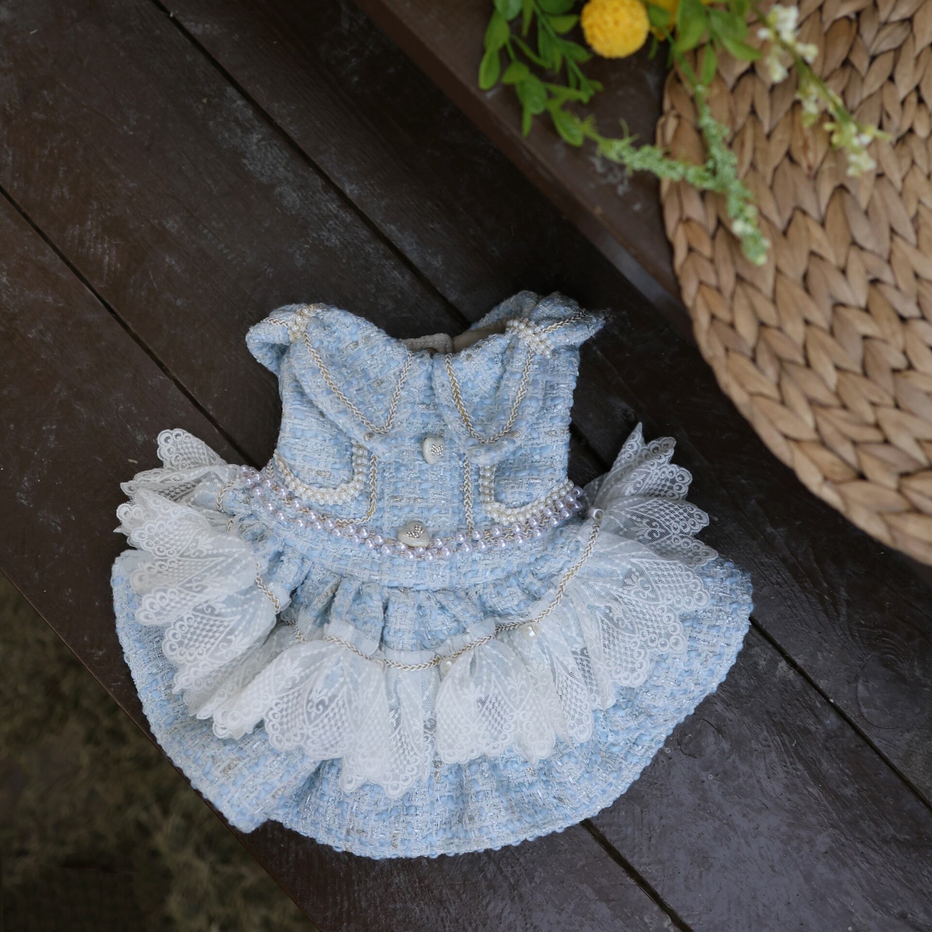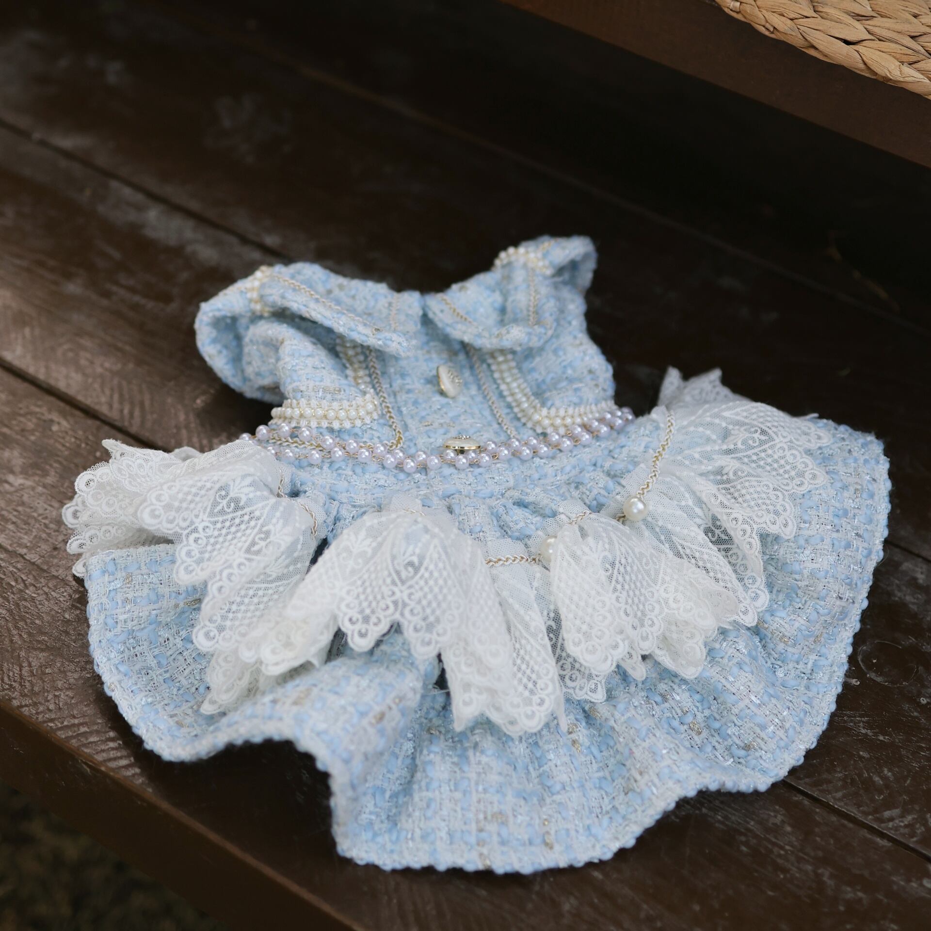 愛らしいわんちゃん・ねこちゃんのために仕立てられた、淡いブルーのツイードワンピース。