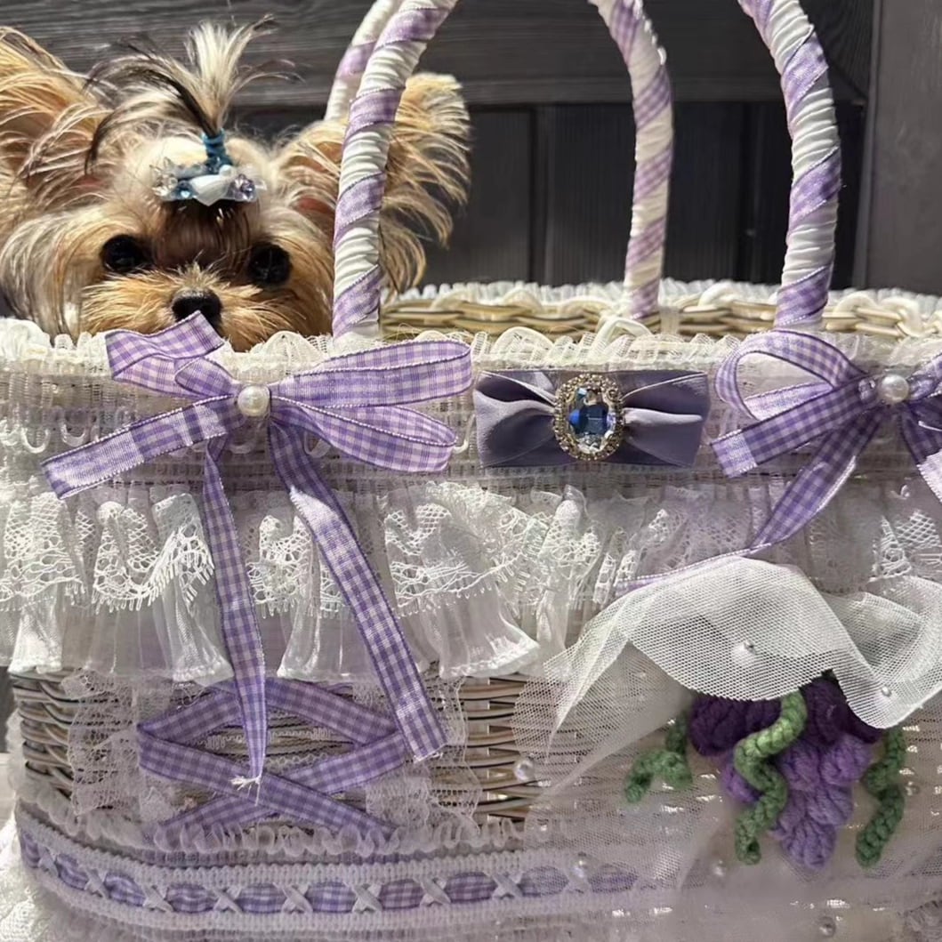 バッグのサイドには編み込み風のデザインと可愛い葡萄のモチーフをあしらい、細部にまでこだわったロマンティックな仕上がり。小型犬や猫ちゃんのお出かけにぴったりで、お写真映えも抜群です。