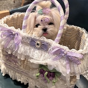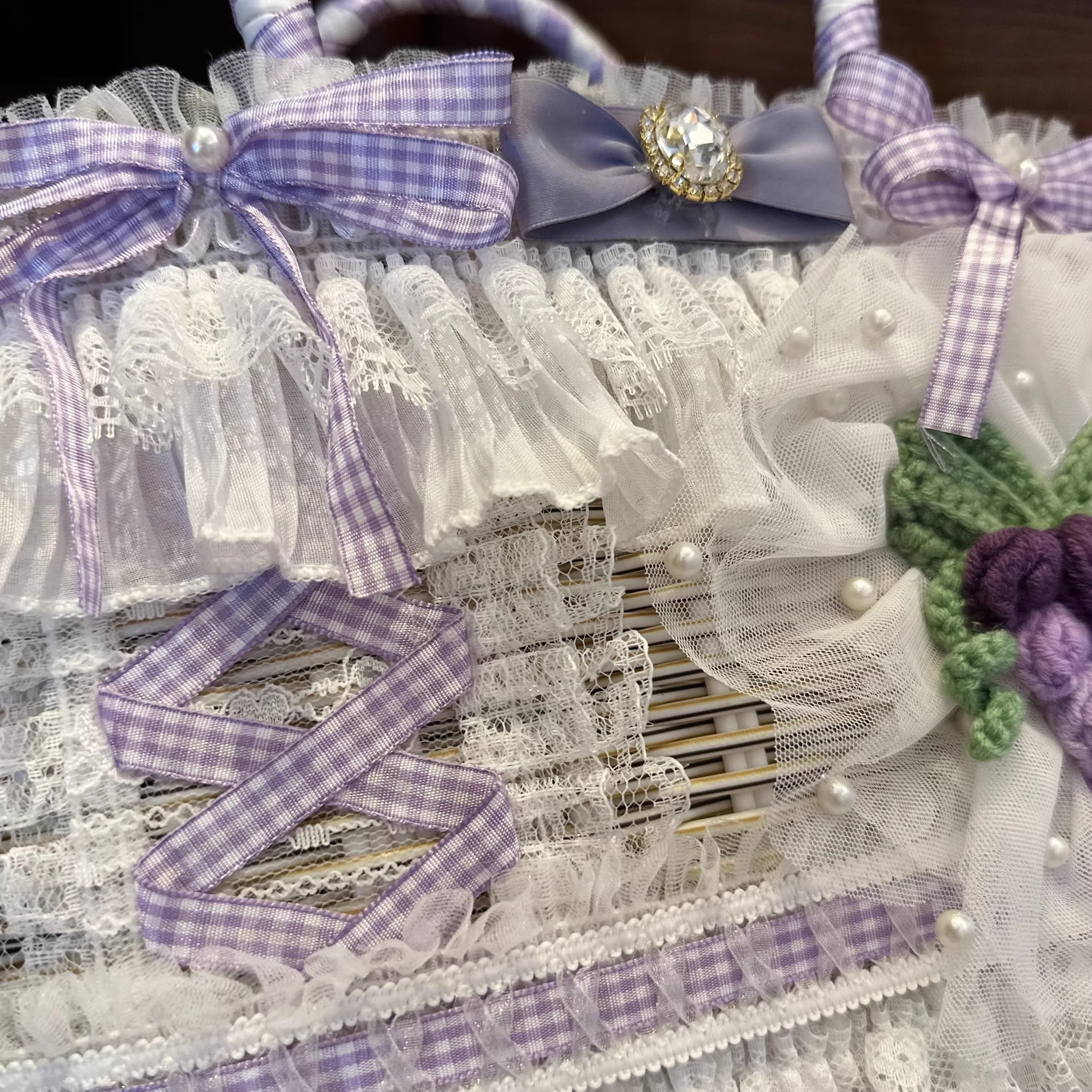 ラベンダーチェックのリボンや大きなサテンリボン、繊細なホワイトレースにたっぷりのフリルを重ねて、ふんわり甘い雰囲気に仕上げました。パールのアクセントやキラキラ輝くブローチが、まるでお姫様のドレスのような華やかさをプラスしてくれます。