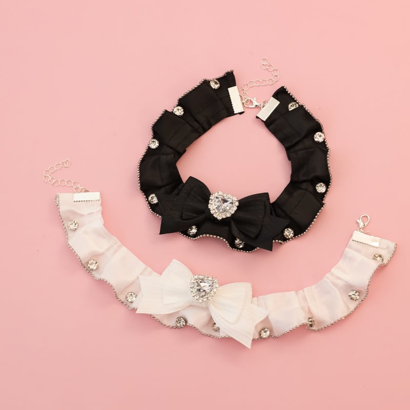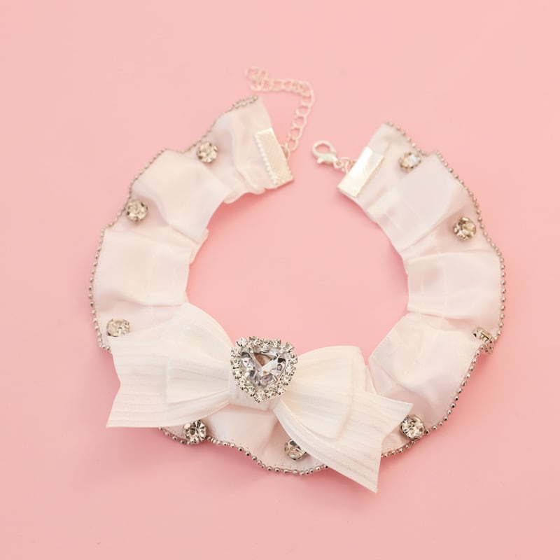 華やかで上品な輝きを放つ、リボンとビジューが主役のペット用チョーカー。