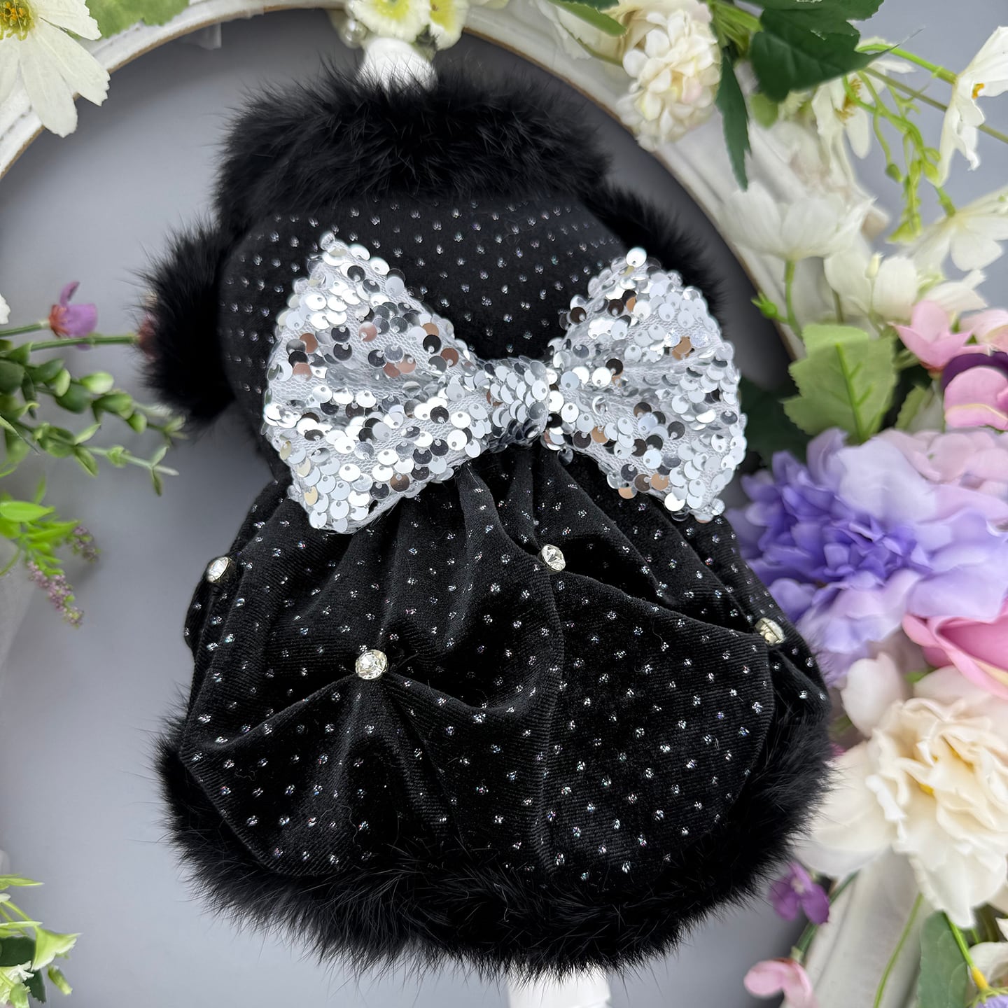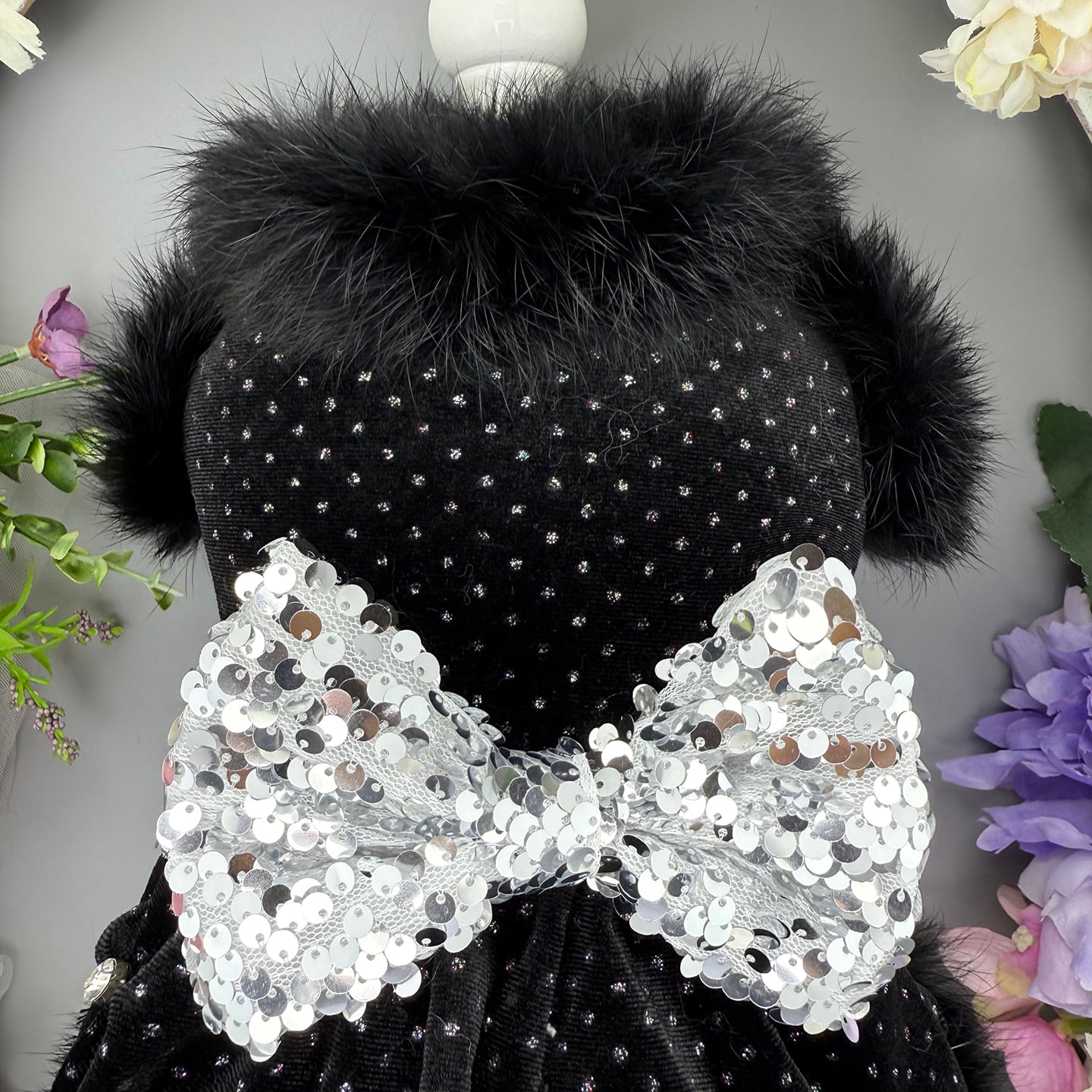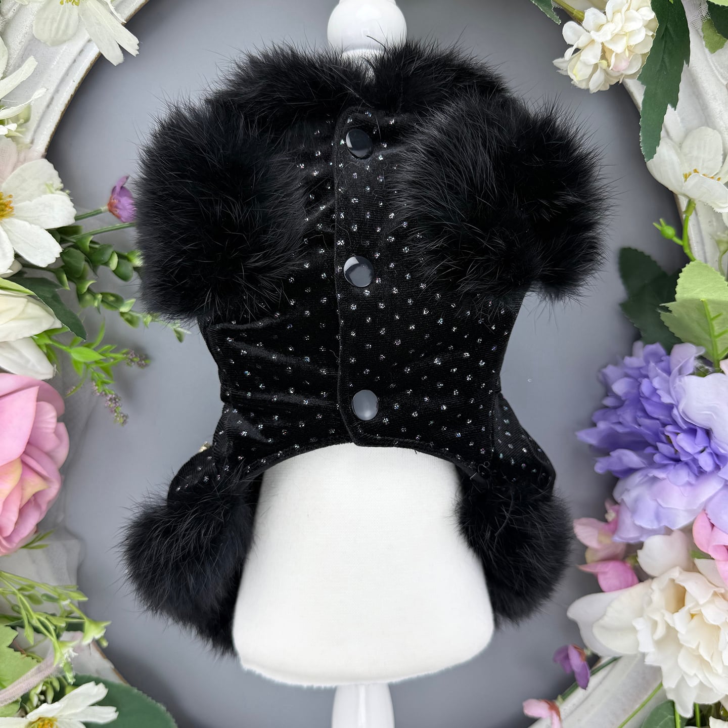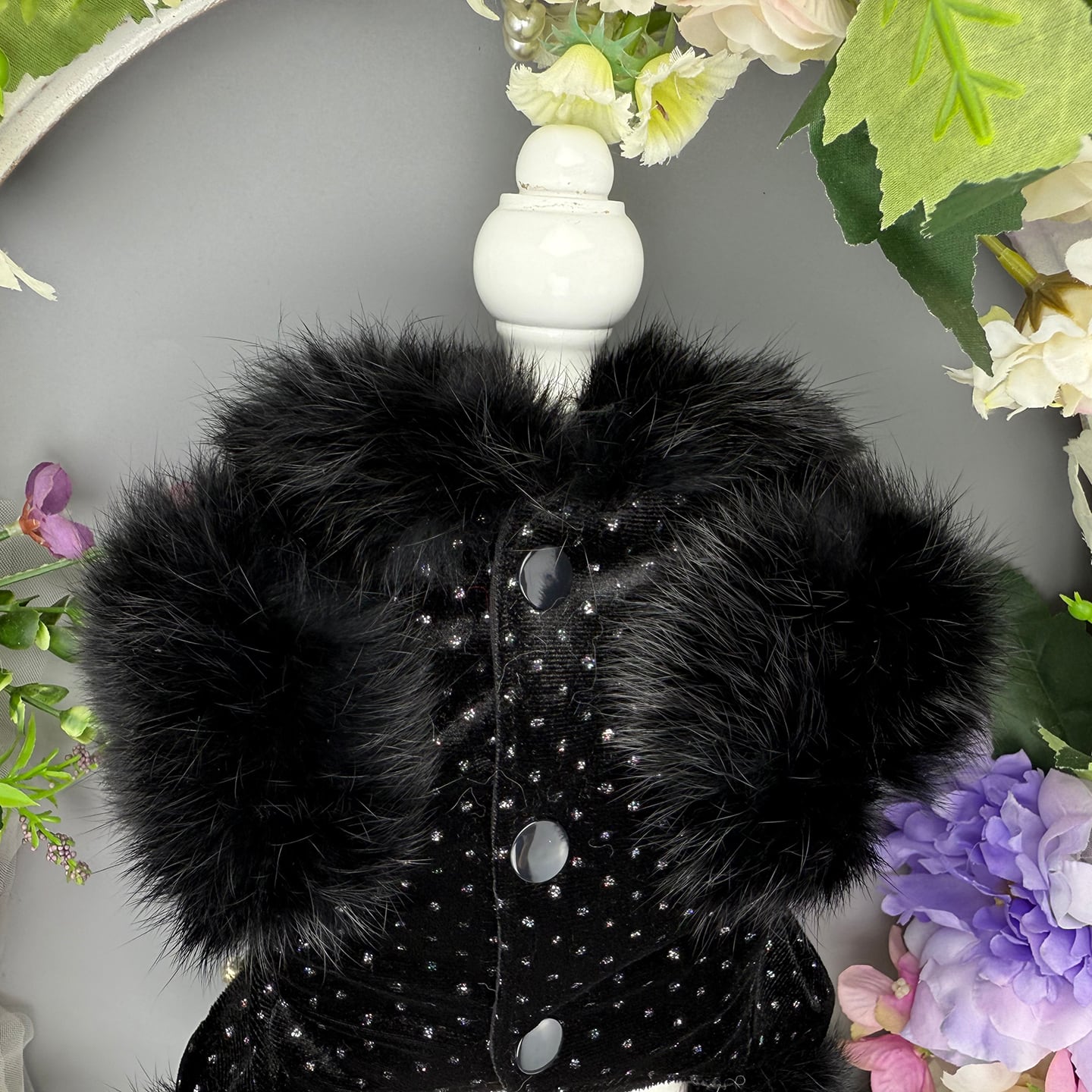 襟元と裾にはふわふわのブラックファーをあしらい、